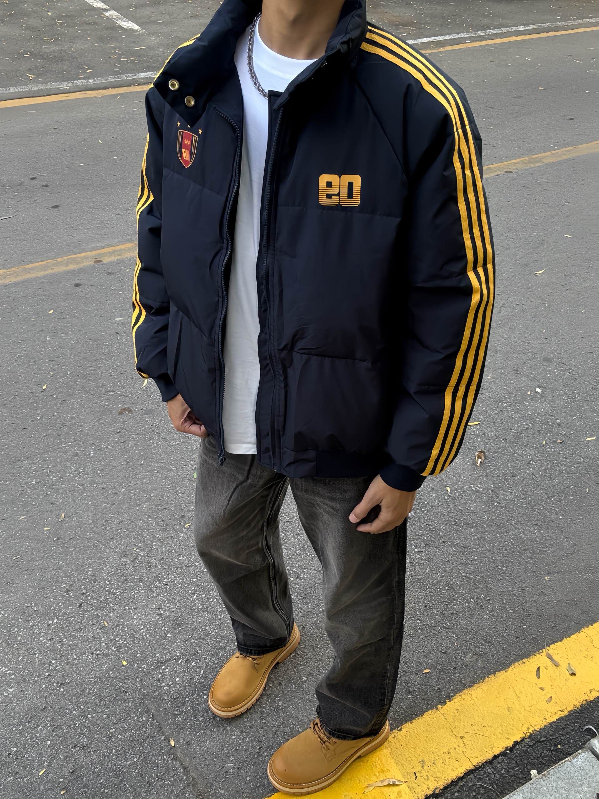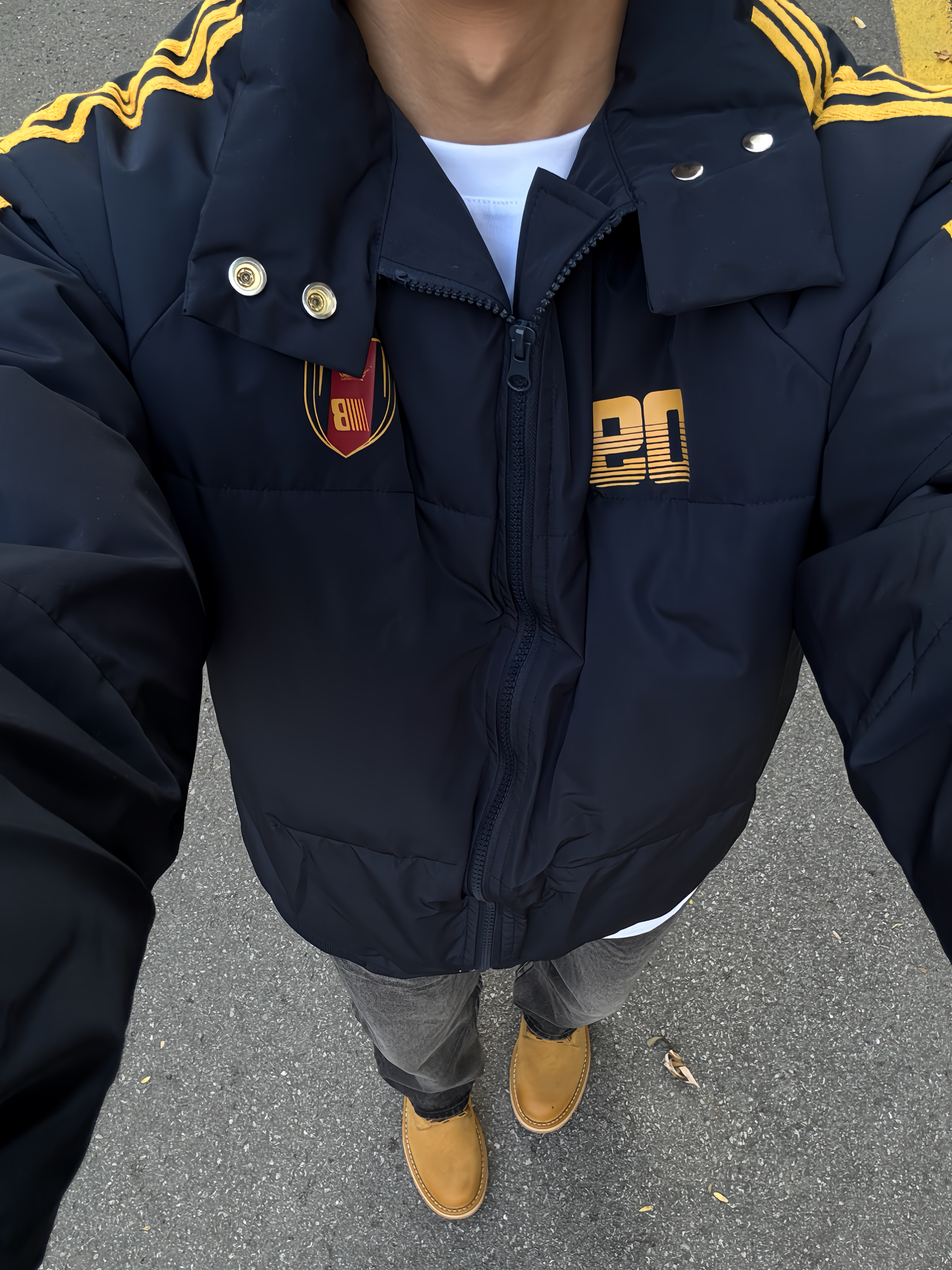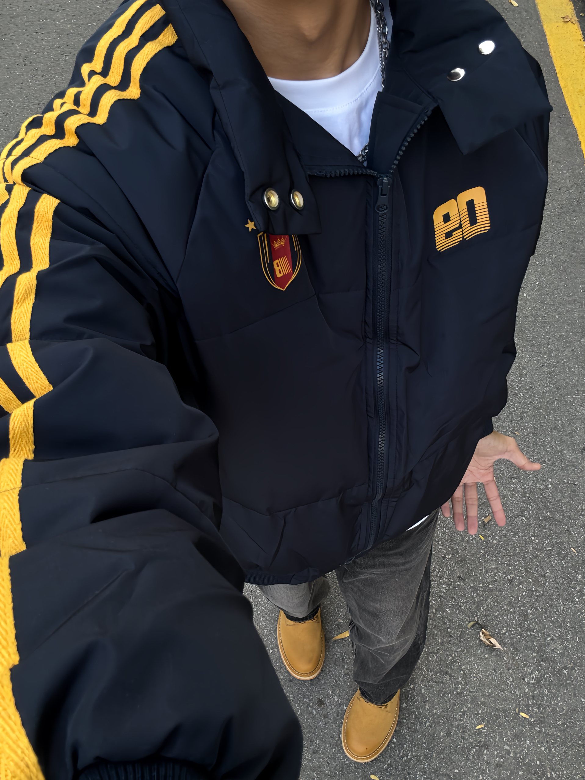 180 130|OOTD穿搭分享 👔|短款条纹棉服,今天一整套的配色都好搭,黄色条纹和logo,入冬总要穿一次亮色衣服吧~短款好适合cleanfit的穿搭,上短下长巨显高显瘦~ 👖|搭配黑牛,直筒版型也好百搭~ 👟|大黄靴和今天搭配太合适啦~