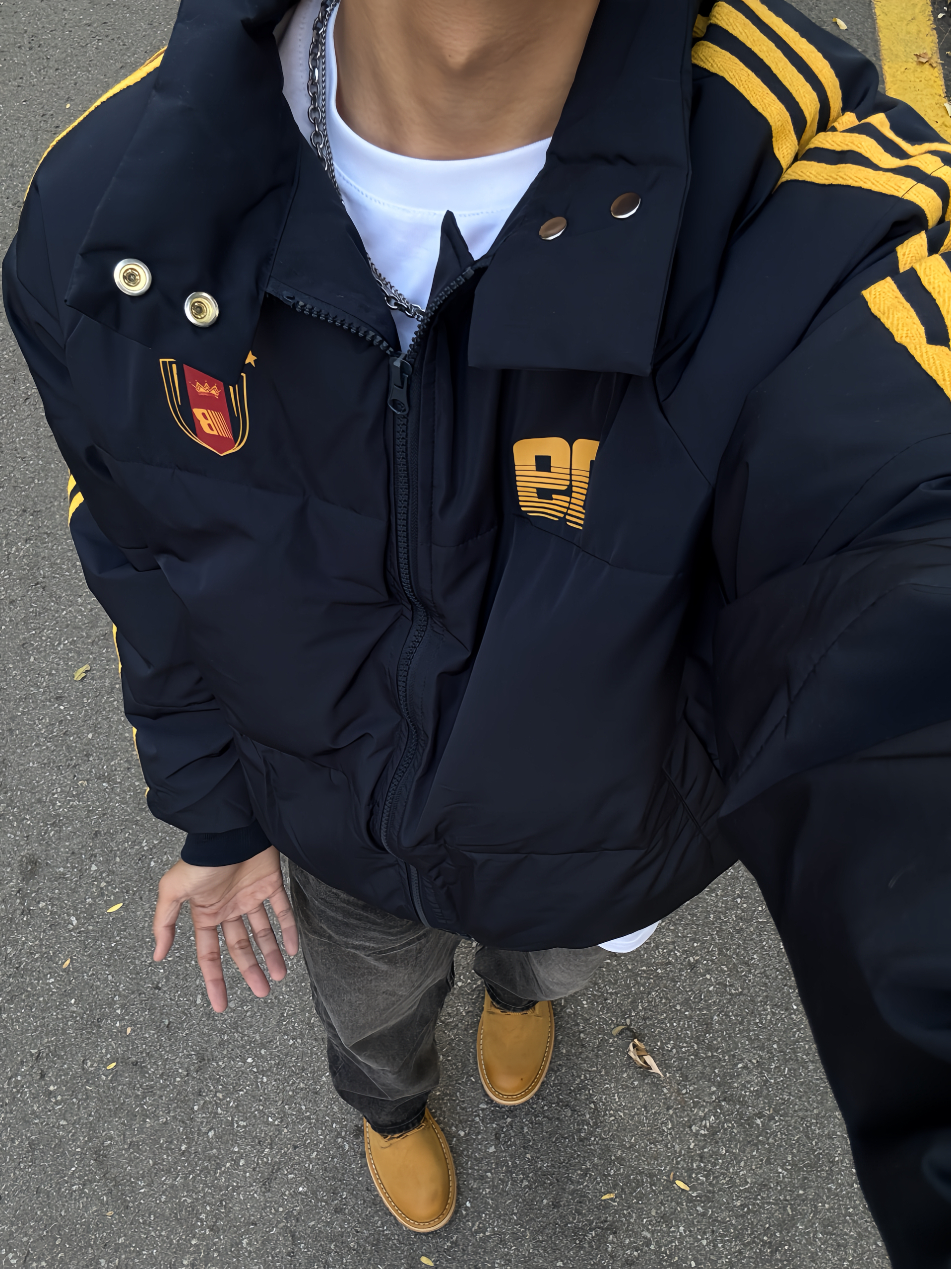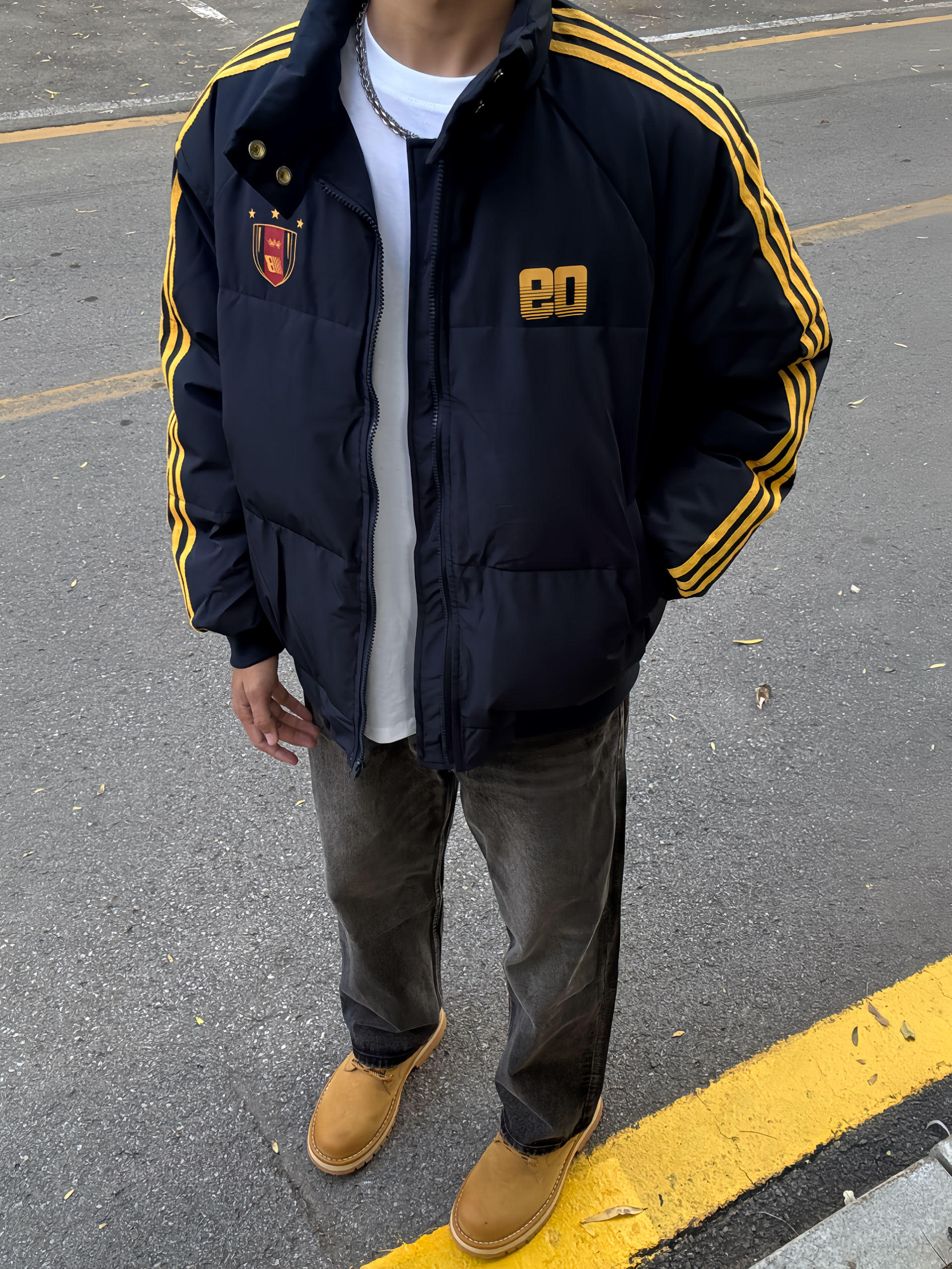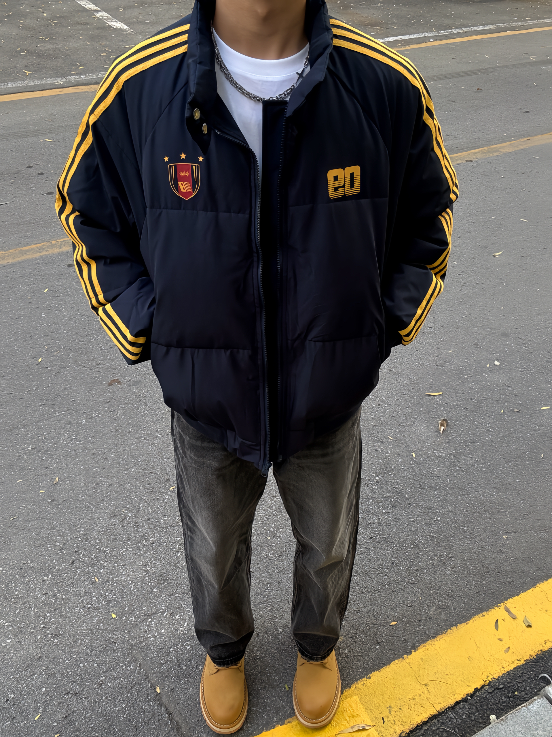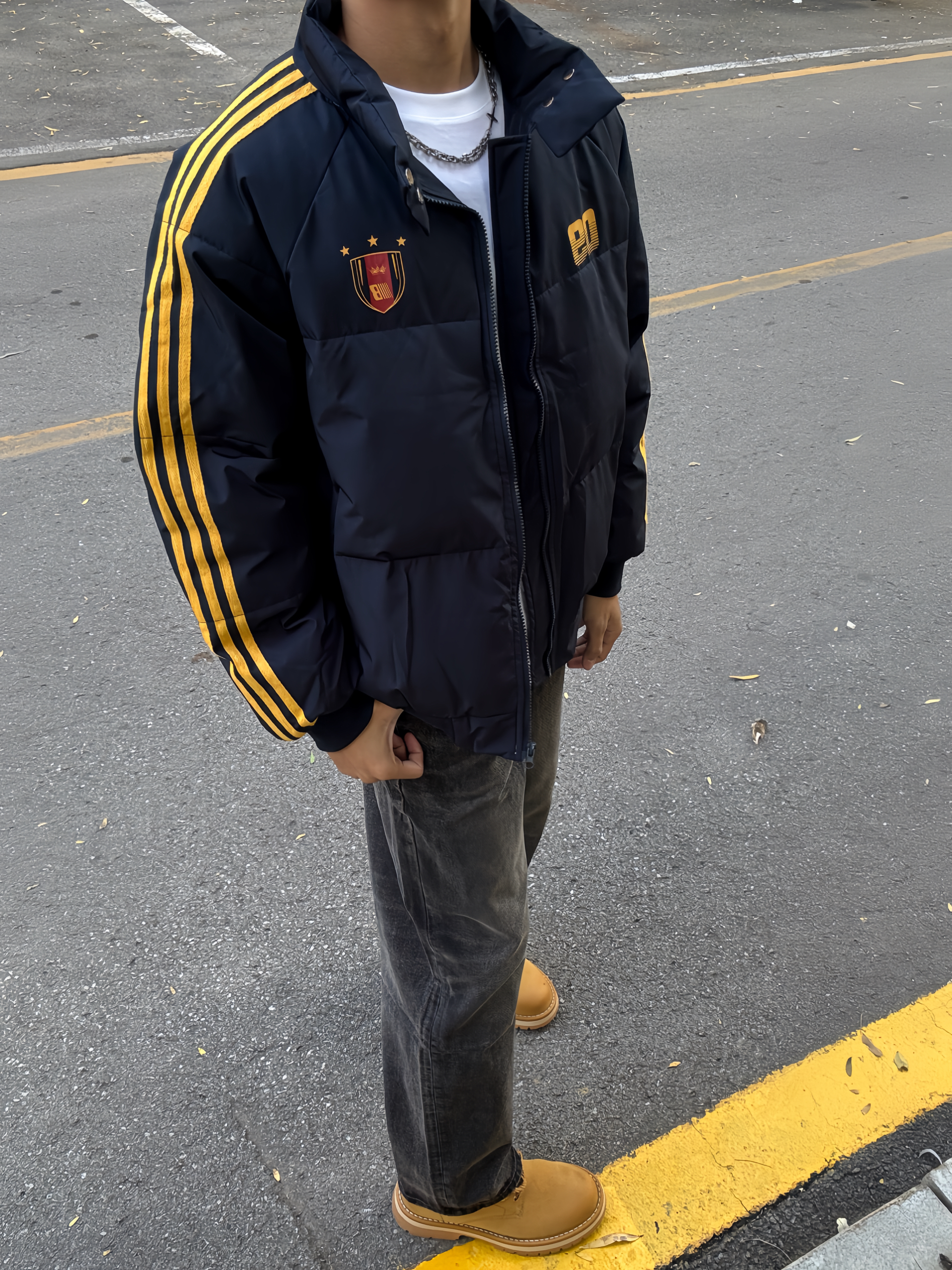 180 130|OOTD穿搭分享 👔|短款条纹棉服,今天一整套的配色都好搭,黄色条纹和logo,入冬总要穿一次亮色衣服吧~短款好适合cleanfit的穿搭,上短下长巨显高显瘦~ 👖|搭配黑牛,直筒版型也好百搭~ 👟|大黄靴和今天搭配太合适啦~