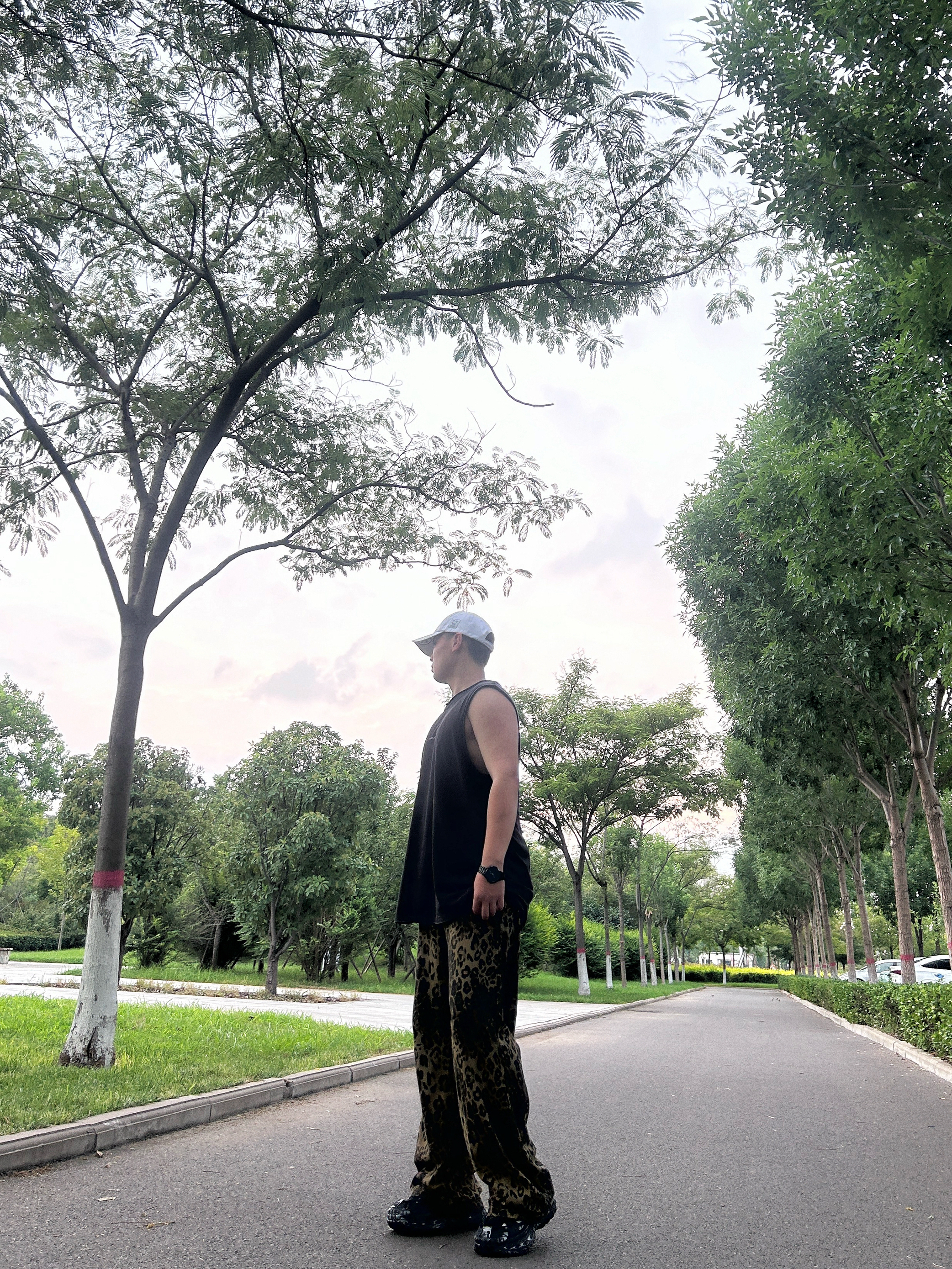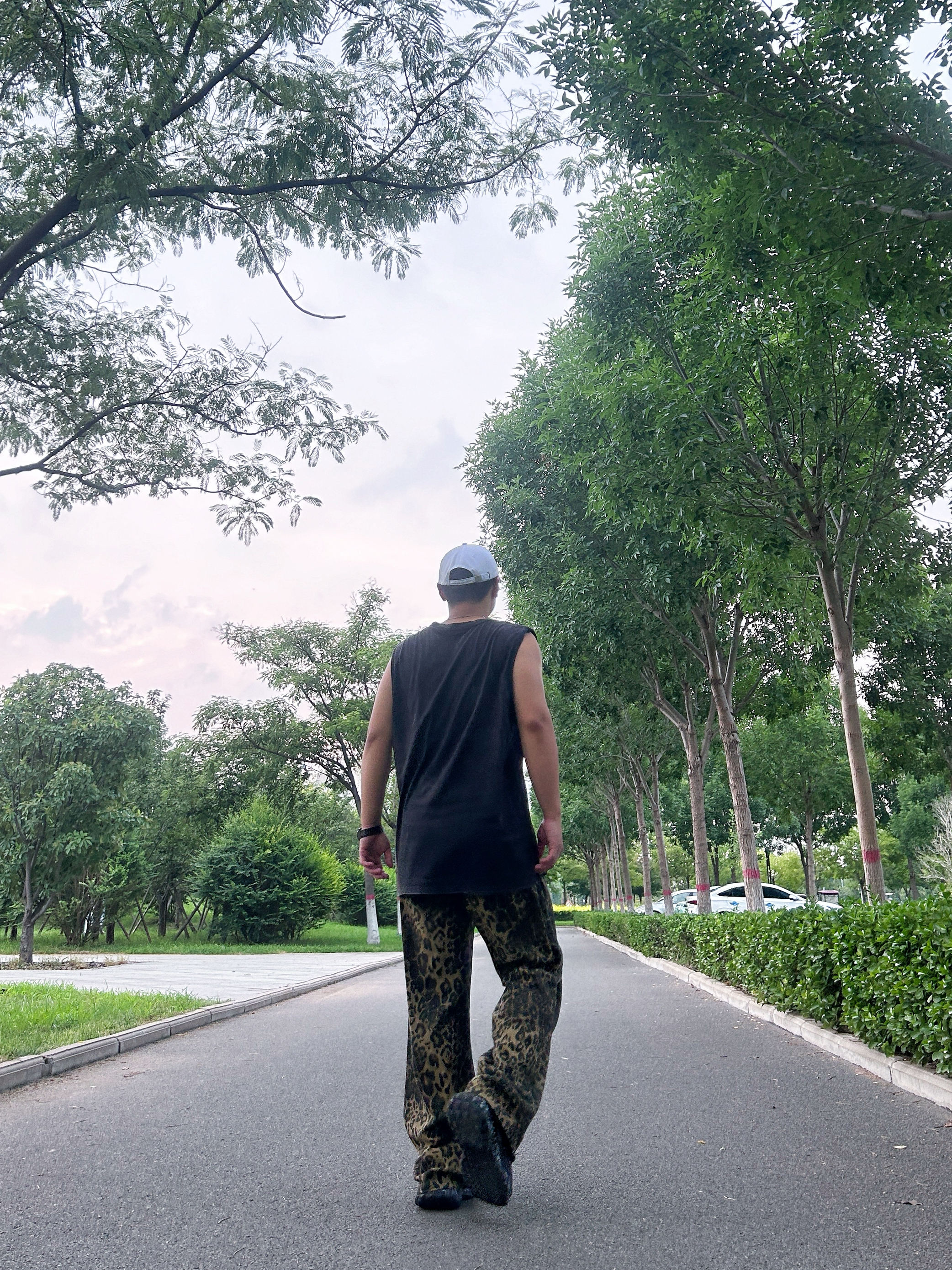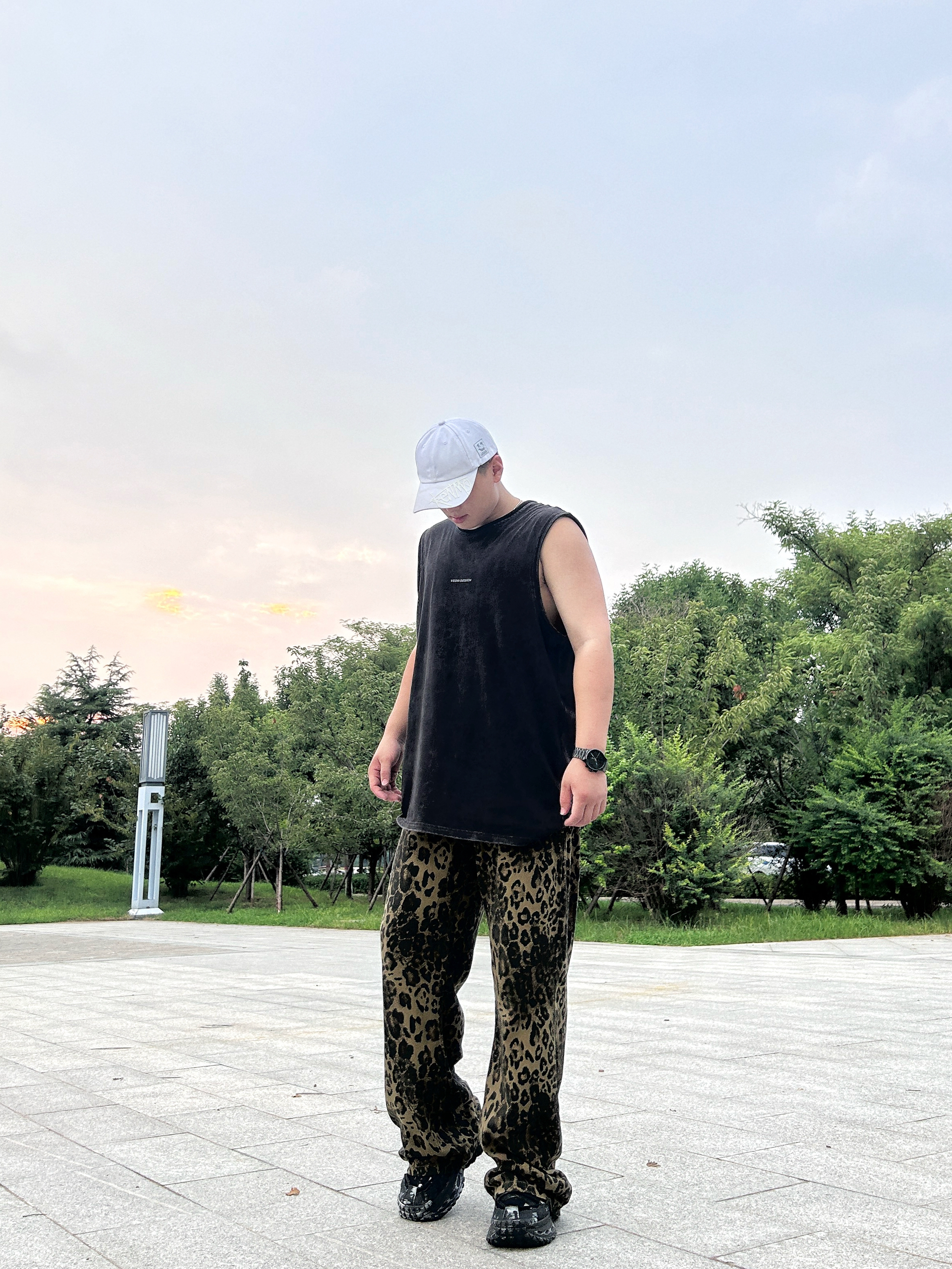 新生出街,你会怎么选? 美式黑色T恤搭配豹纹长裤 穿着休闲的慵懒感 下面上脚一双平底板鞋 出街也是会有底气的 首选的时尚单品 酷酷安排了