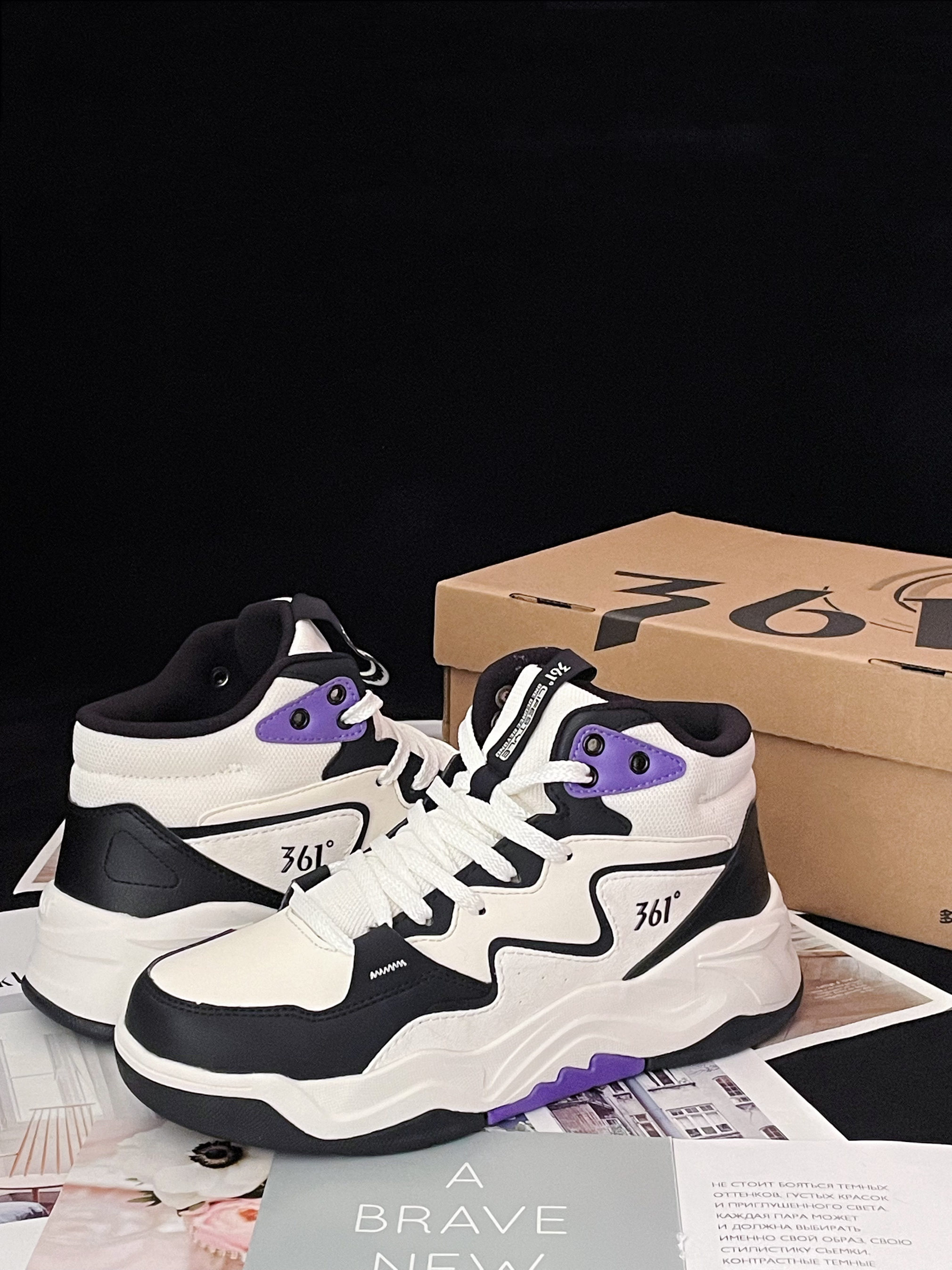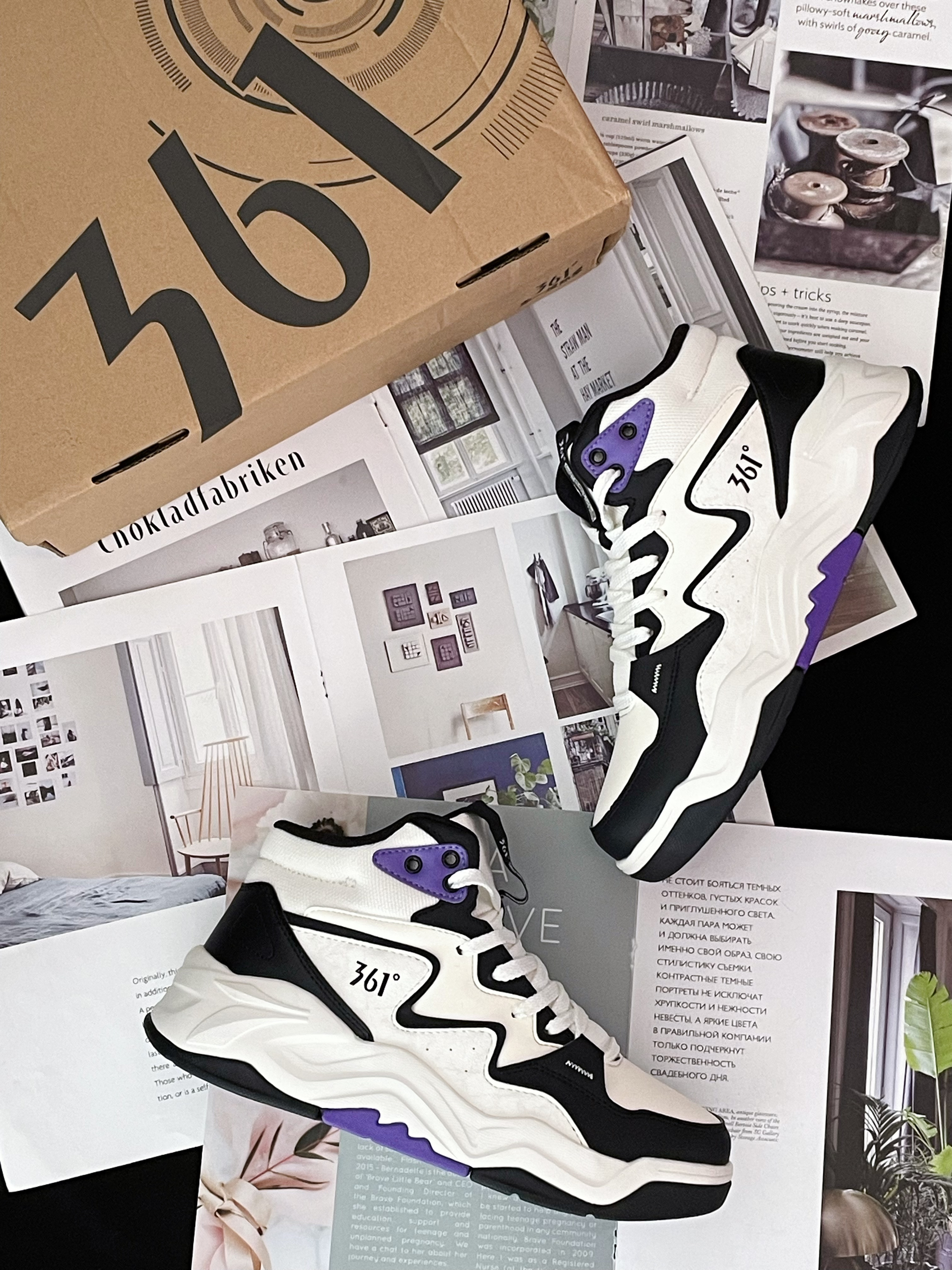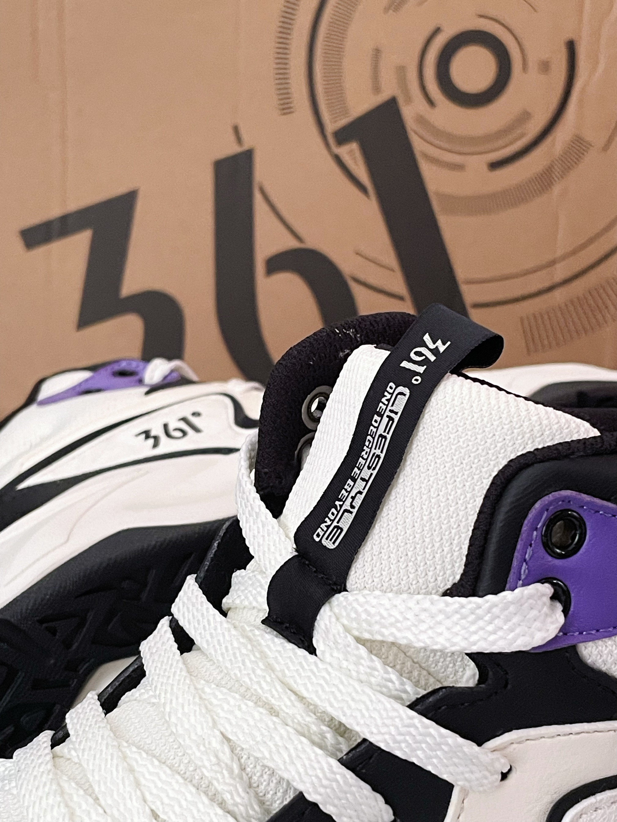 今天给大家分享这双 361° 『黑白紫』加绒高帮板鞋 鞋款由经典的黑白为主色调 细节部分加入了紫色💜点缀 配色时尚简约百搭 更显高级感 皮革拼接的鞋面搭配上高帮的鞋型 整体的包裹性和贴合度不错~ 内里的加绒设计更适合秋冬季节 厚实的泡面中底脚感软弹舒适轻便 还有很不错的增高效果呢~ ⚠️尺码方面不偏码 建议正码选择