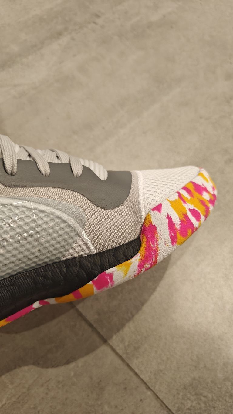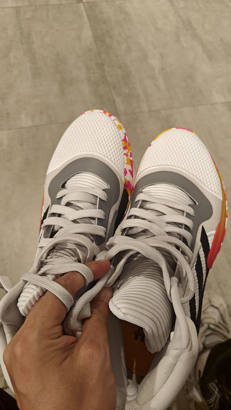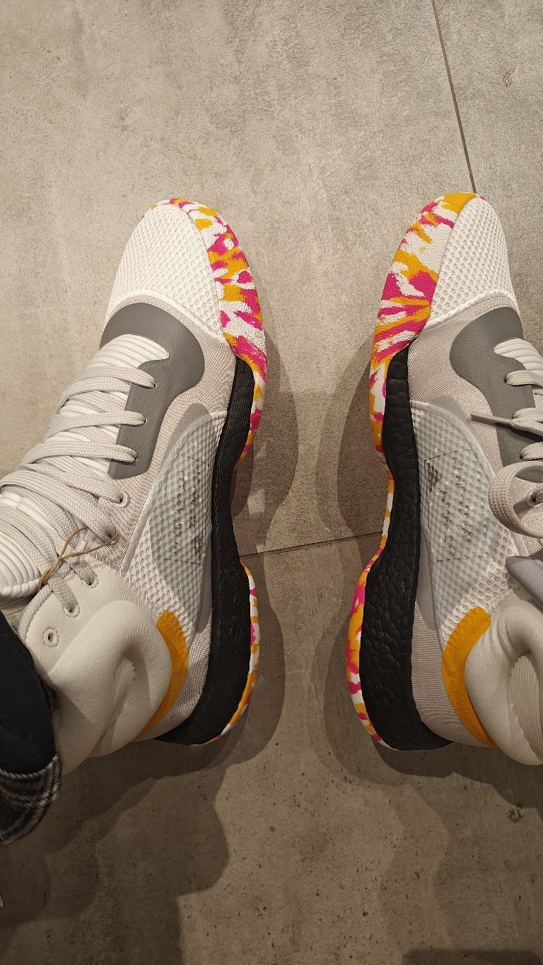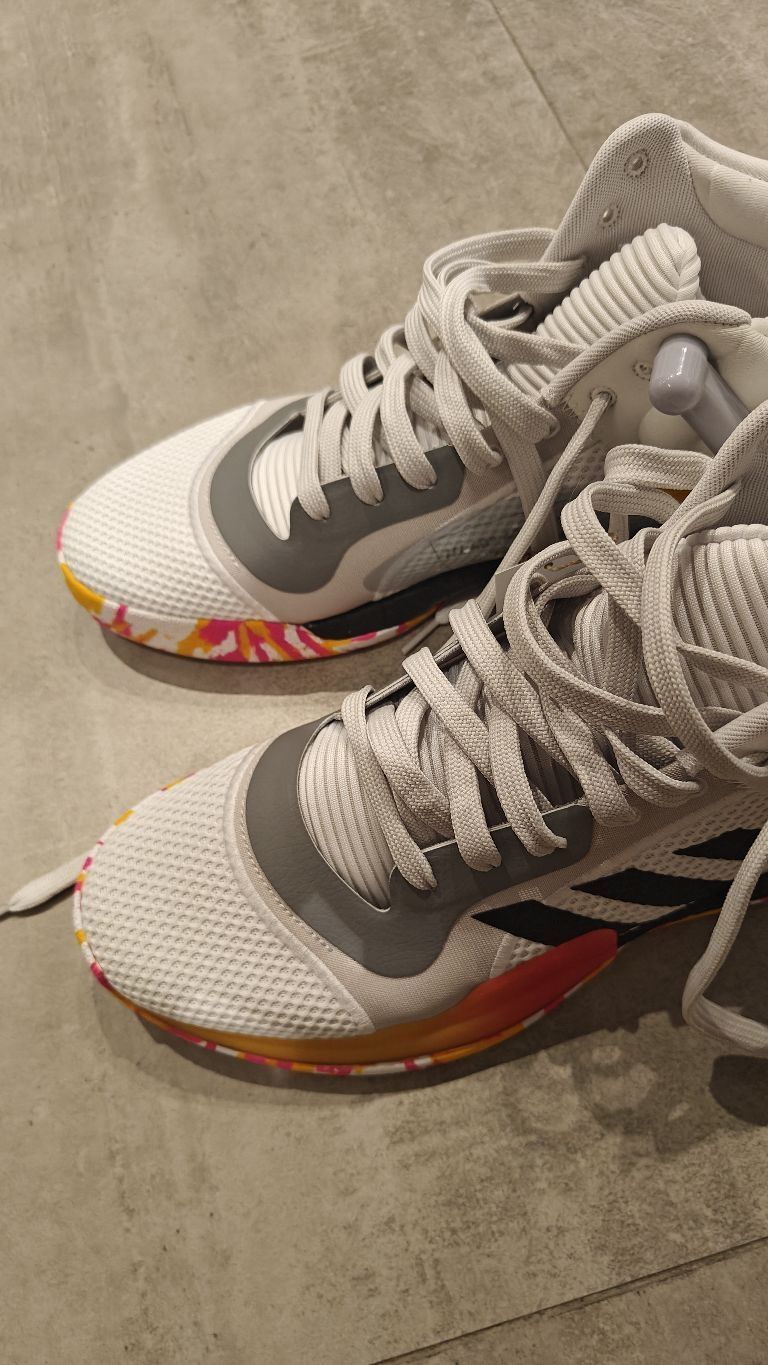 今天入手一双adidas Marquee Boost 黑白炫彩款,一代神鞋已经降为白菜价了,来感受感受这款诸多球星在实战比赛中非常钟爱的神鞋。 鞋面采用的primeknit轻量织面材质,鞋子的贴合感不错,前脸和侧帮都有大面积的网眼,透气性很好,设计感十足。前掌外侧有一块不大的tpu加固 防止侧翻扭脚,鞋底中帮有大块阿迪达斯经典爆米花材质的减震,弹性很强,回馈力十足。鞋底我这款是一个橡胶底,非常亮眼...