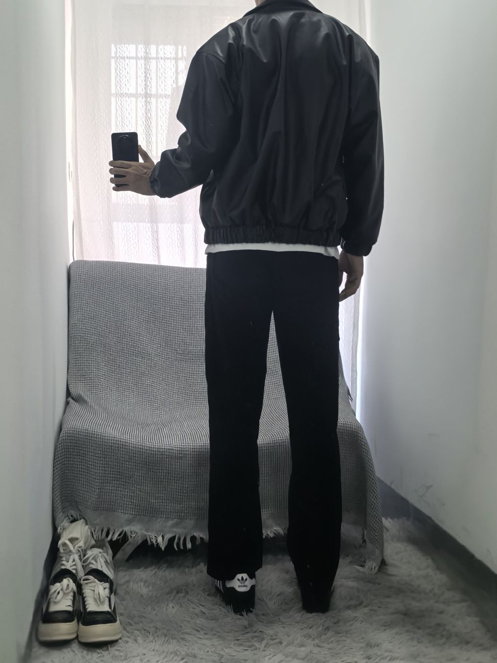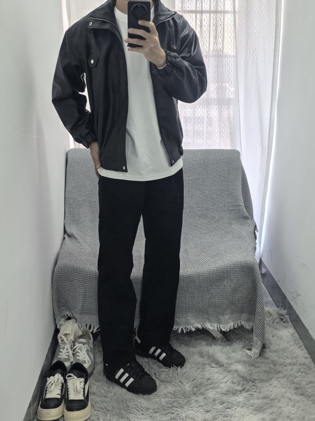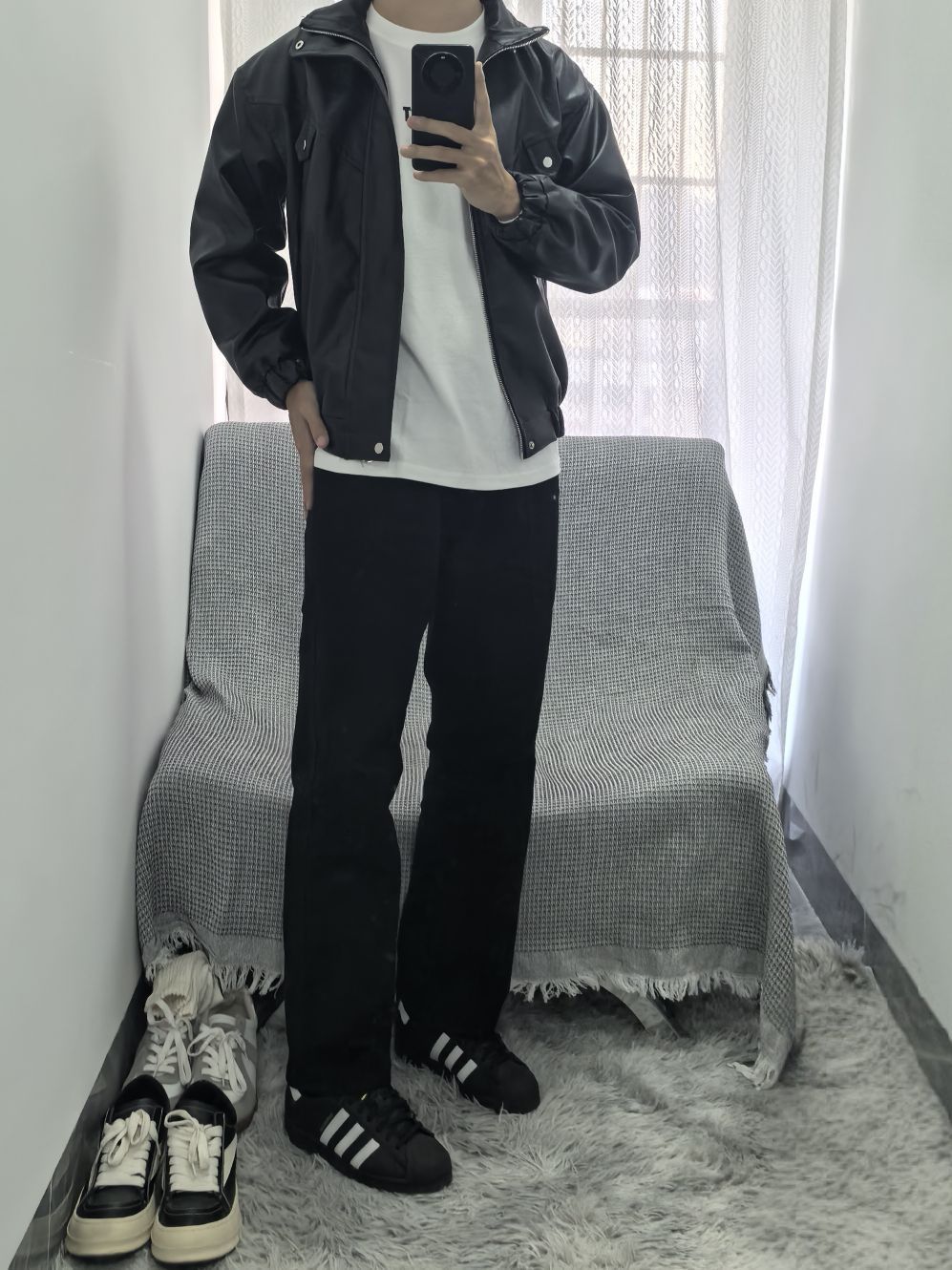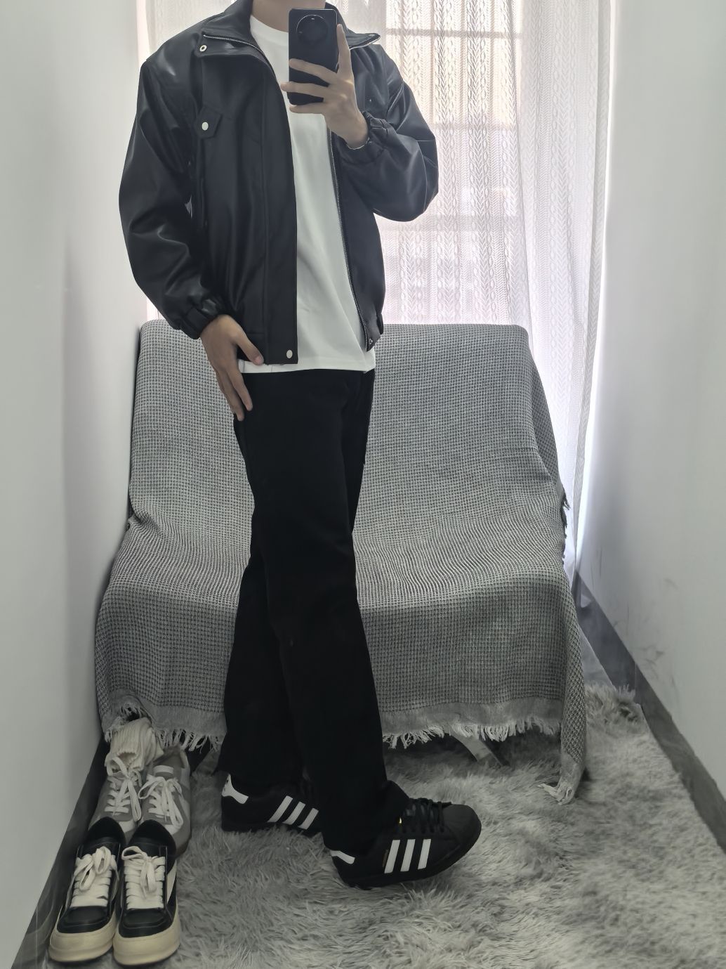 身高|体重:178cm/80kg 上衣:复古机车夹克,Pu皮材质纹理清晰;袖口下摆均松紧设计防风又保暖;柳钉点缀排扣口袋;上身舒服不臃肿别提有多帅 下装:直筒多口袋工装裤,三遍水洗工艺更加固色;加宽弹力腰围舒适不卡腰;立体剪裁拼接设计,加上纯棉加成上身更是帅帅气气舒舒服服 鞋子:百搭贝壳头,不挑裤型