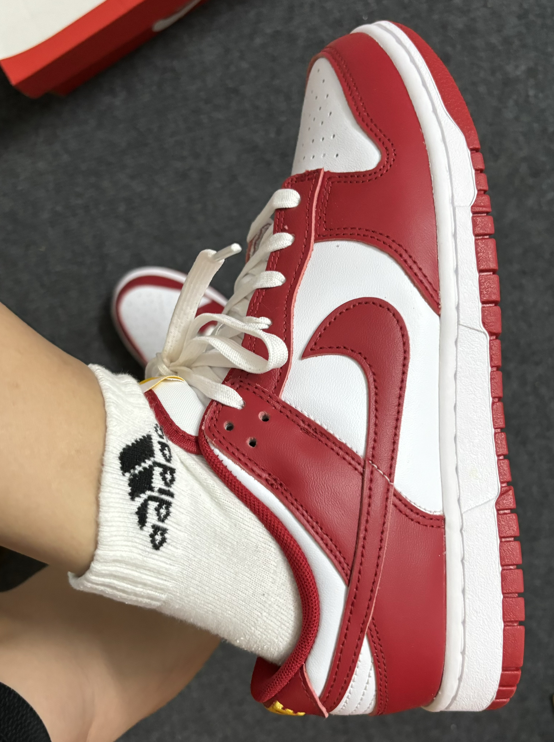 白红配色真的太绝了 红红的超喜庆的 皮革的鞋面质感很不错 脚感穿着比较一般 追求脚感不建议 追求颜值还是很不错的