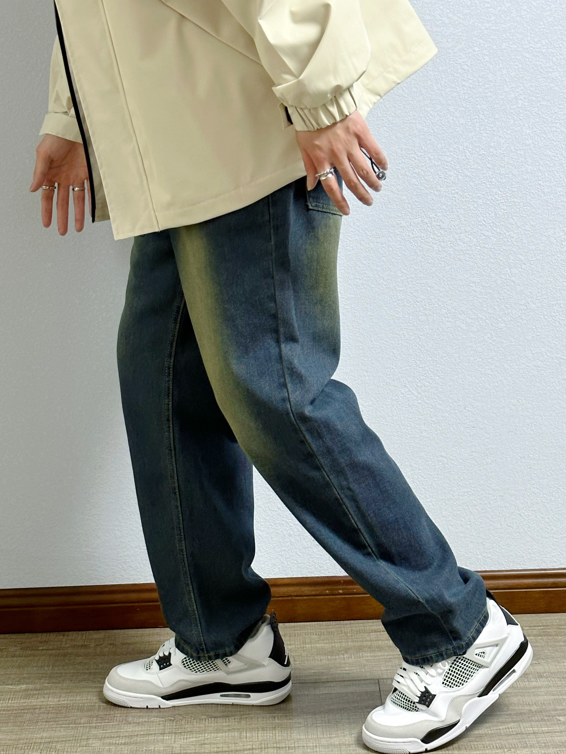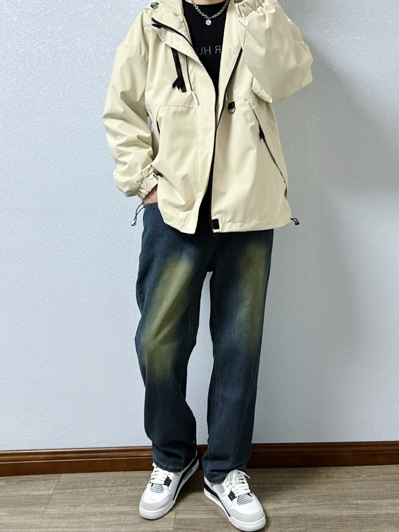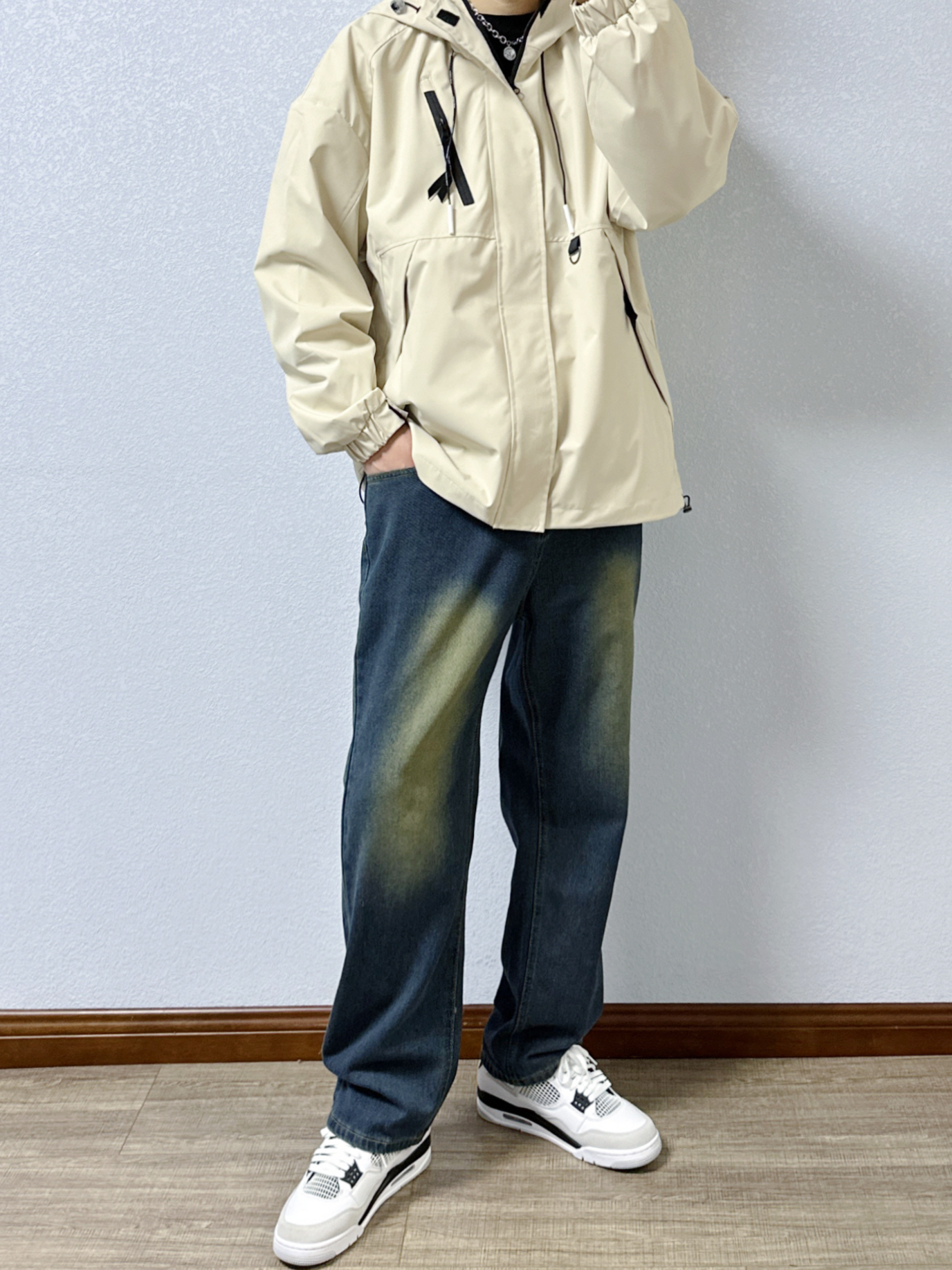 🐳:185 65 宝子们好呀, 秋冬出行当然少不了冲锋衣, 今天是秋冬户外风男生穿搭, 衣服是迈特优的杏色冲锋衣外套搭黑色卫衣, 搭配蓝色做旧牛仔裤, 白色运动长袜搭配黑白配色球鞋, 出街回头率up~