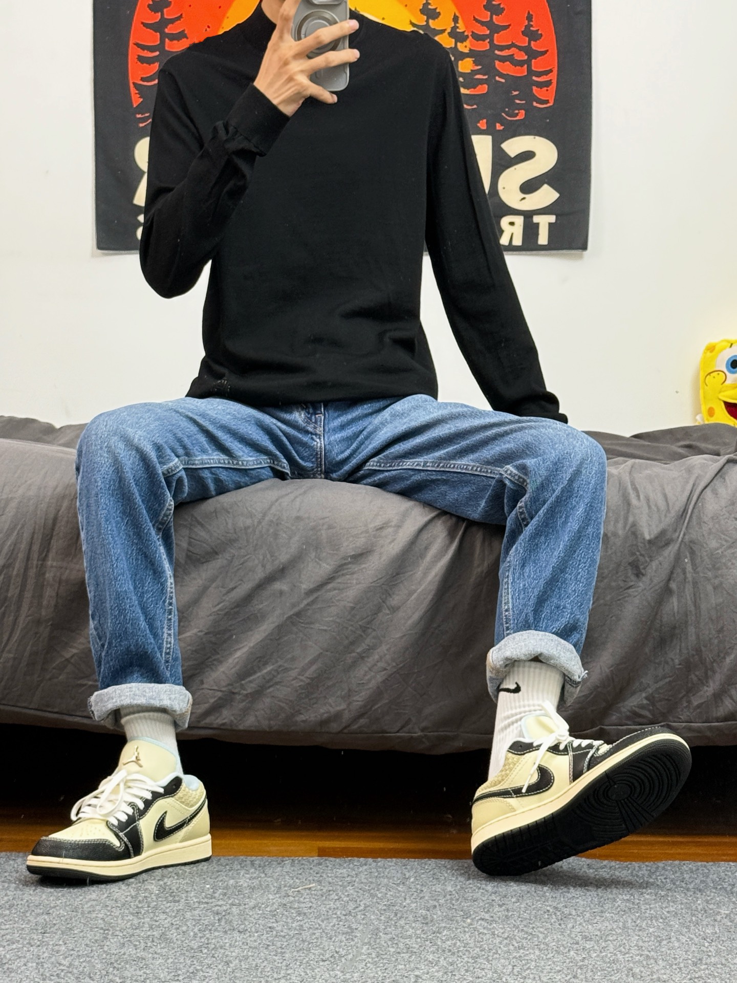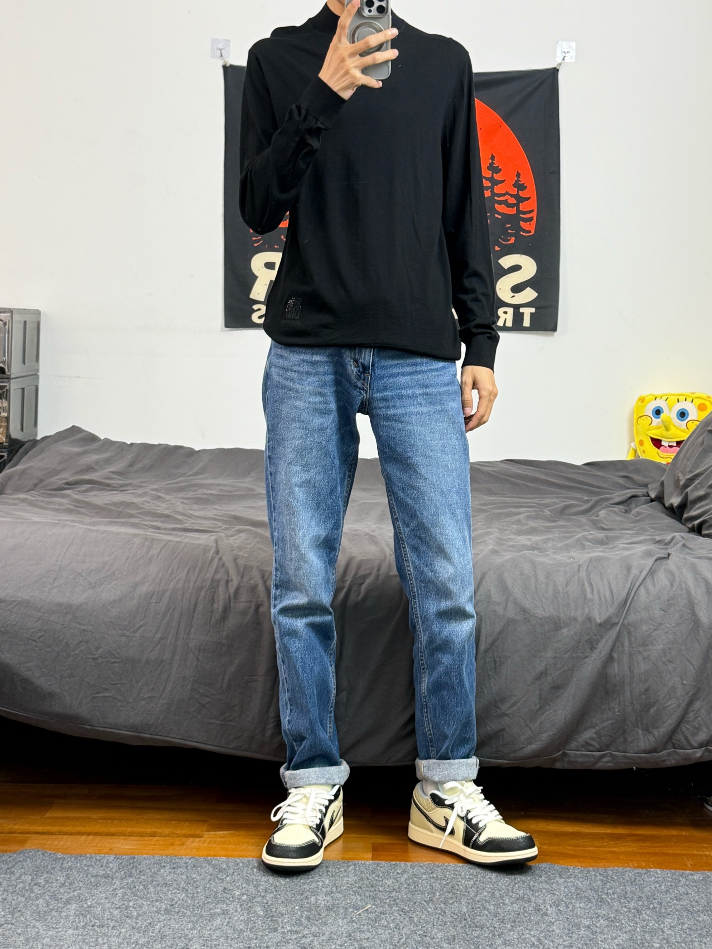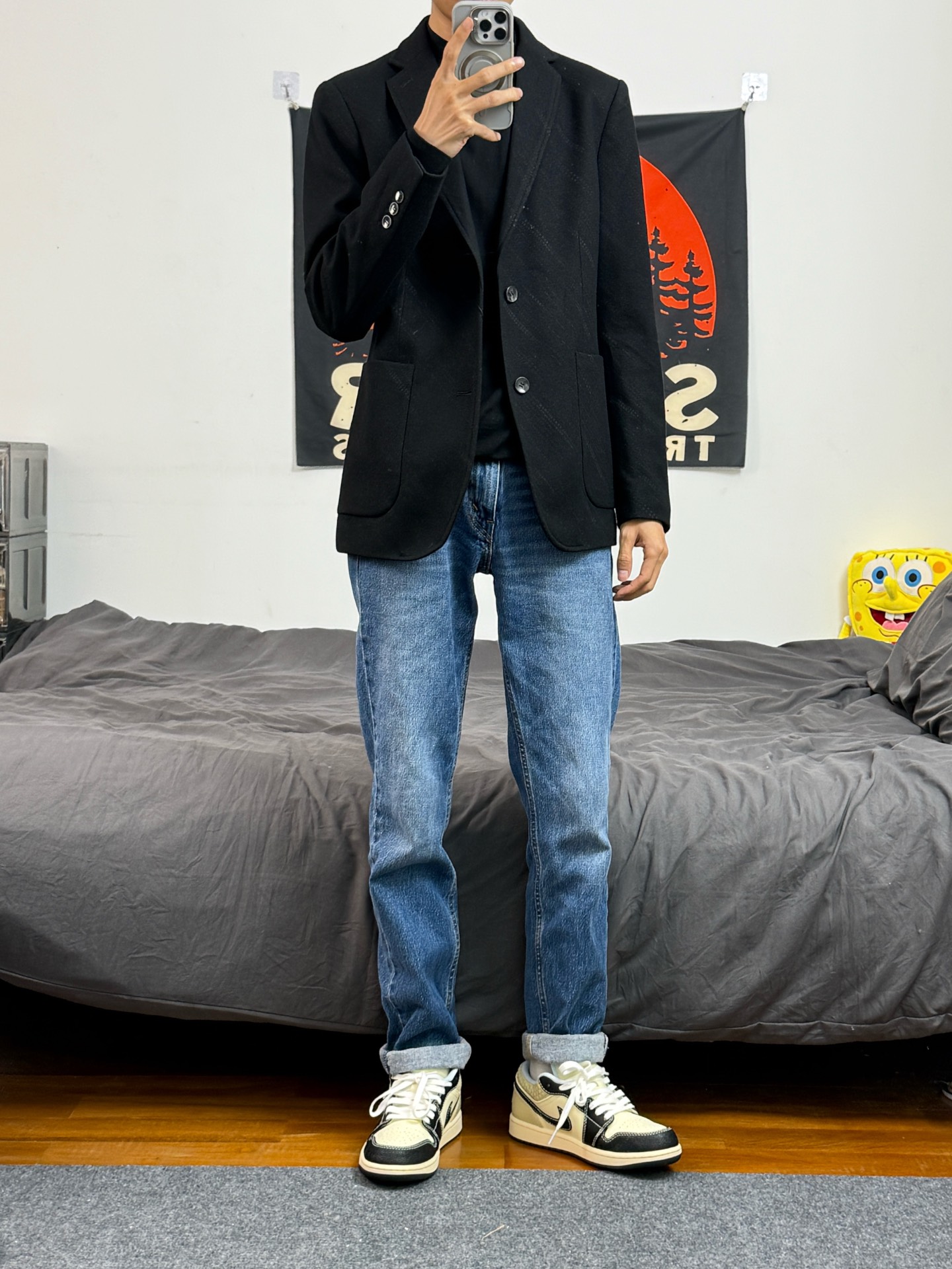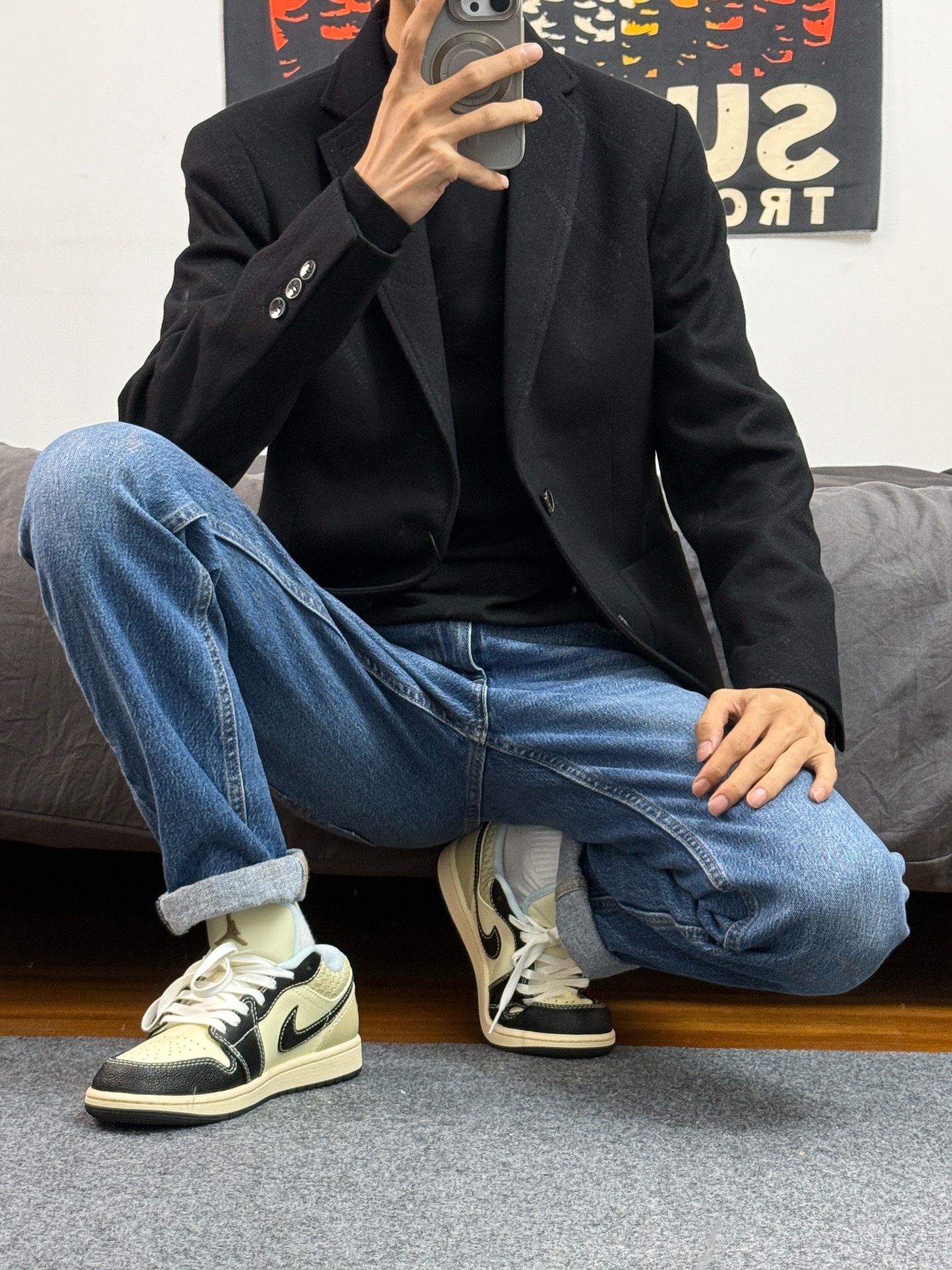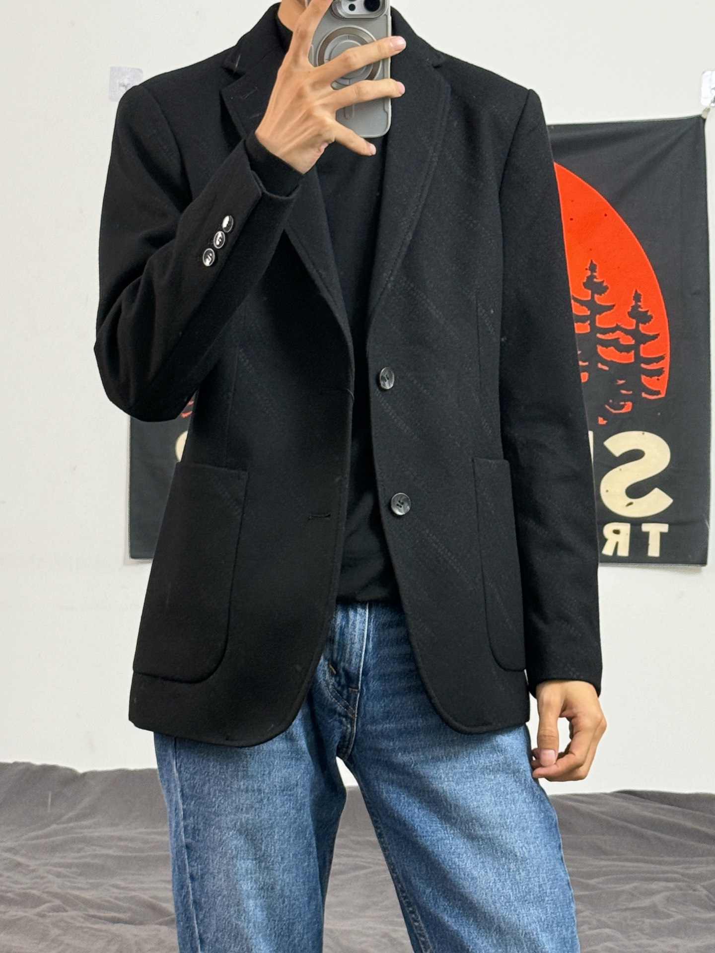 身高174体重48kg 今日上身 黑色西装+水洗牛仔+aj1米黑 🧥是 #LIU·JO UOMO 家的黑色西服 修身版型 上身能很好的修饰体型 羊毛的材质,上身非常保暖 小骨架穿也能撑的起来 不会松垮垮的 上身48 👔内搭了一件纯色羊毛衫 上身柔软舒适,直接穿也不会扎人 上身48 👖搭配的levis的水洗牛仔 穿着身上显得腿又细又长 👟是aj1米黑 #过冬保暖术 #过冬搭配术 #分享日常通勤...