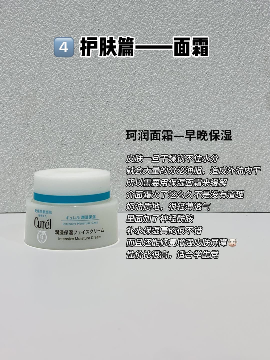 本篇笔记关联了Curel/珂润 润浸保湿面霜 修护舒缓 版本1、The Ordinary 10%烟酰胺+1%锌三控精华 提亮控油淡化痘印收毛孔 30ml、AKF 紫苏氨基酸洗面奶 深层清洁收缩毛孔温和控油保湿祛痘净颜 控油清洁等商品,为用户提供真实的使用体验和购买参考。