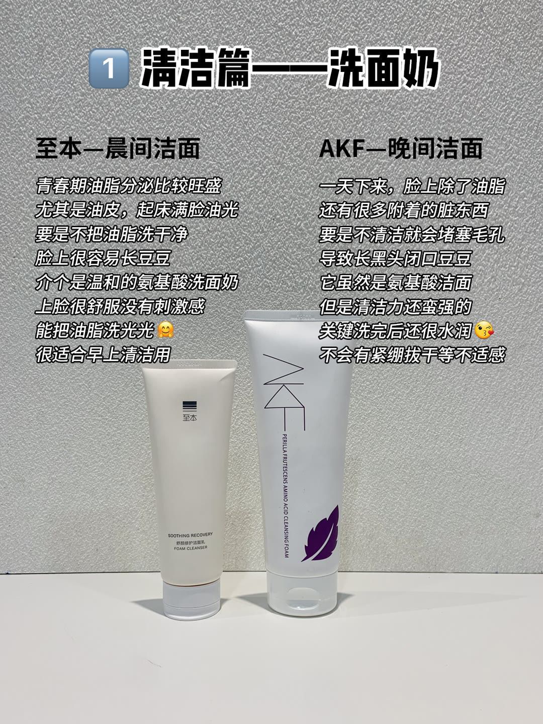 16岁女生正确的护肤步骤,告别无效护肤,这一篇干货满满一看就会! 1️⃣清洁篇——洗面奶 🍯至本一晨间洁面 青春期油脂分泌比较旺盛 尤其是油皮,起床满脸油光 要是不把油脂洗干净 脸上很容易长豆豆 介个是温和的氨基酸洗面奶 上脸很舒服没有刺激感 能把油脂洗光光 很适合早上清洁 🍯AKF-晚间洁面 一天下来,脸上除了油脂 还有很多附着的脏东西 要是不清洁就会堵塞毛孔 导致长黑头闭口豆豆 它虽然是氨...