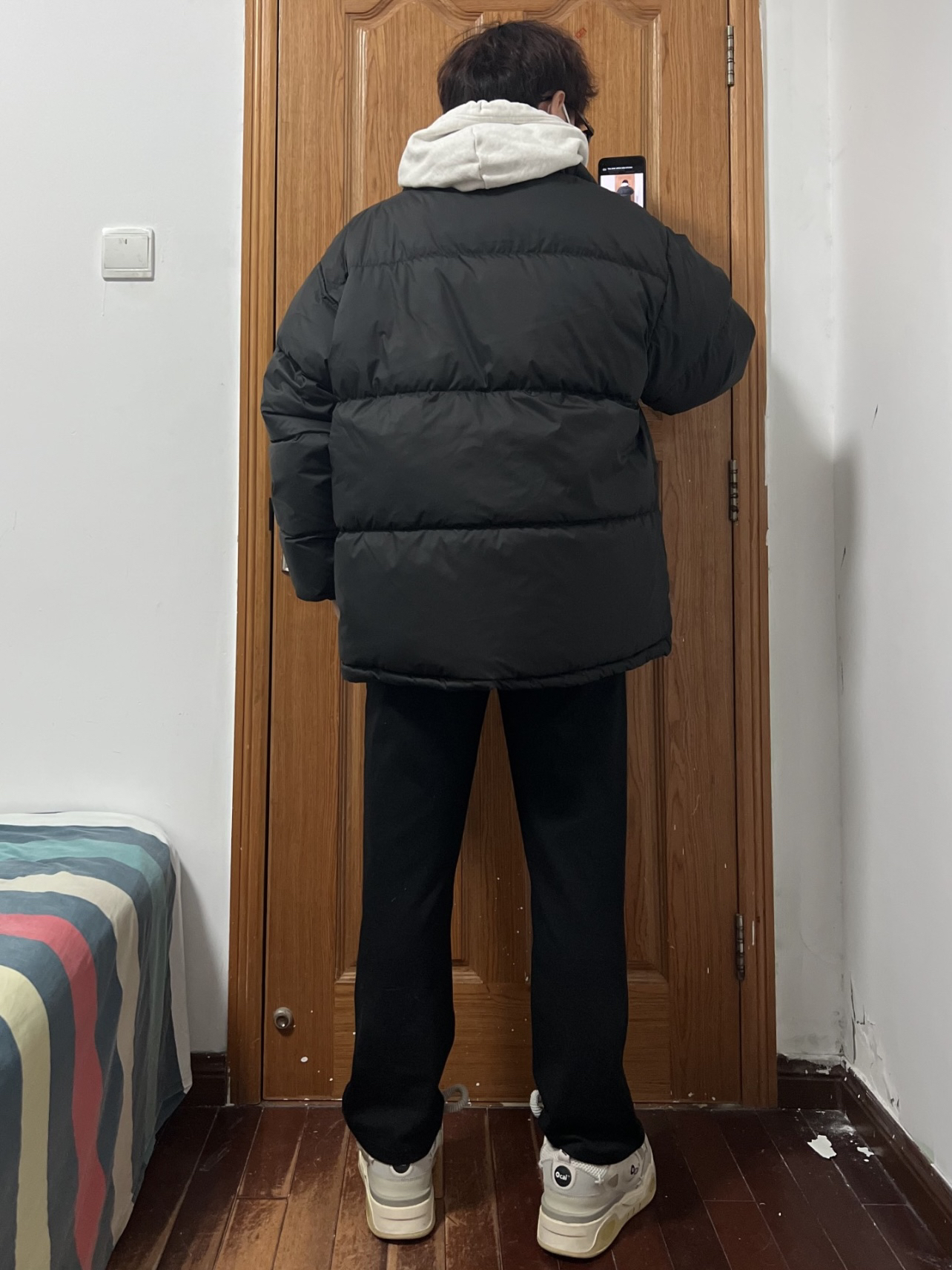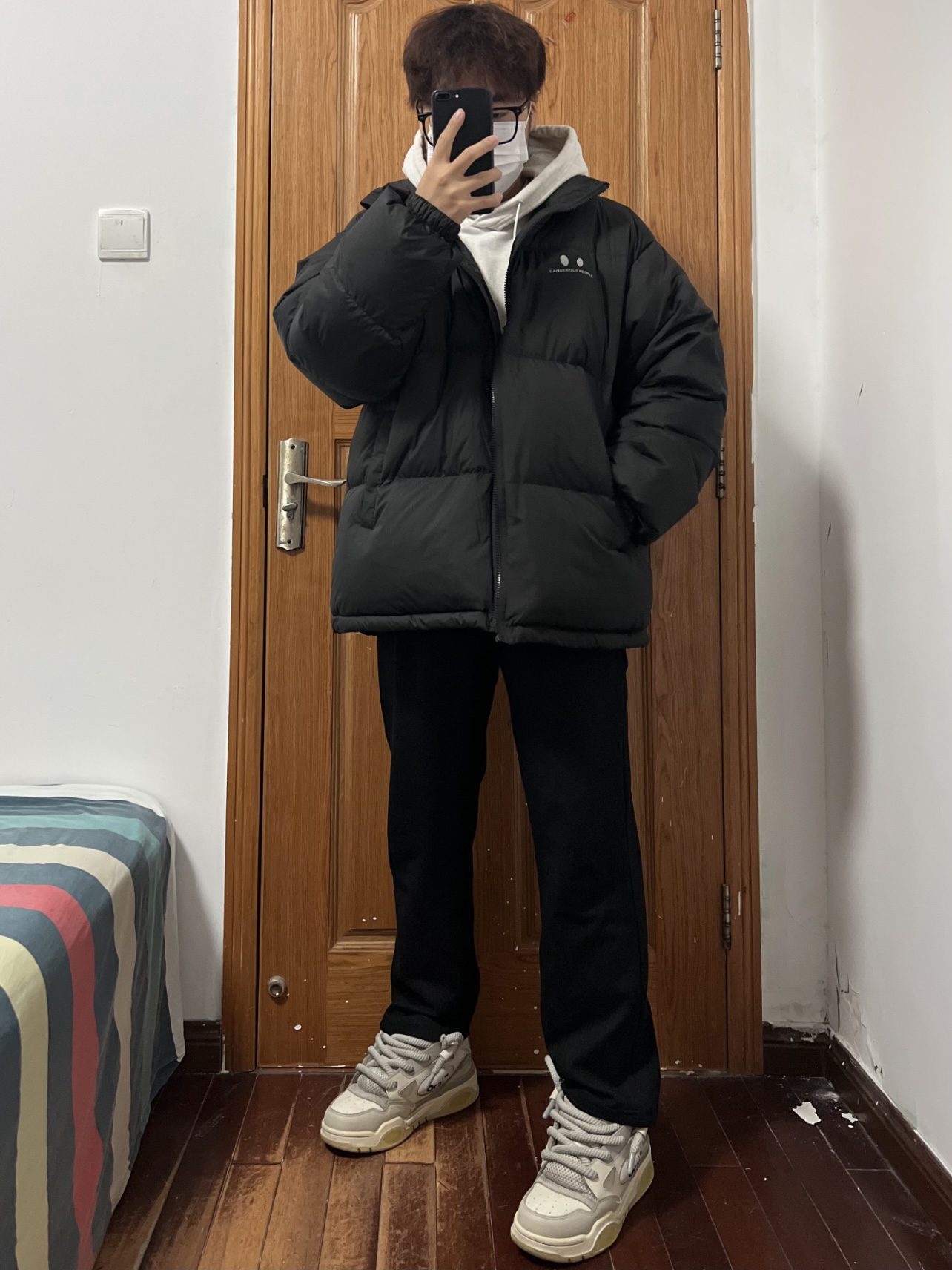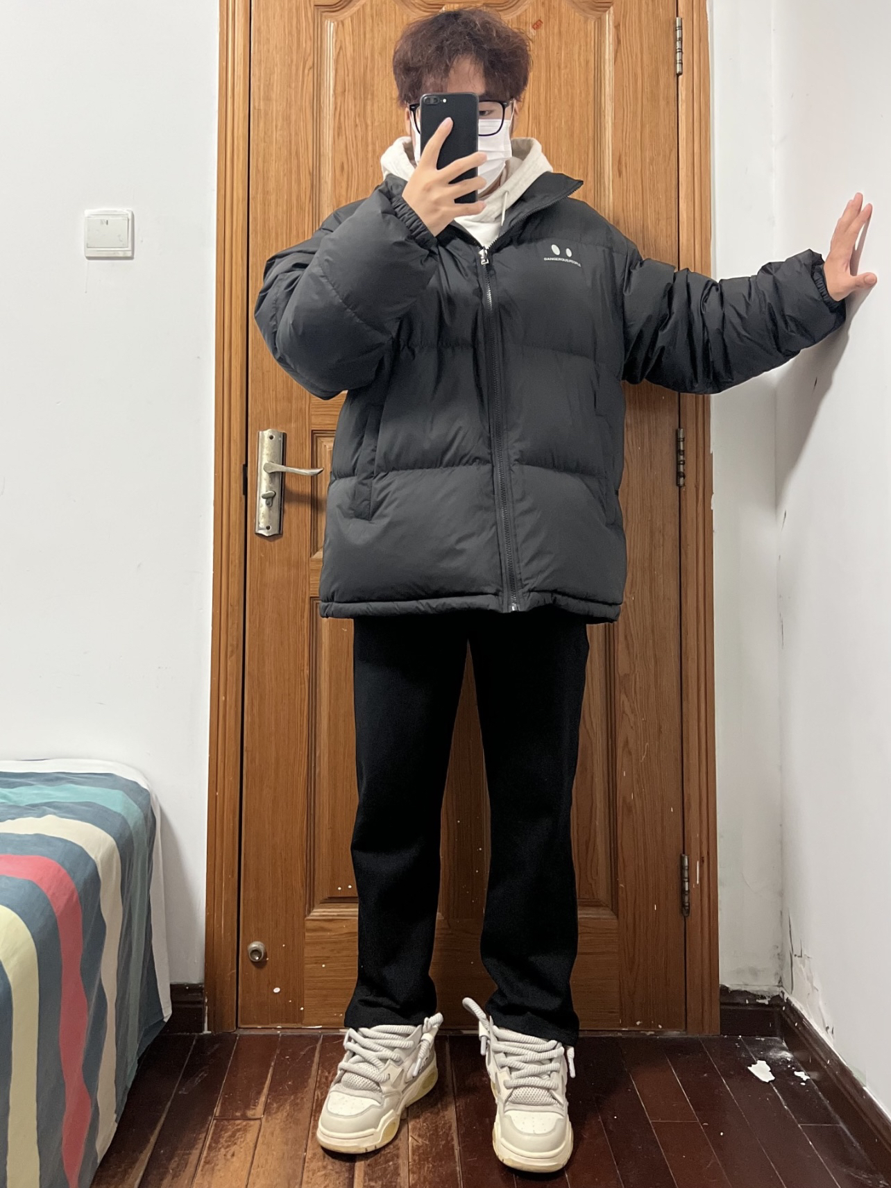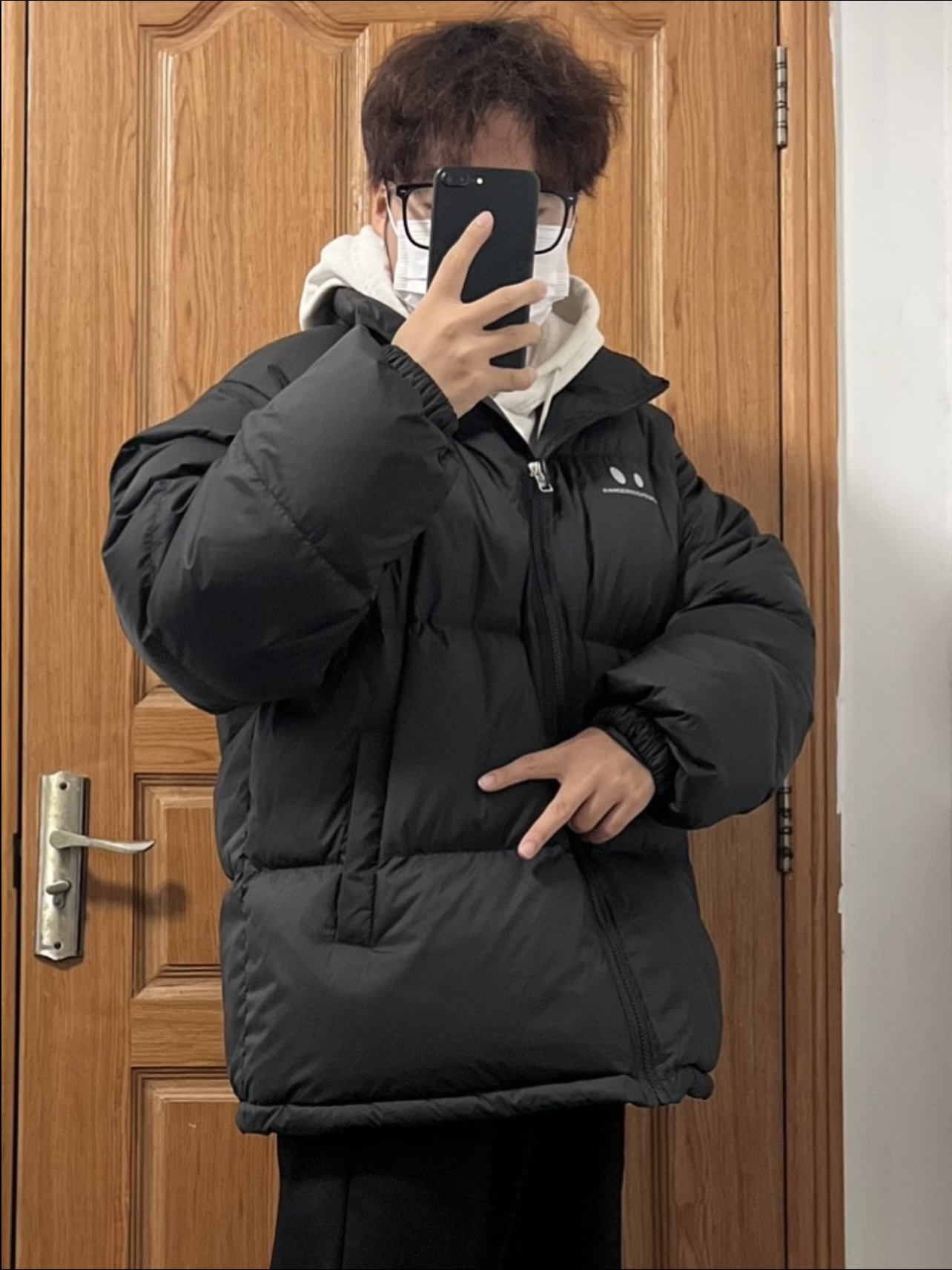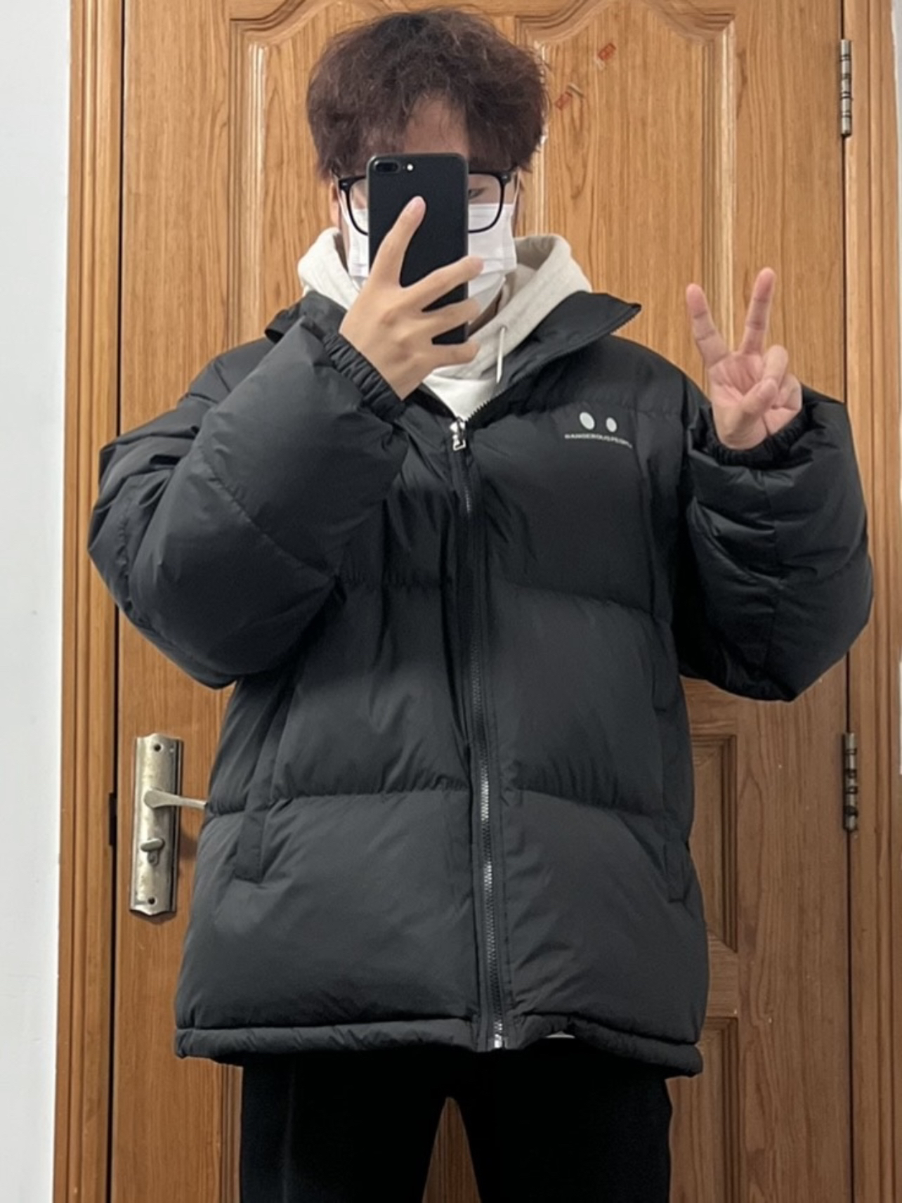 今日份穿搭分享🎉 DANGEROUSPEOPLE 云朵泡芙小眼睛羽绒服 并不是纯粹的黑色哦❗️有哑光质感的黑 强光下泛灰黑正常光线下就是黑=两件衣服👀 版型简单宽松胸口小👀加logo 充绒量也是超足的很有安全感嘿嘿 内搭一件灰色卫衣真的超帅啊 裤子就选黑色长裤和白色板鞋🉑️ 男大唯一好穿最帅的羽绒服❗️ 👔 DANGEROUSPEOPLE 👖 黑色长裤 👟 Ocai 🙋♂️ 170...