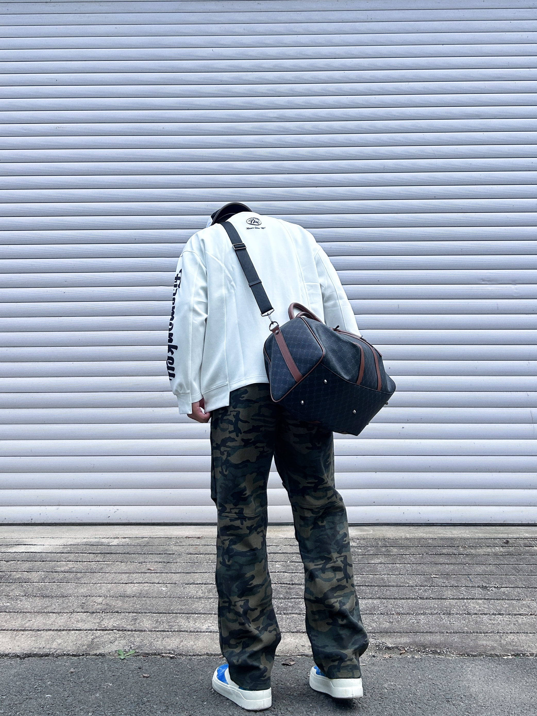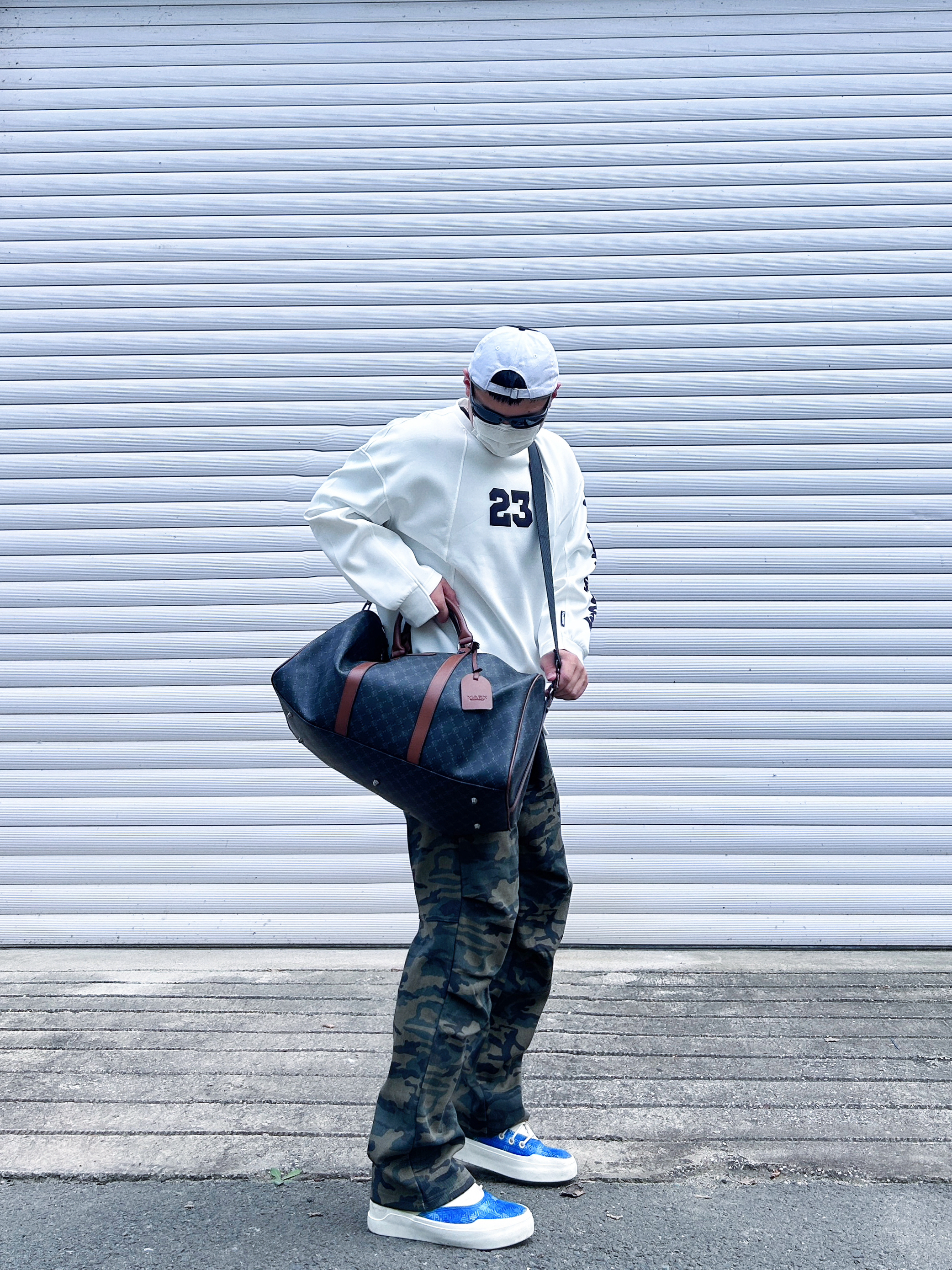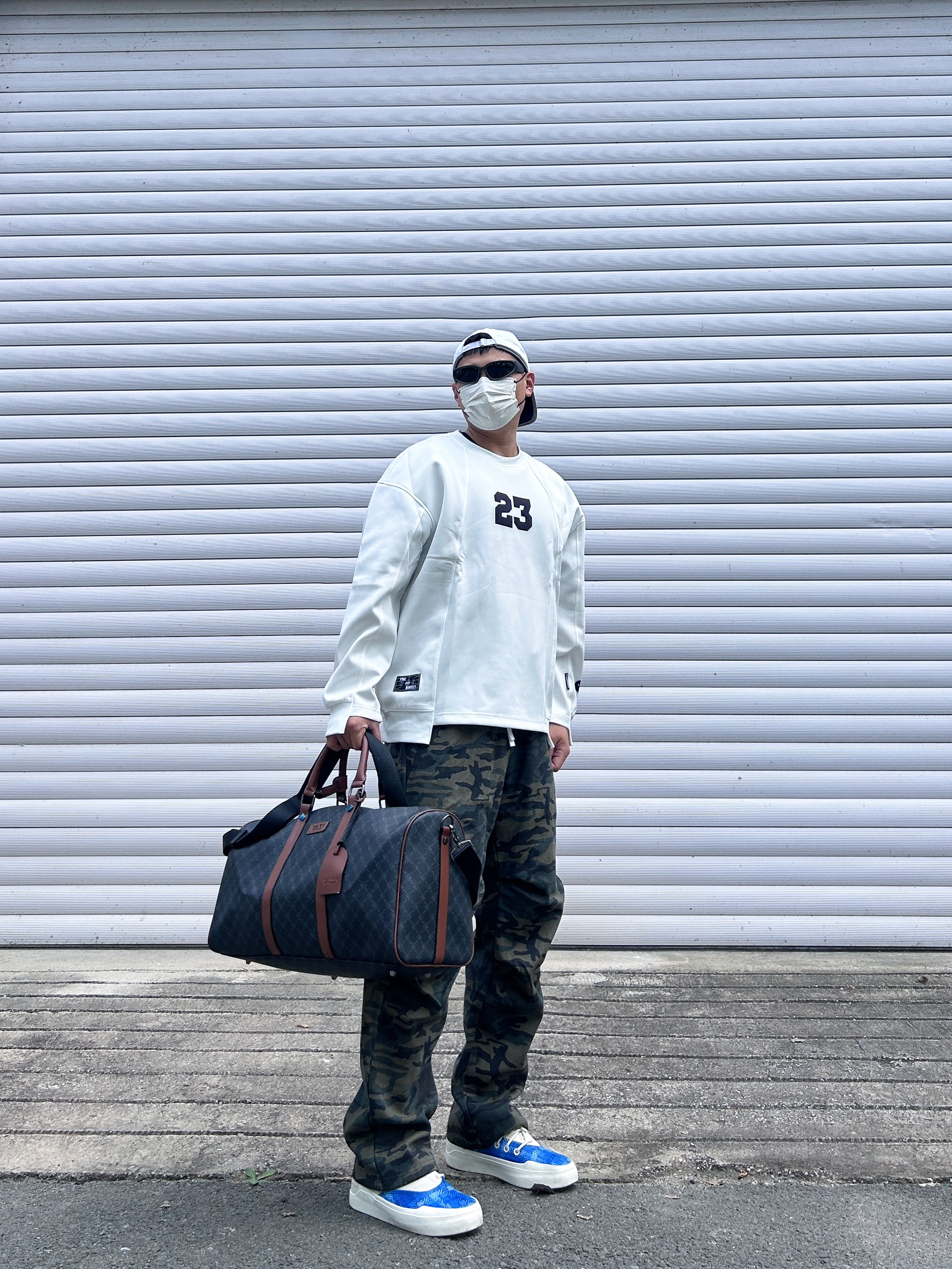 你的新的穿搭打开方式 最近天气渐渐变凉 上身一款美式的宽松卫衣 下面搭配一条迷彩长裤 整一个酷酷的健身包穿搭 马克华菲/FAIRWHALE 双面的印花皮质材料 容量很大,平时健身户外旅行都可以 单肩背着也很酷 情侣👫拍照📷出片