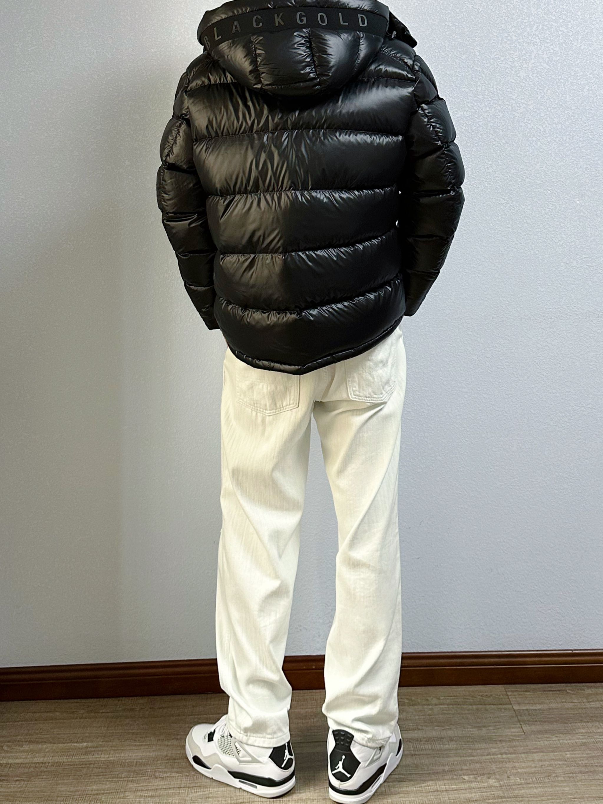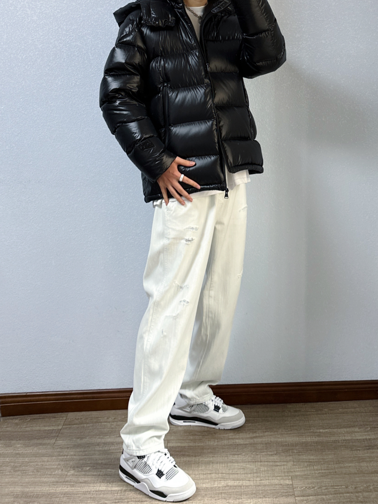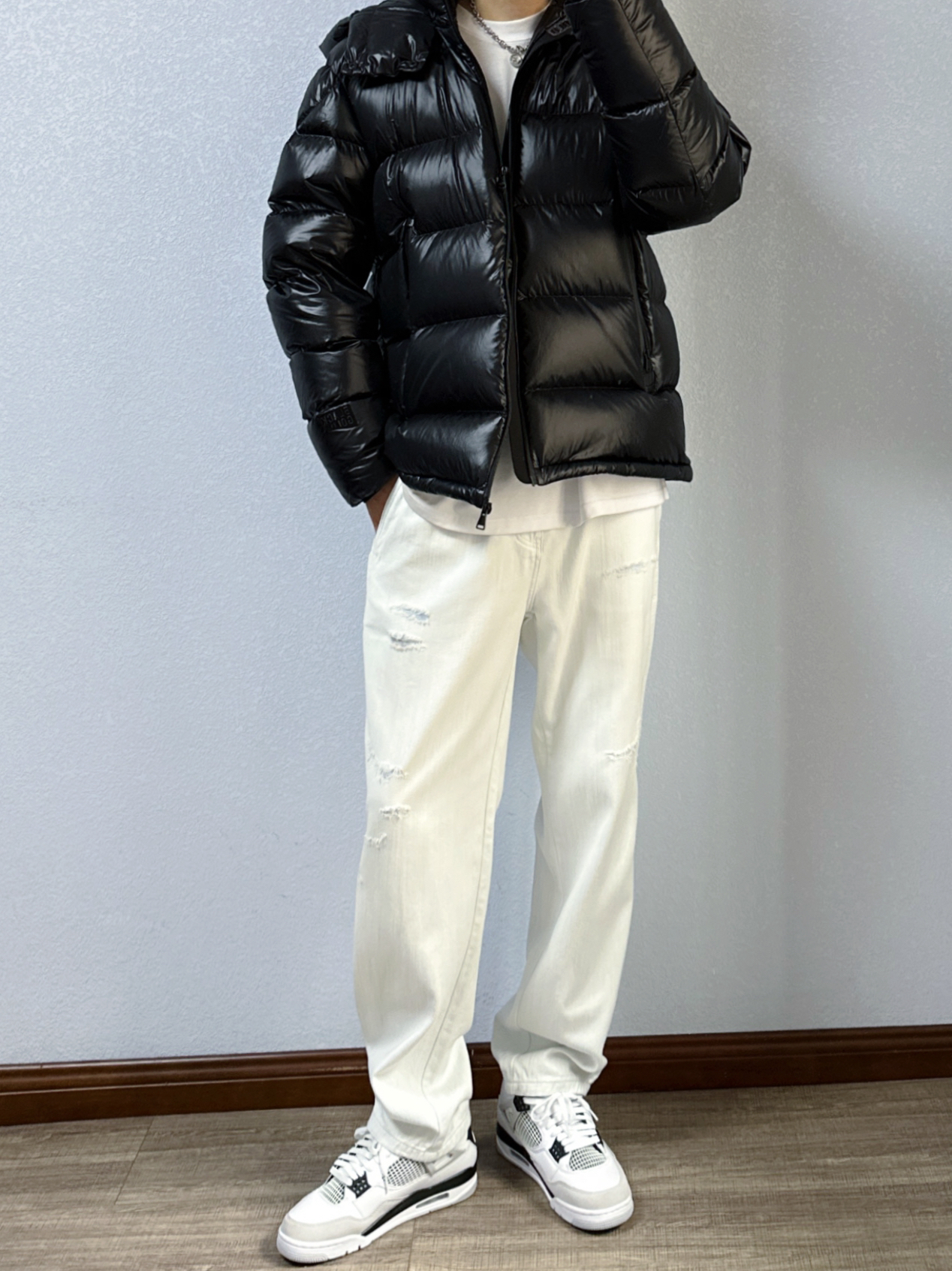 🐳:185 65 宝子们好呀, 冬天出门当然少不了羽绒服啦, 今天是入冬休闲风穿搭, 衣服是高梵黑珍珠羽绒服, 版型款宽松百搭,上身不臃肿, 珠光黑高级感满满, 鹅绒保暖御寒也蛮可, 搭配简单白T和白色直筒牛仔裤, 白色运动长袜搭配黑白配色球鞋, 对简单干净的穿搭没有抵抗力~
