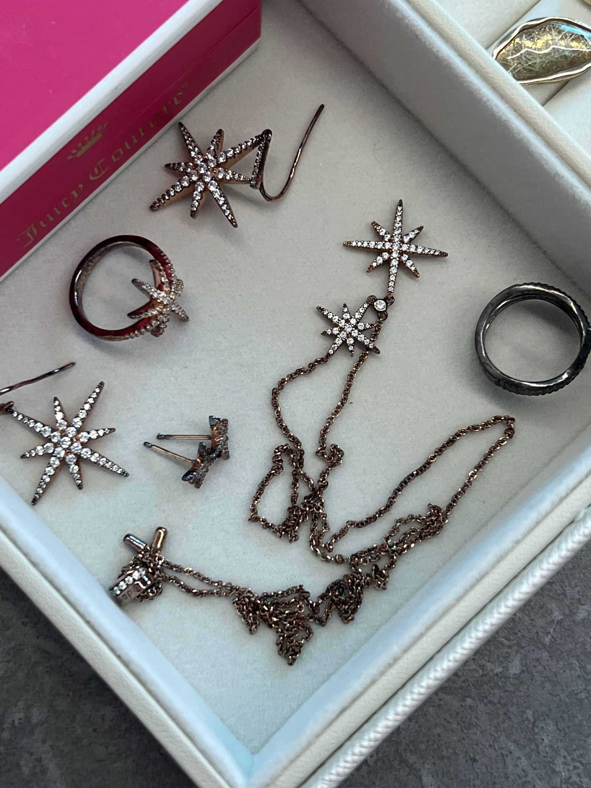 女朋友很喜欢apm的六芒星系列这个系列玫瑰金的基本都集齐了 项链耳环 耳钉 戒指~ 但是!我觉得它的品质非常非常不符合这个价位! 每次想要戴的时候拿出来就是发黑的!导致根本就没能戴几次……. 去店里清洗 拿回来没两周又发黑 再去清洗 反反复复反反复复最后放弃了 好久都不戴了…… 这次拿出来用了网友们的方法真的去黑了!但洗掉之后颜色会比原来的淡 玫瑰金的粉色已经褪掉很多变成一种淡淡的金色了 仅仅浸泡...