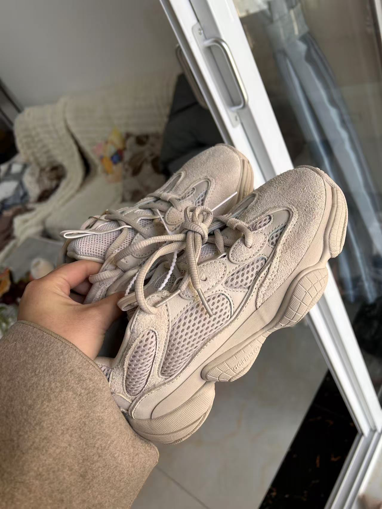 躲过老爹鞋,却没躲过yeezy500,苹果原相机拍摄,翻毛皮+纺织布,配上像跑车般的鞋型,颜值很满意,鞋子很轻,鞋底也很软,穿在脚上很显脚长,特别好看,尺码偏小半码,建议拍大半码或大一码购买。
