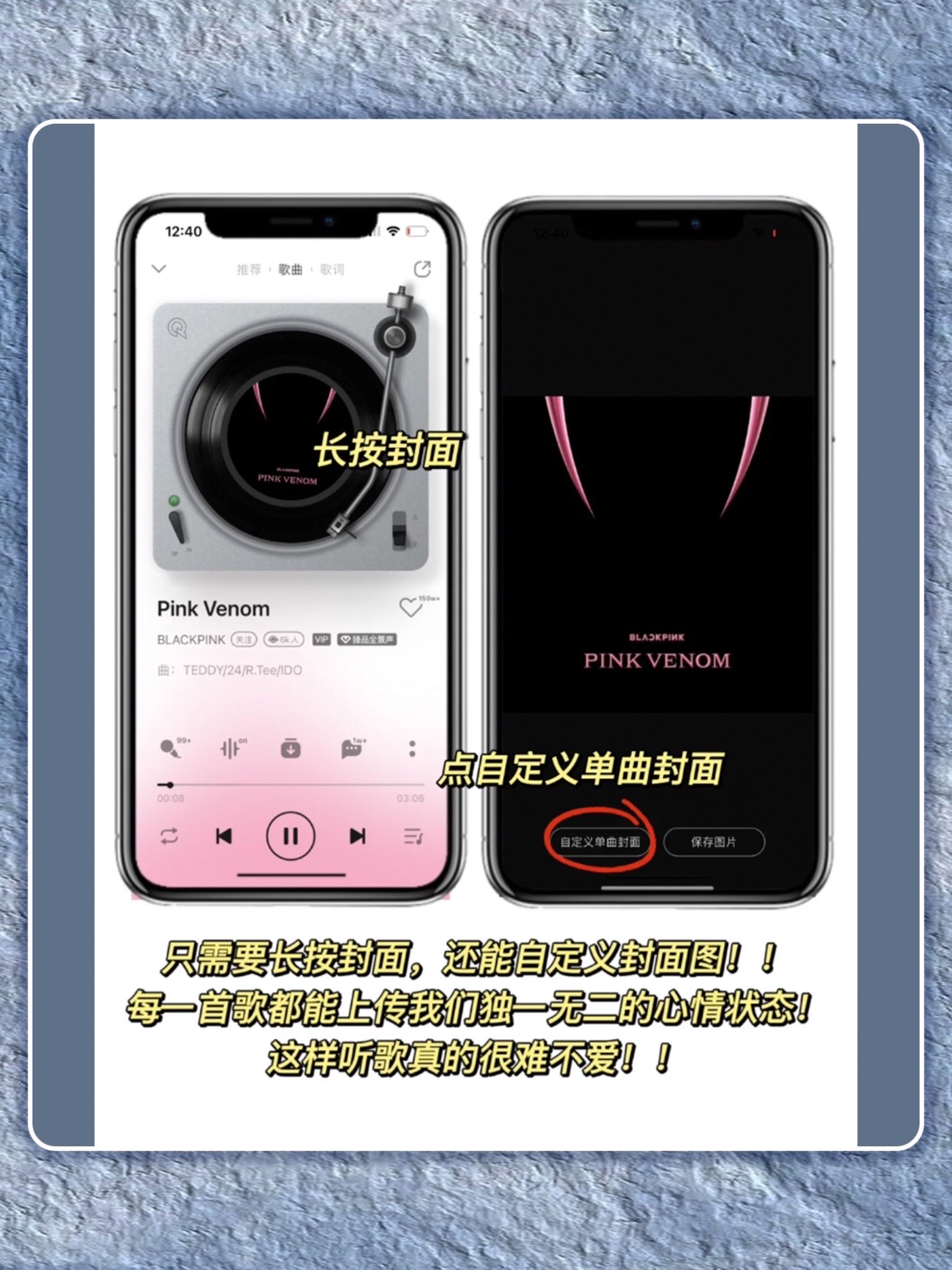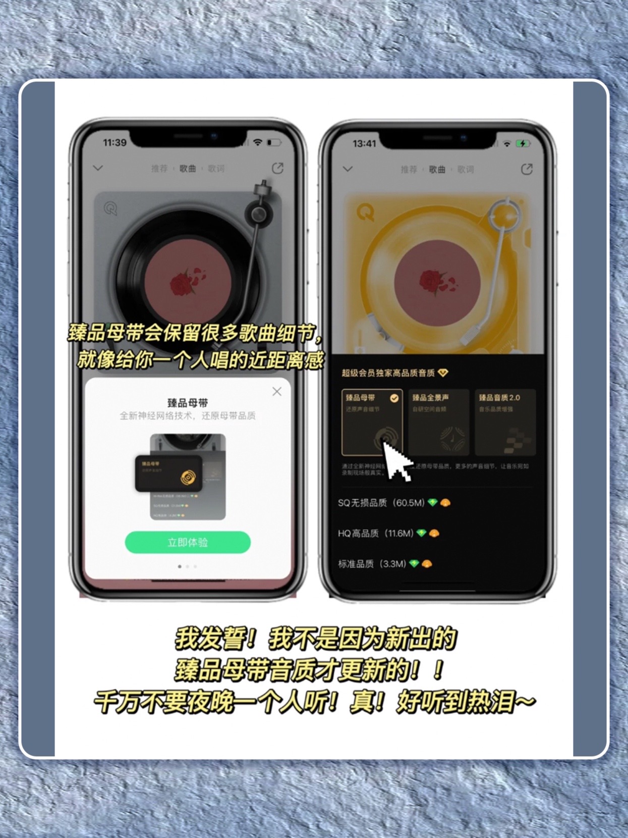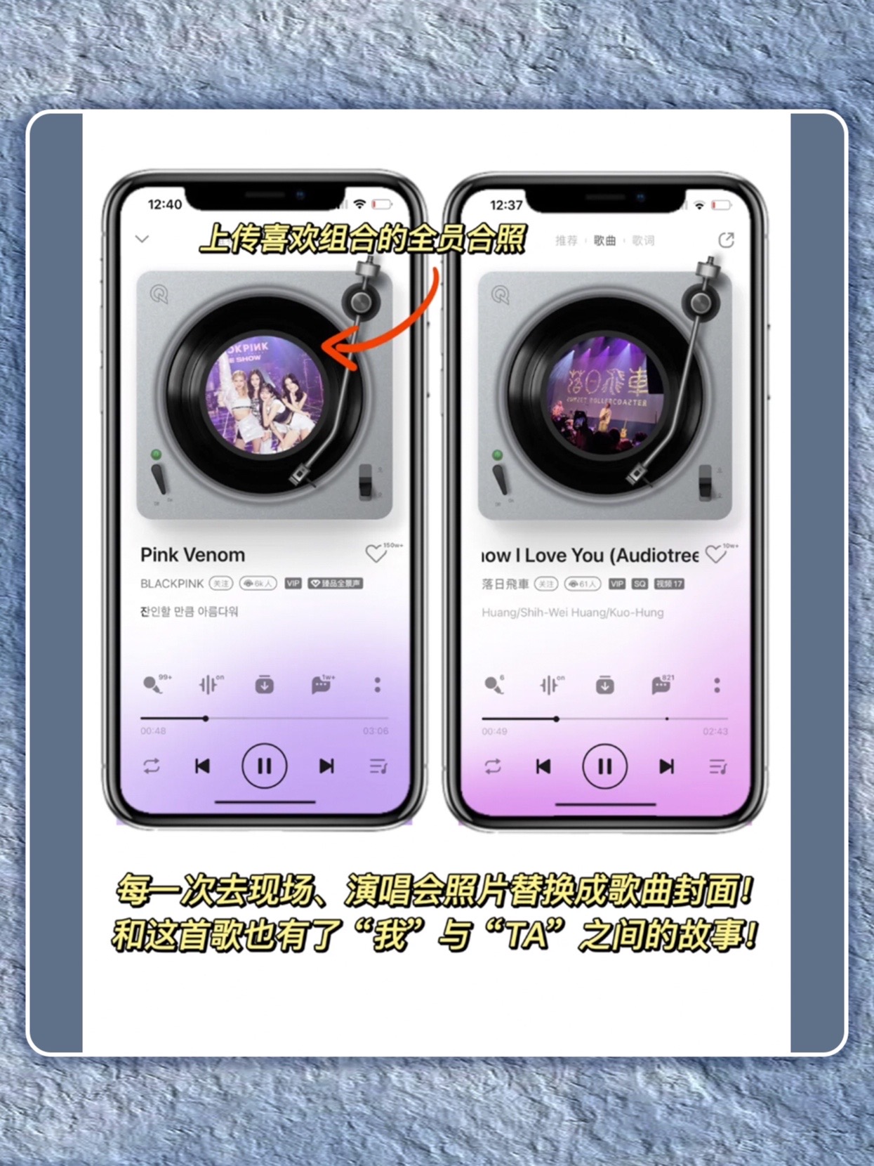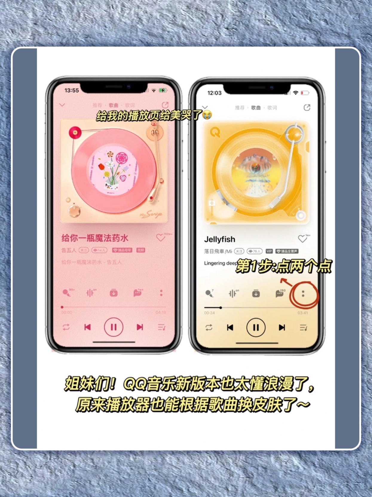 QQ音乐听歌满满的仪式感来啦~太喜欢新版的音质了!连播放器都可以更换皮肤! 每一个都巨甜,用它来偷偷撒糖真的太太浪漫了 姐妹们!!速学起来~ 1⃣️自定义歌曲封面 长按歌曲封面,就能自己上传照片更换封面!救命!我已经把常听的歌摩全换成和对象的美照!每一首歌瞬间都变得满满回忆 2⃣️给播放器换皮肤 QQ音乐是懂听歌氛围感的!!自带敲多不要的播放器皮肤随便换,唱片转速/样式都能自定义,太赞啦~...
