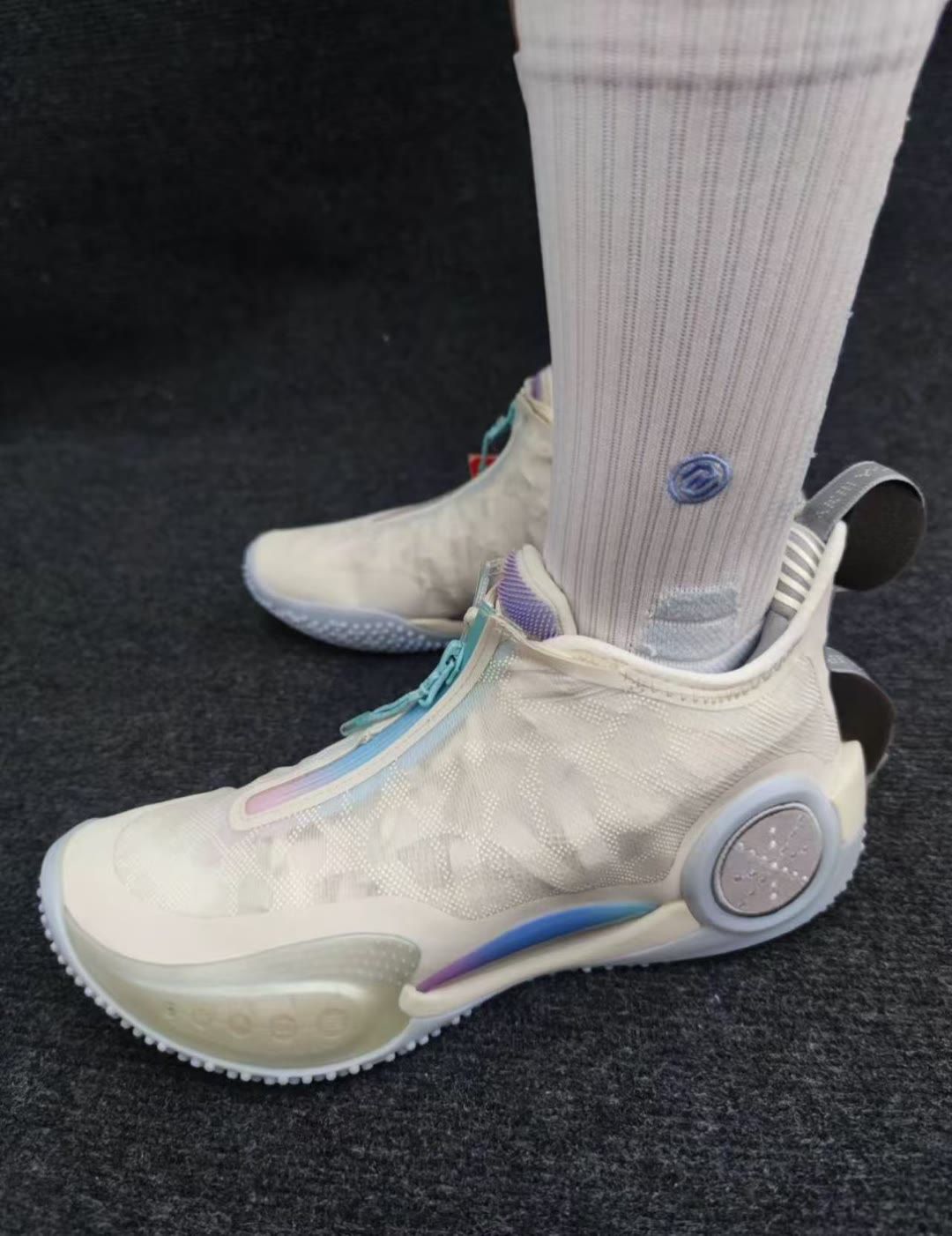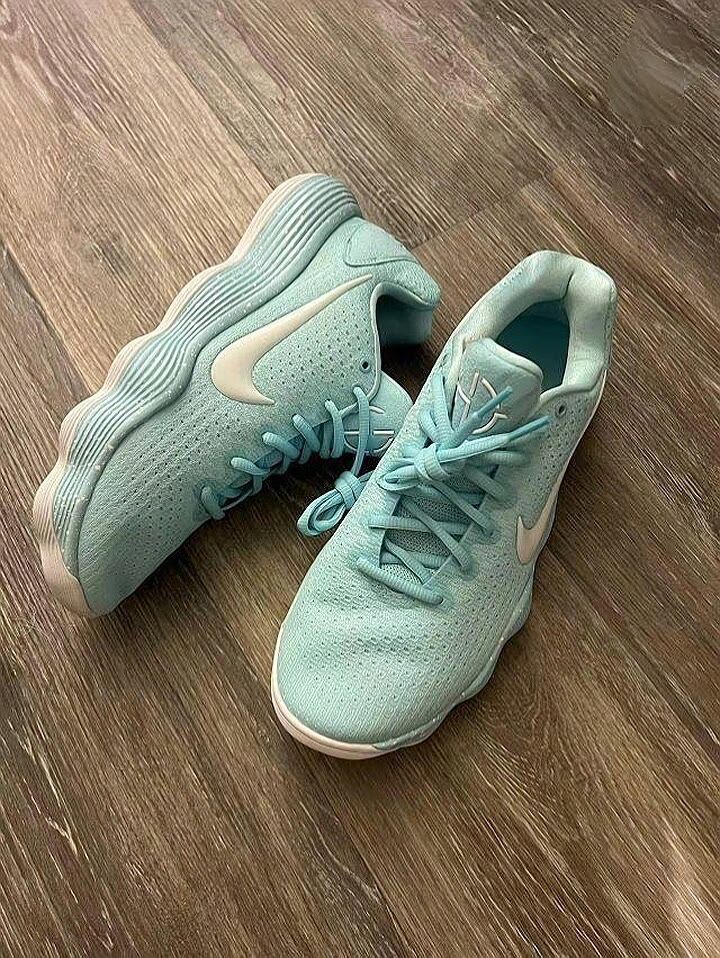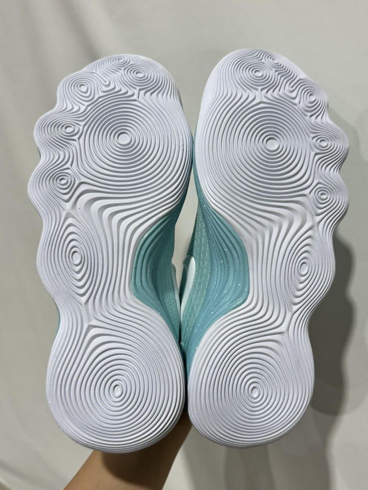 浅蓝色中底还加上一些白色小点作为点缀,清新好看,非常适合夏天。 从包裹方面也是很到位,防侧翻,抗扭性都是没得说的,鞋底无论是场外还是场内都很适用。 鞋面强度好的同时还依旧灵活,鞋底反馈还行。