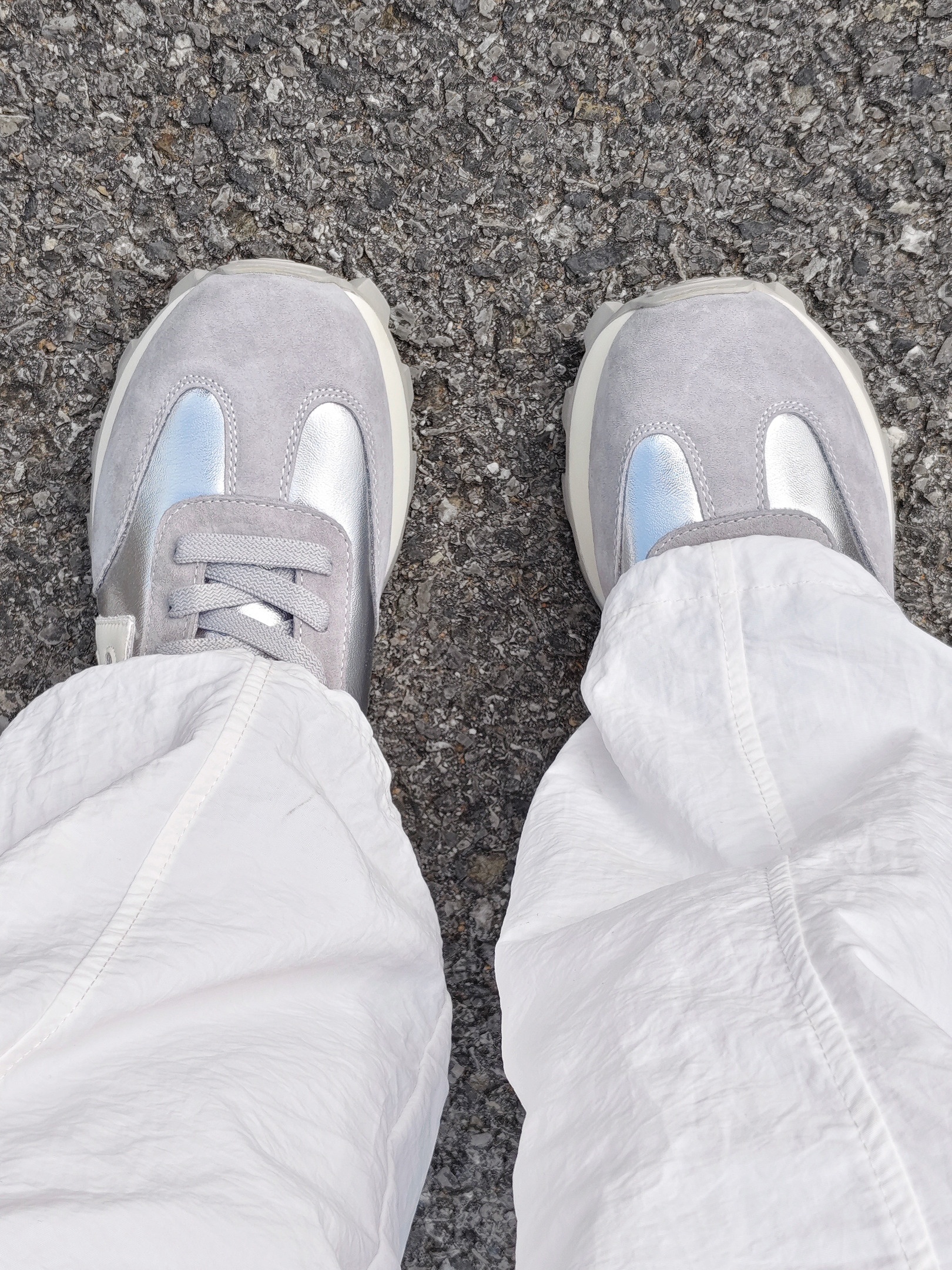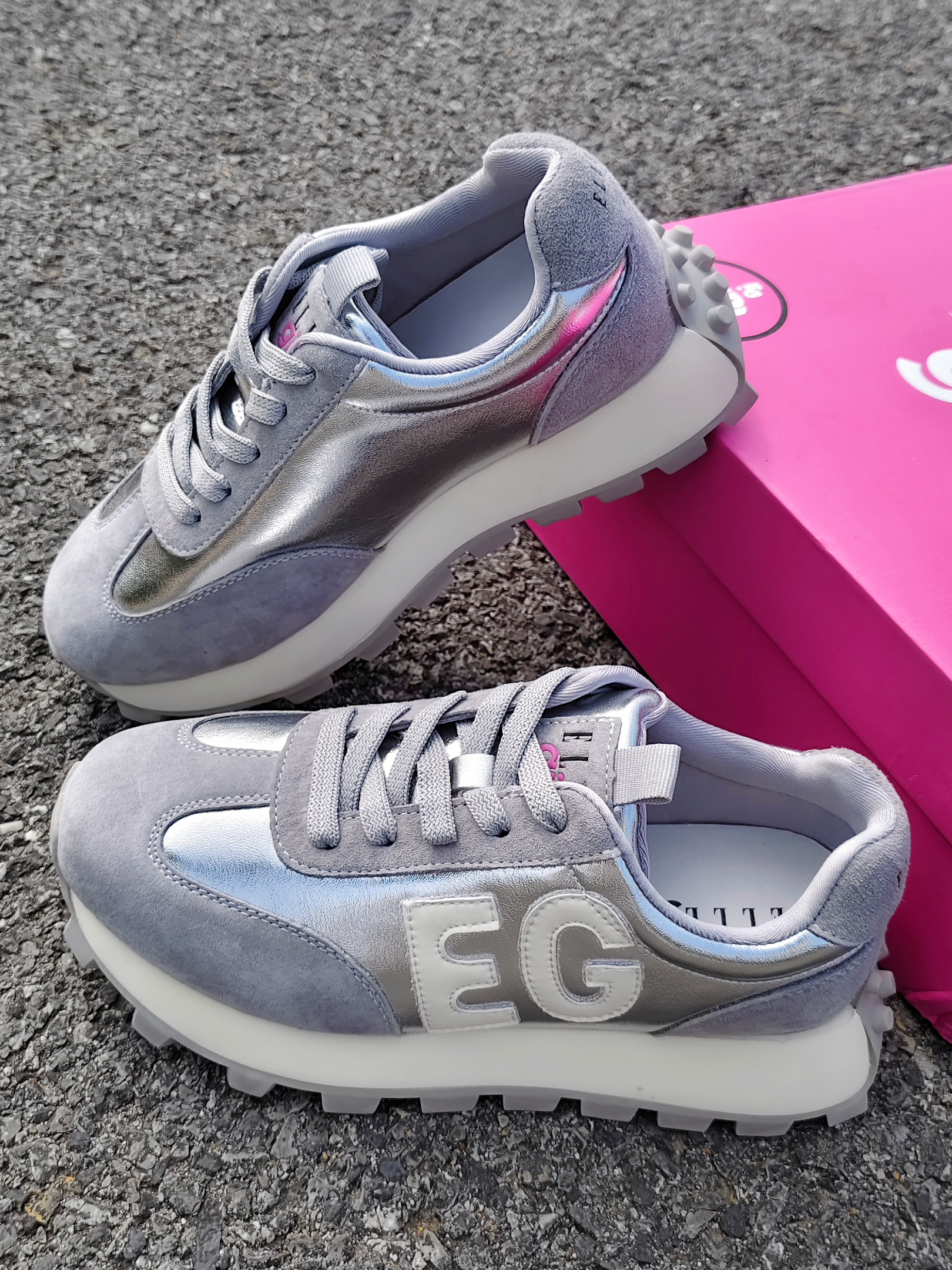 银灰配色,时尚简约的款式 鞋面的颜色皮质还带有反光的效果 更显高级啦 日常搭配休闲裤或者小长裙hin适合 脚感舒服,走路不会磨脚 尺码的话不偏码哈