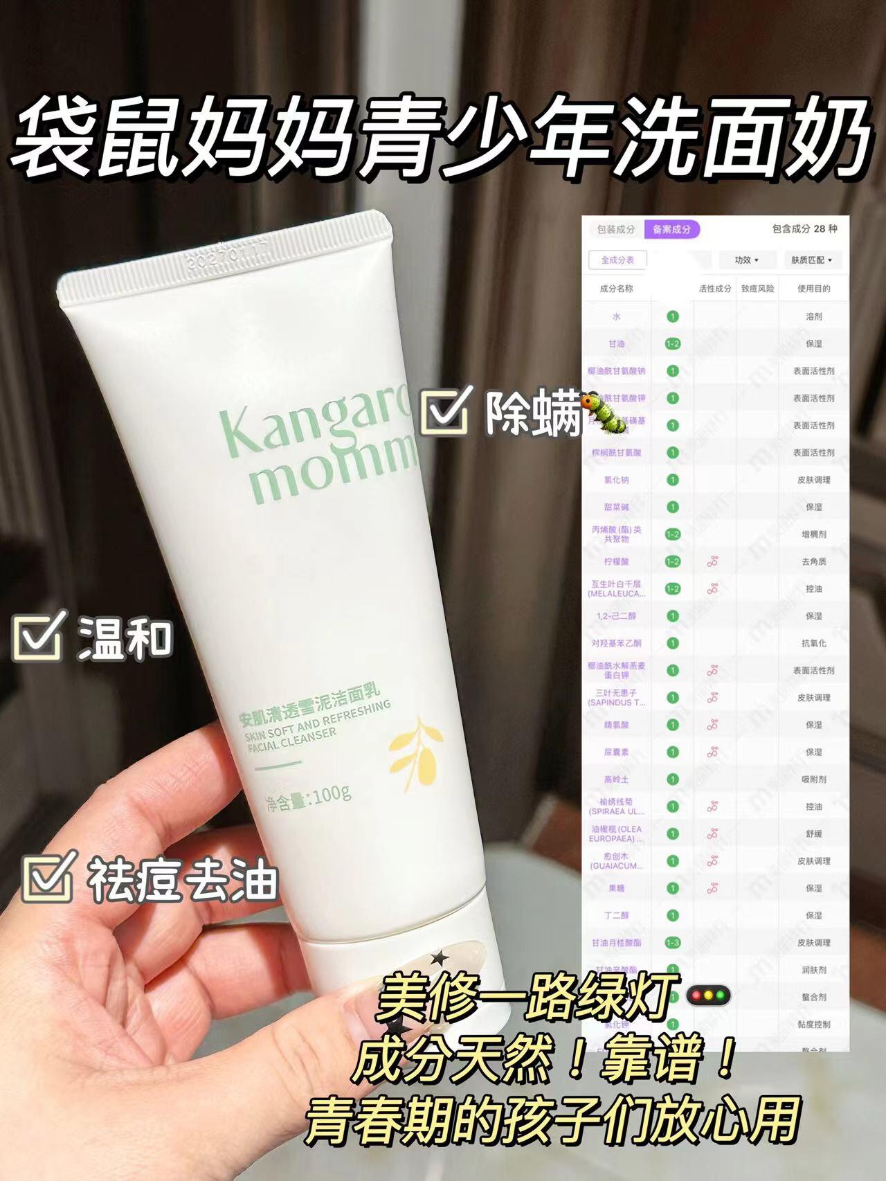 青春期的少年少女们!!听劝!! 过度清洁会导致屏障受损 清洁不到位黑头粉刺痘痘又冒出来 床铺不及时清洗,还容易睡出螨🐛脸 快试试袋鼠妈妈青少年洗面奶 太适合油痘肌的青少年啦 清洁、保湿、修护、控油、除螨 它都能统统搞定~ 咱就是说每天都在期待用它洗脸 - 比起普通的洗面奶 这个专研给青少年的洗面奶更适合青少年 儿童洗面奶又差点儿意思,清洁力不太够!! 成人的又太强了!很容易伤害到皮肤屏障 - 这是...