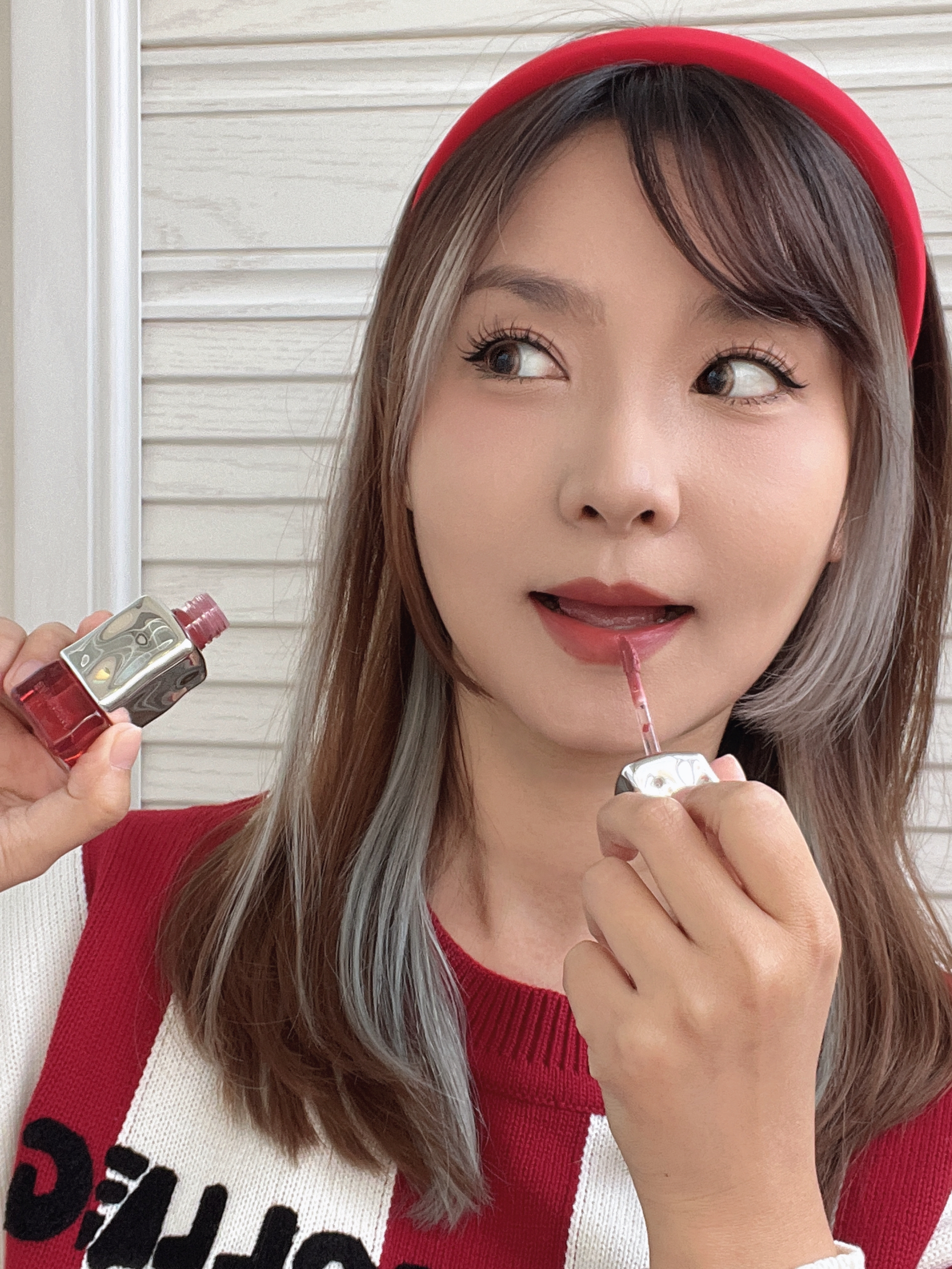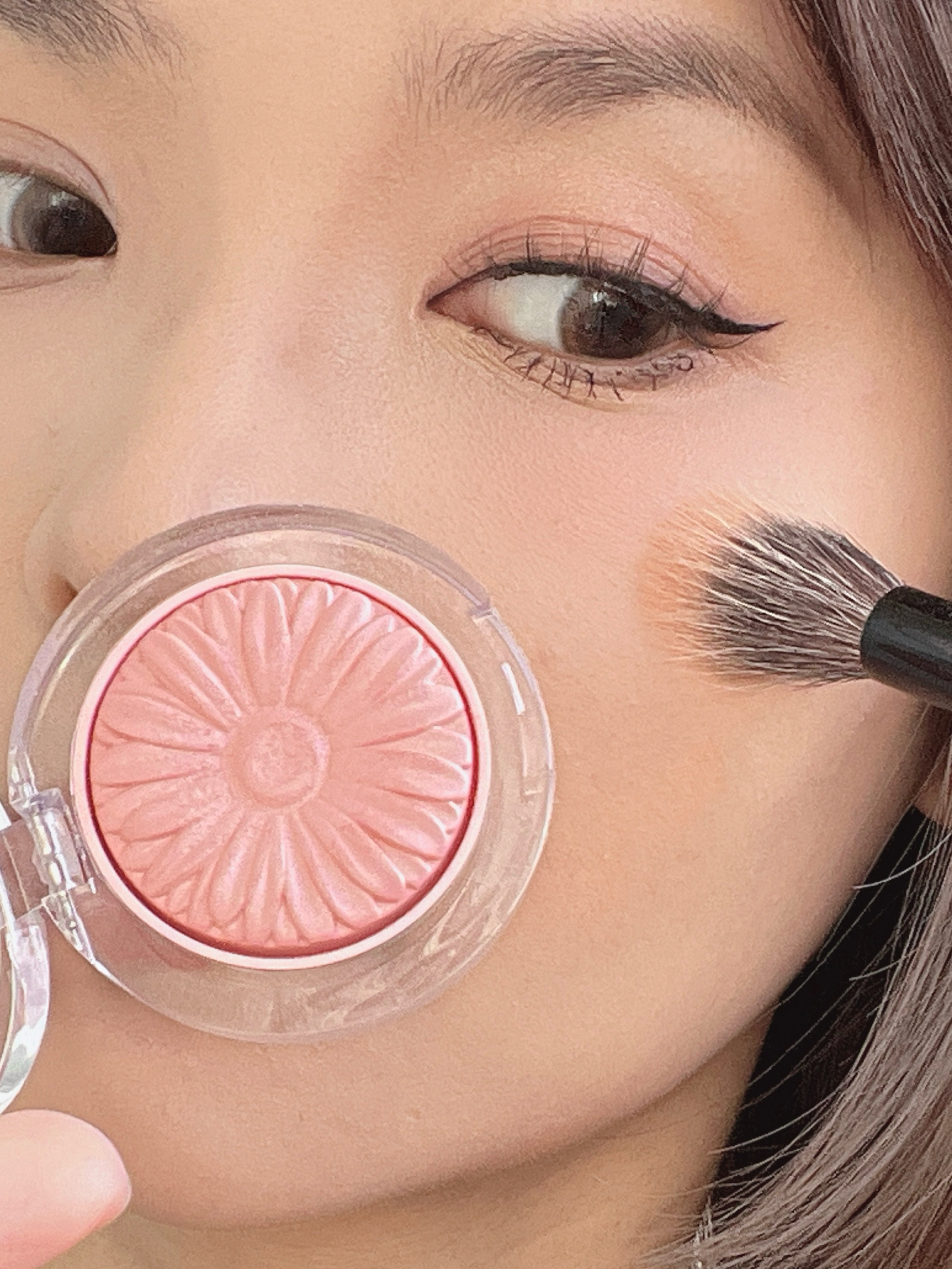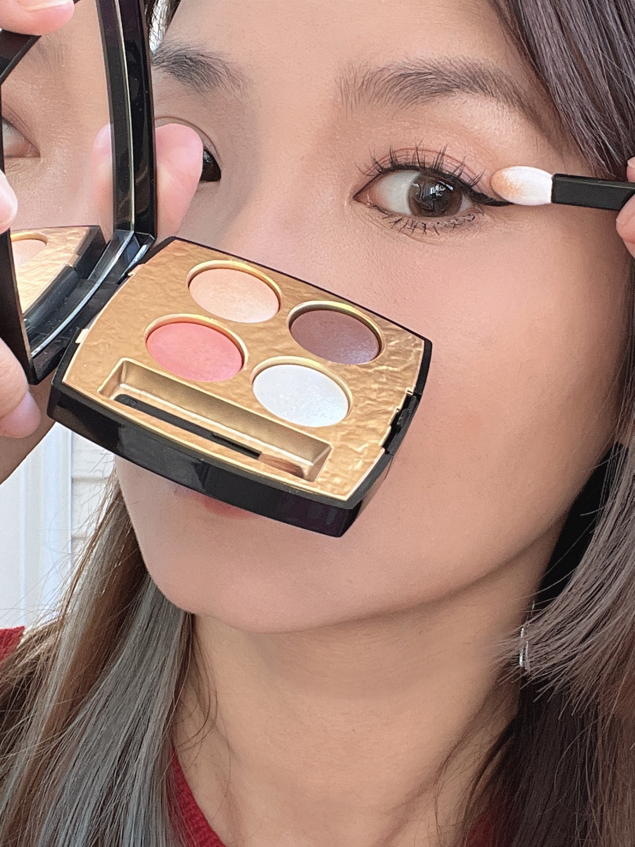 上期说了新手易学的【减少面中留白法】 今天分享的是【放大五官法】 通过集中视线到五官来忽略脸型 眼妆—香奈儿拜占庭眼影318,自然放大眼睛。 腮红—倩碧小雏菊腮红,往面中扫,界限不要超过眼下颧骨位置。 口红——蜜丝婷正中我心礼盒里的M01太妃奶酪。半雾半霜的质地对唇纹星人很友好,扩画薄唇边界很容易拍开。还有2支唇冻都是镜面水光妆效的。