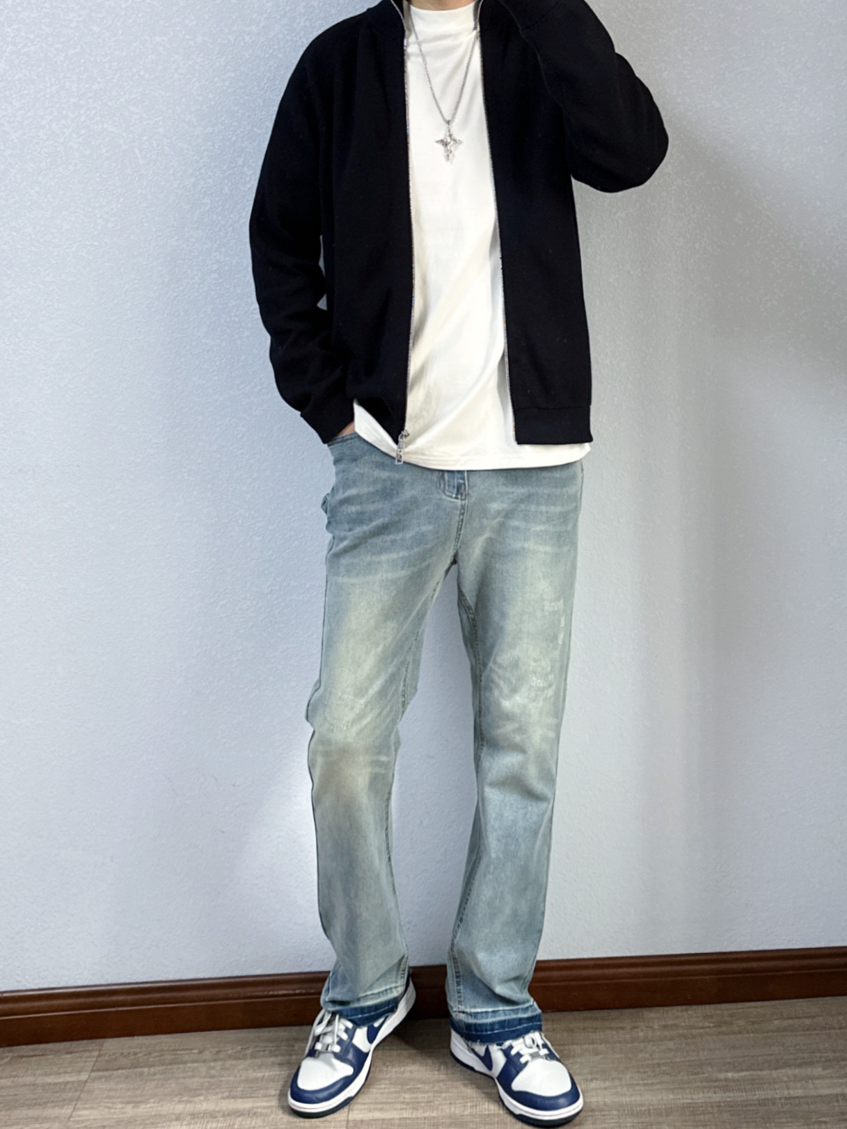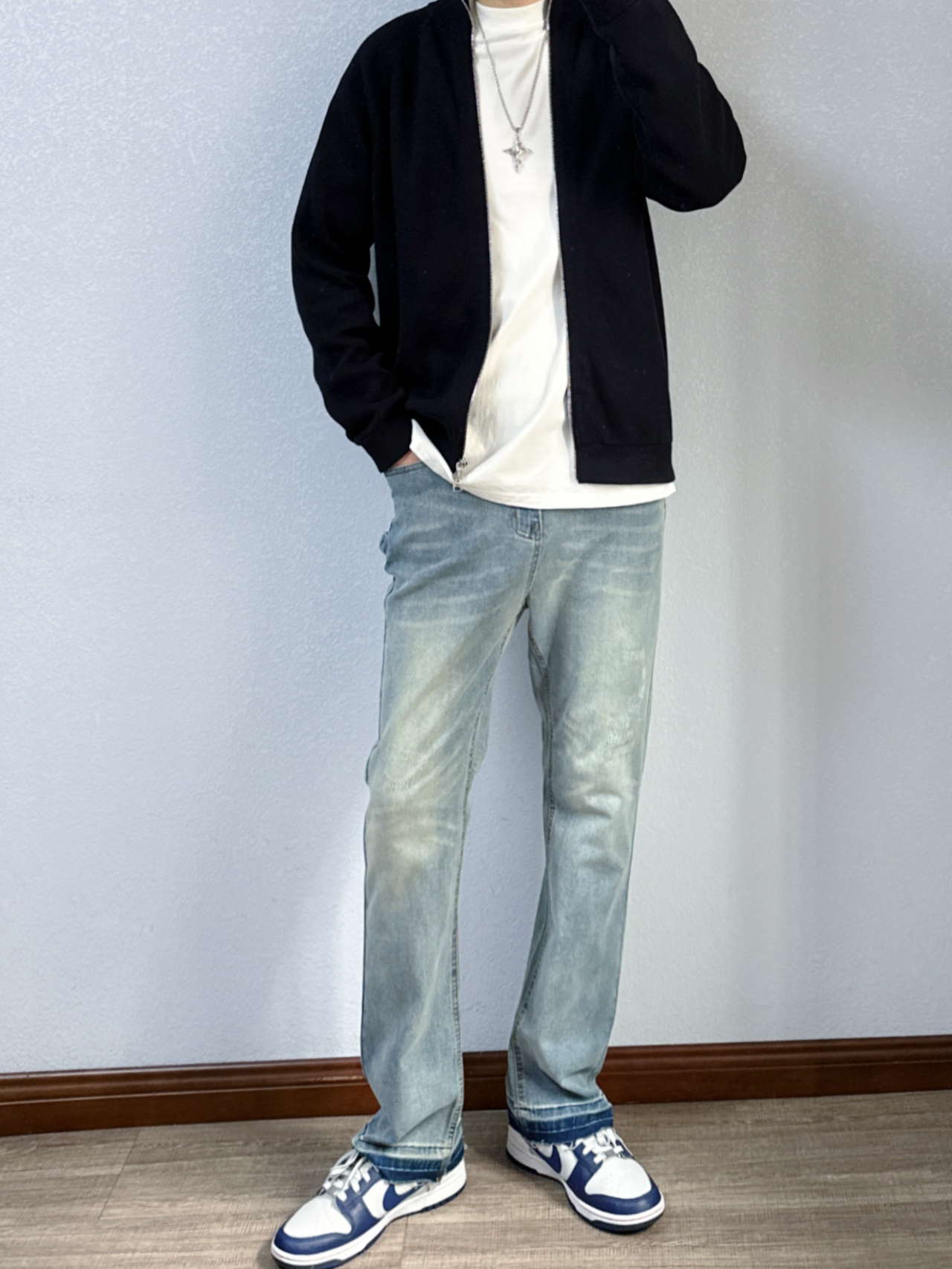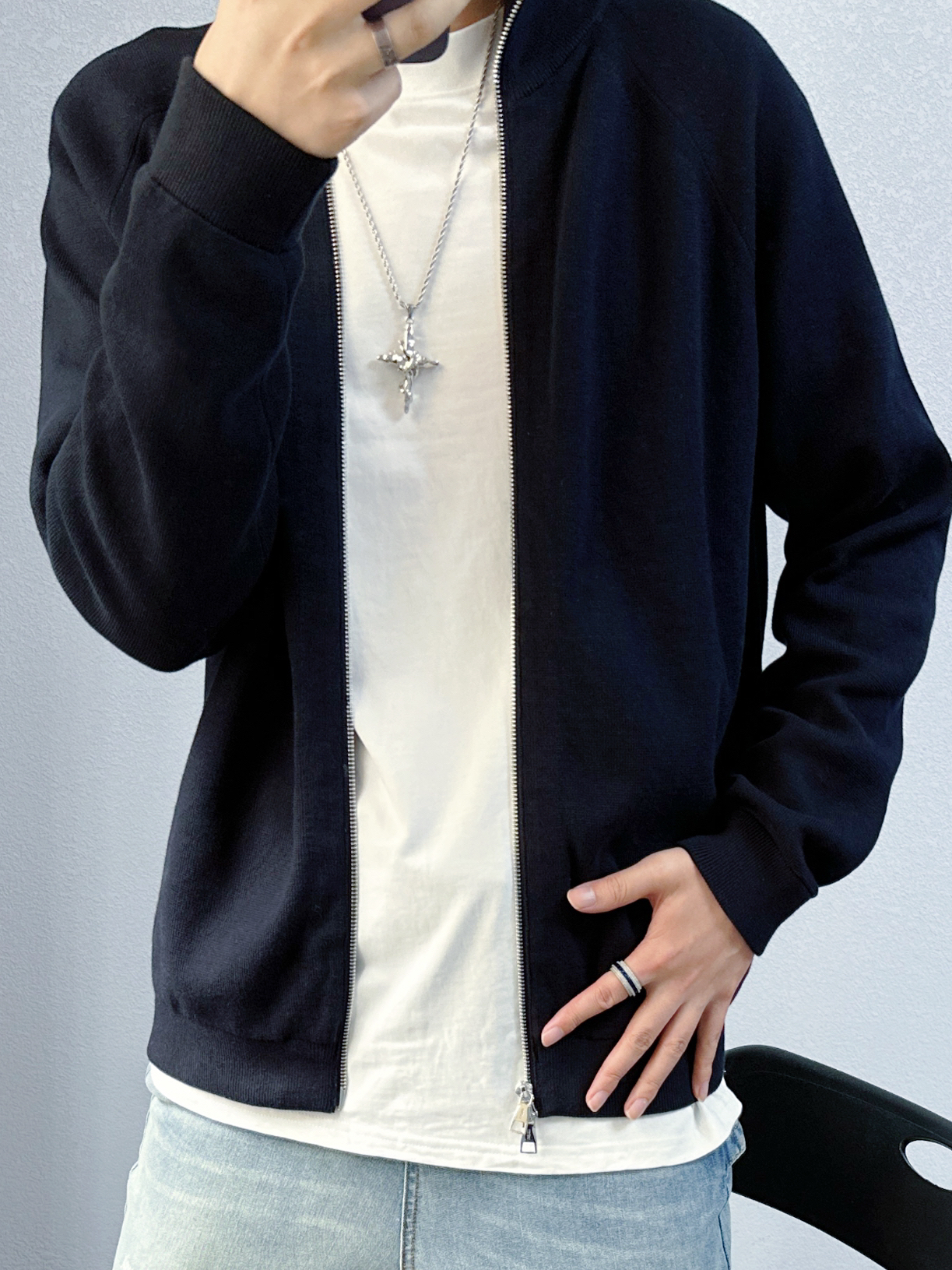 🐳:185 65 宝子们好呀, 秋冬的衣柜里毛衣不能没有姓名, 今天是秋冬休闲风穿搭, 衣服是布先生的深蓝色毛衣开衫, 简约设计百搭又高级, 面料也舒适不扎人, 不管是休闲还是商务都能驾驭, 搭配简单白T和蓝色做旧牛仔裤, 白色运动长袜搭配蓝灰配色球鞋, 出门回头率up~