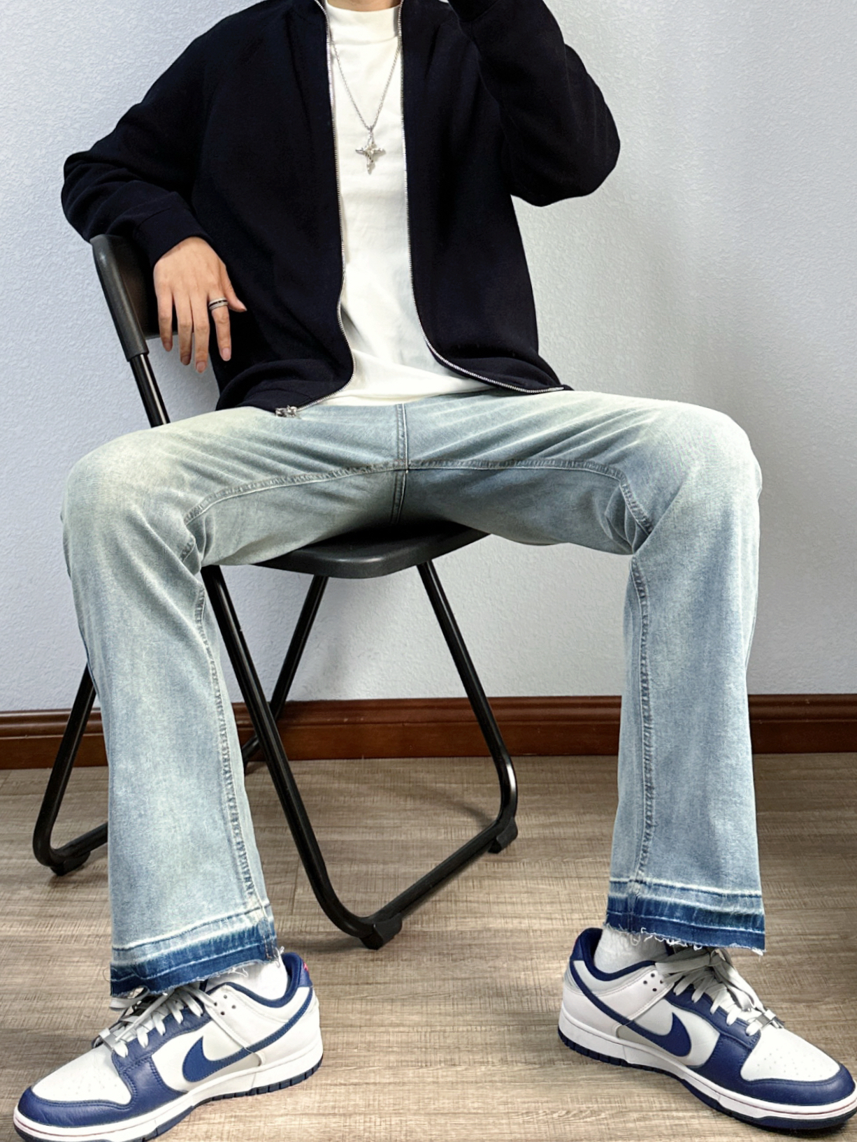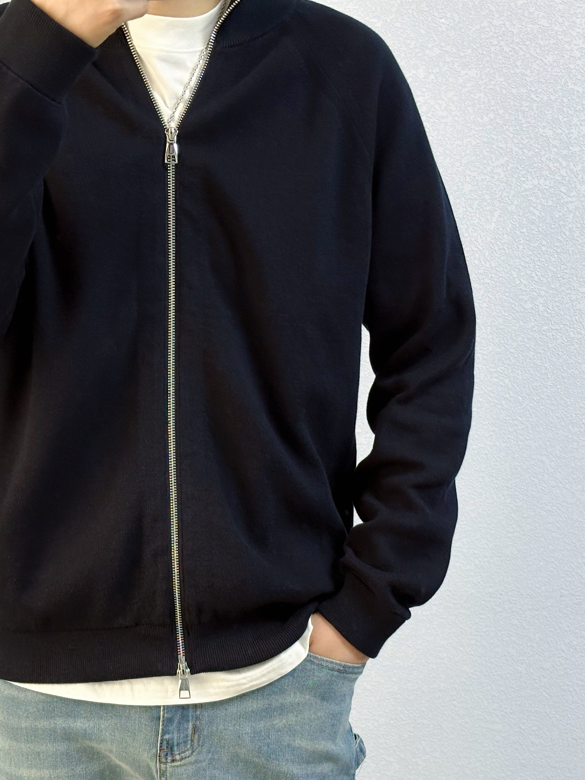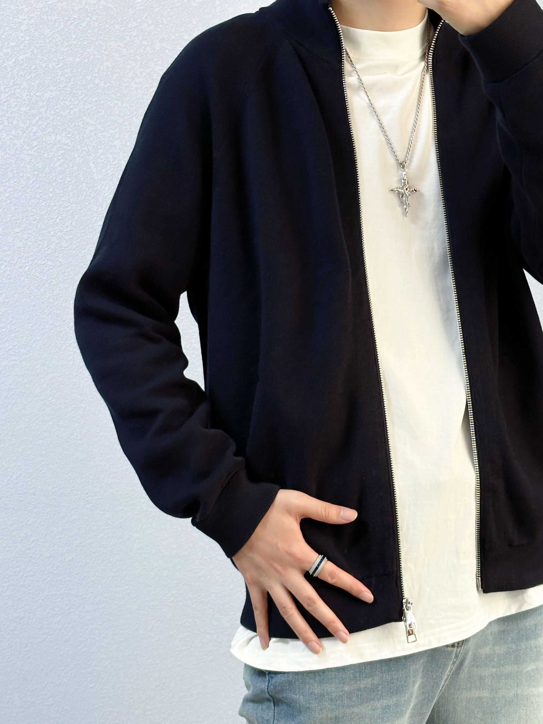🐳:185 65 宝子们好呀, 秋冬的衣柜里毛衣不能没有姓名, 今天是秋冬休闲风穿搭, 衣服是布先生的深蓝色毛衣开衫, 简约设计百搭又高级, 面料也舒适不扎人, 不管是休闲还是商务都能驾驭, 搭配简单白T和蓝色做旧牛仔裤, 白色运动长袜搭配蓝灰配色球鞋, 出门回头率up~