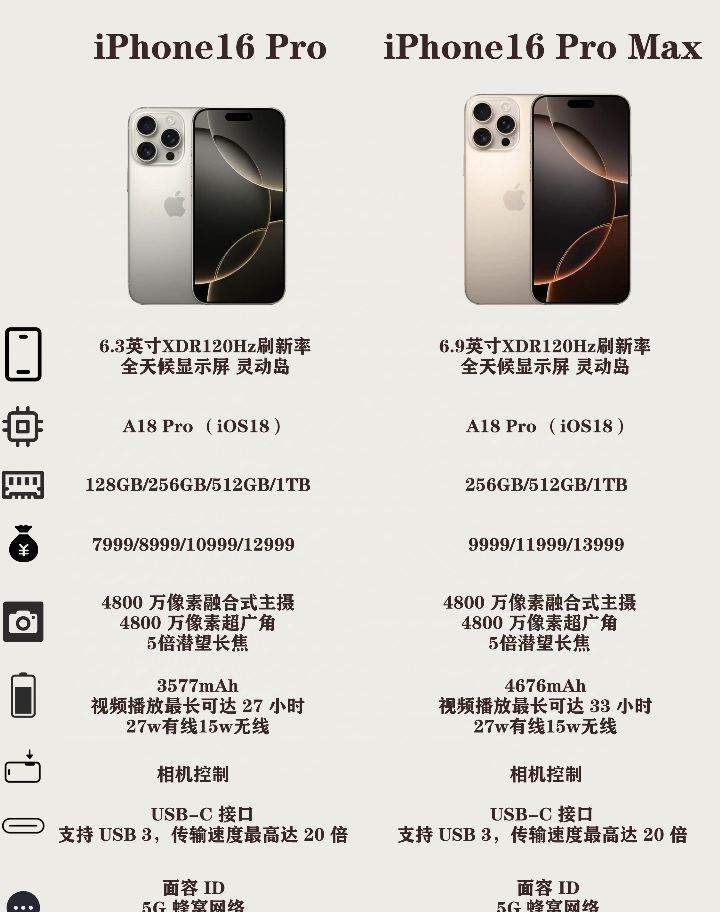全是特点!: 显示屏 1.尺寸:6.9英寸OLED全面屏 2.分辨率:2868 x 1320像素,460 ppi 3.技术:超视网膜XDR显示屏,支持ProMotion自适应刷新率技术,最高可达120Hz 4.功能:灵动岛功能,全天候显示,HDR显示,广色域显示(P3)和原彩显示 处理器 1.型号:A18 Pro芯片 2.制程:第二代3nm制程工艺 3.性能:6核CPU...