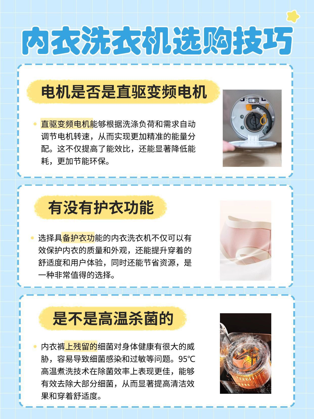 对于天天需要清洗贴身衣物的小伙伴们来说,选一款好用的内衣洗衣机是很有必要的,大家都知道如果贴身衣物清洗不干净的话是很容易细菌滋生的,长时间下来对人的健康会产生很大的影响!!今天给大家一篇讲清楚内衣洗衣机的选购技巧,新手小白也能轻松get! - 内衣洗衣机选购技巧: 一、电机是否是直驱变频电机 直驱变频电机能够根据洗涤负荷和需求自动调节电机转速,从而实现更加精准的能量分配。这不仅提高了能效比,还能显...