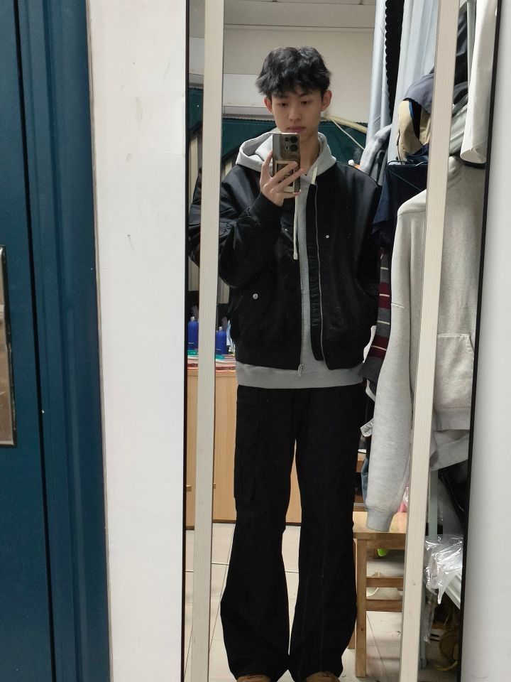 外套是近期很喜欢的一件空军夹克 很帅气 显肩宽还显腿长 里面的卫衣是抽绳设计 这么叠穿嘎嘎帅 下面搭的是一条伞兵口袋工装裤 没有哪个男孩子不喜欢