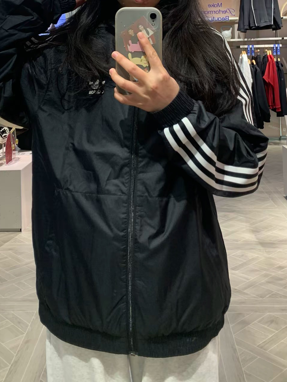 外套测评来了 三条纹拼色Logo是阿迪达斯非常经典的设计元素,辨识度极高,能展现品牌风格,面料质感舒适,内部网状结构透气性好,