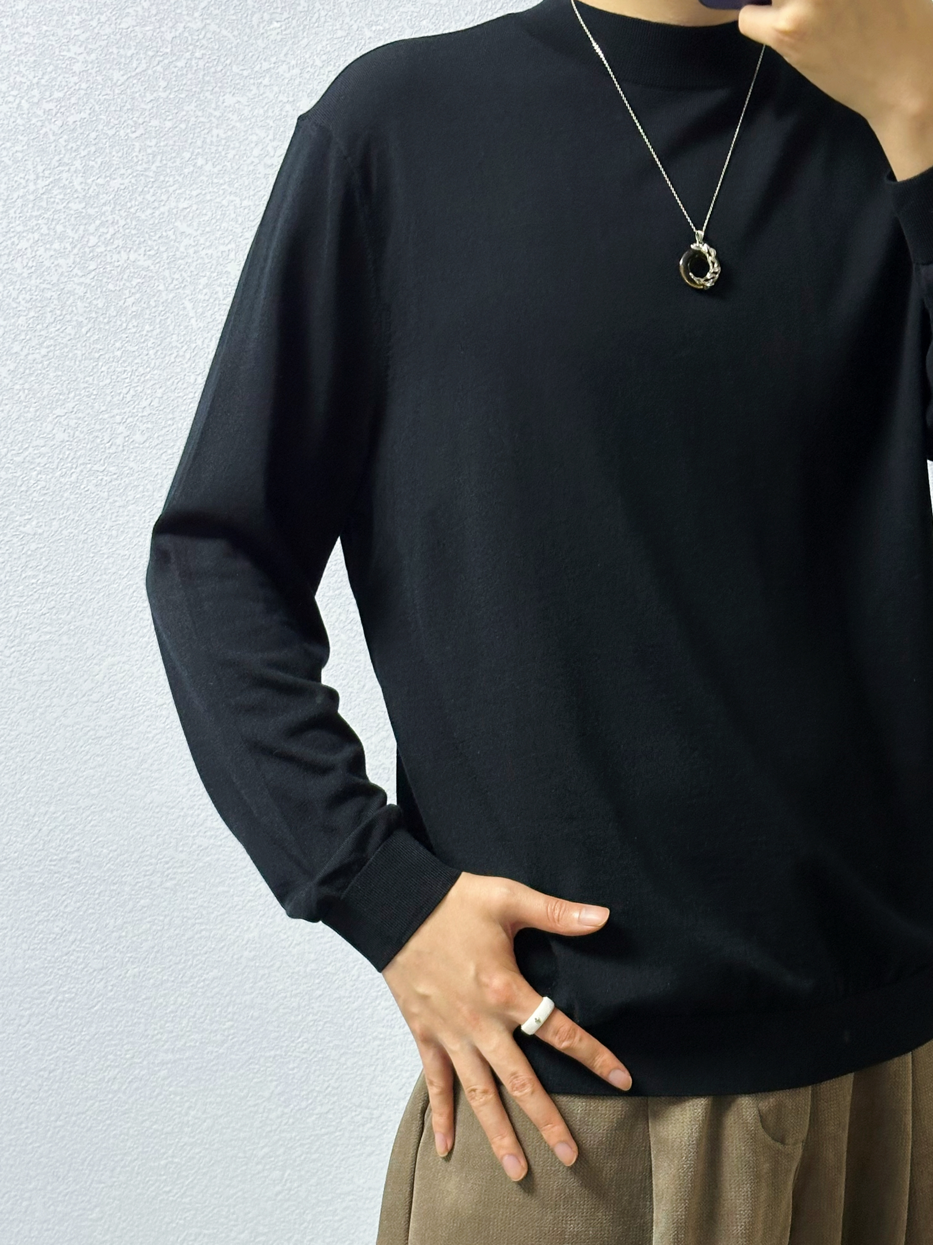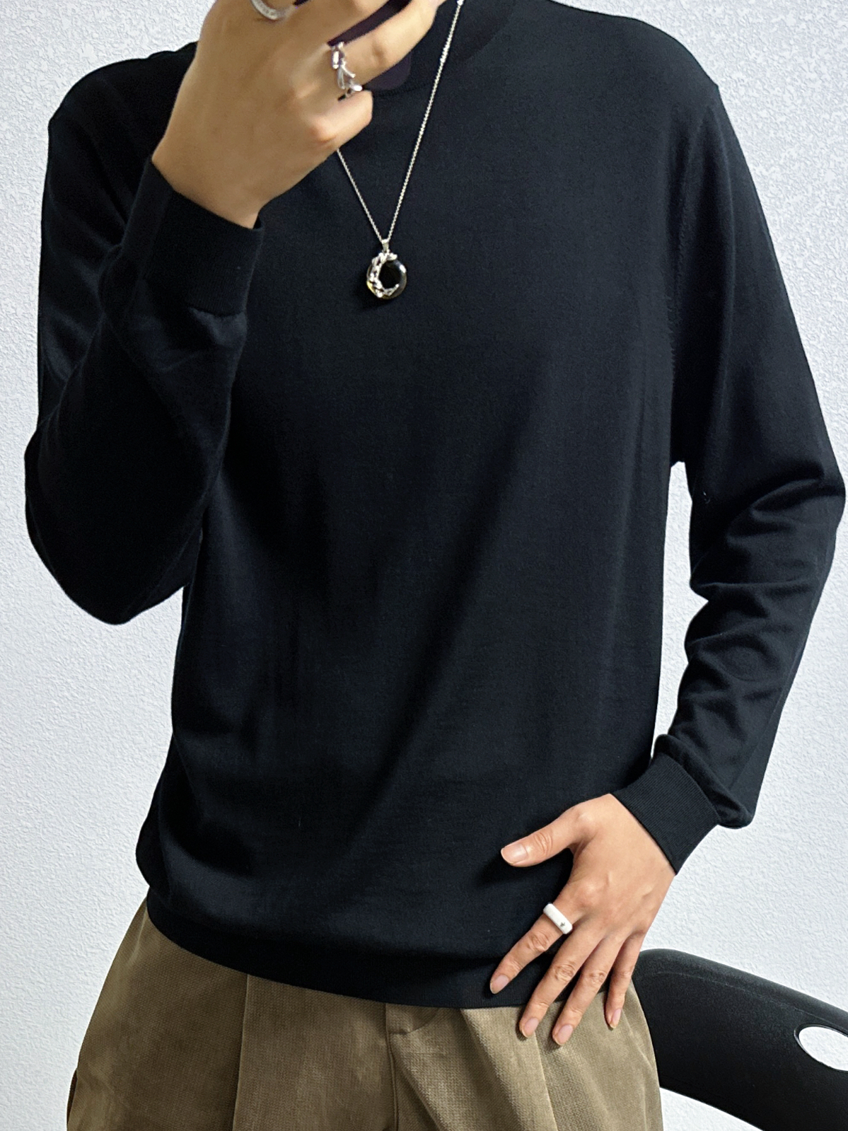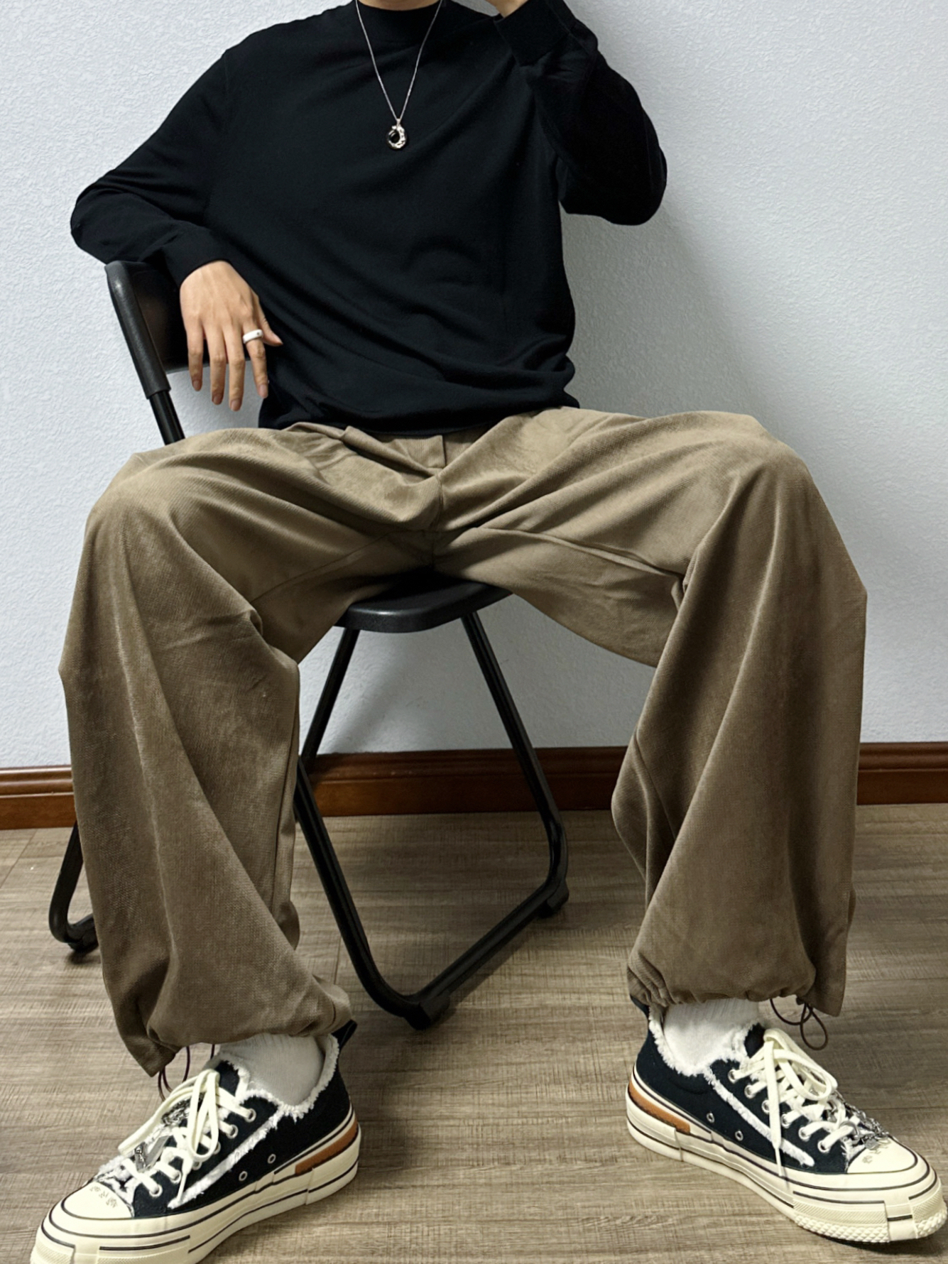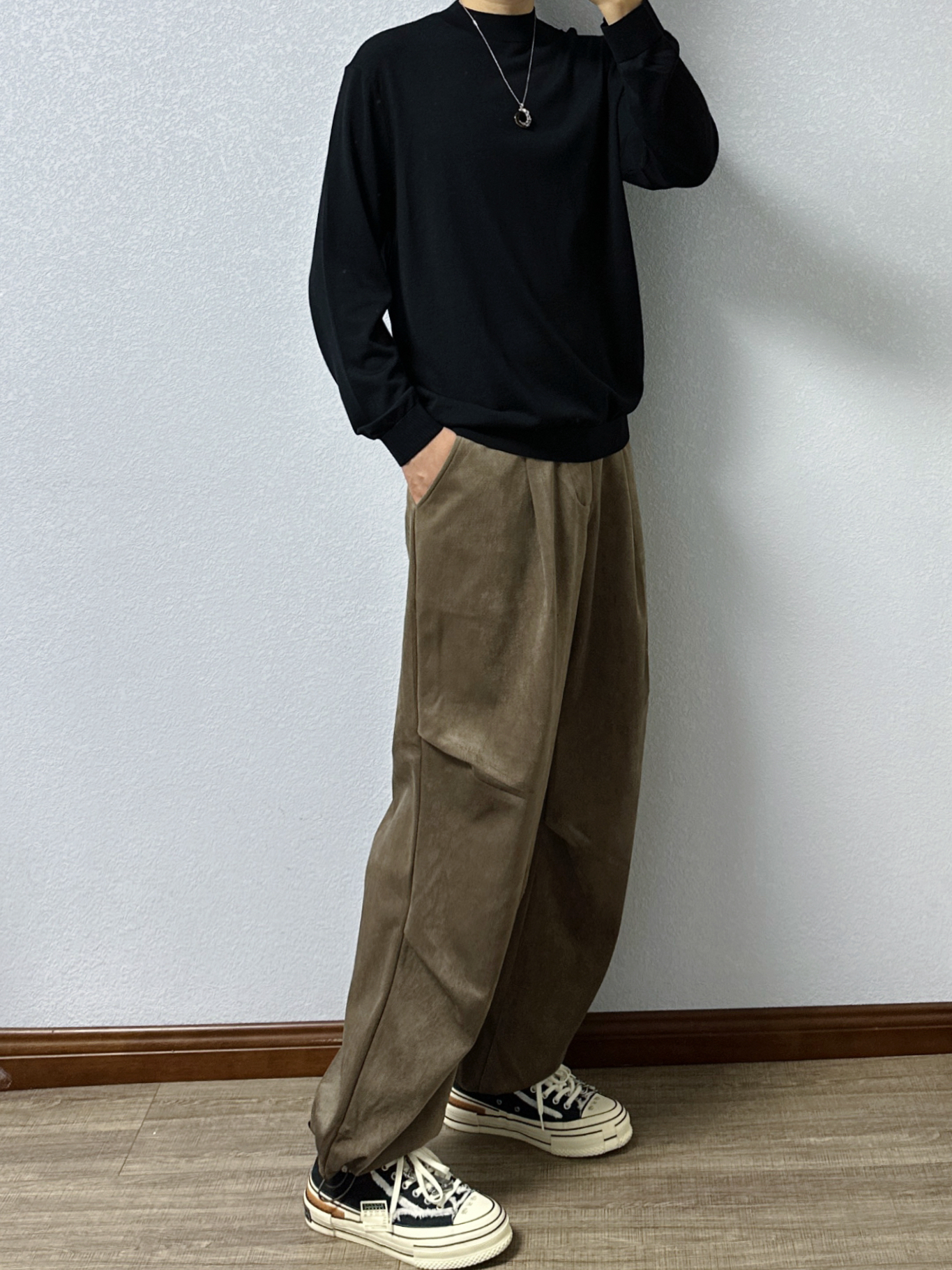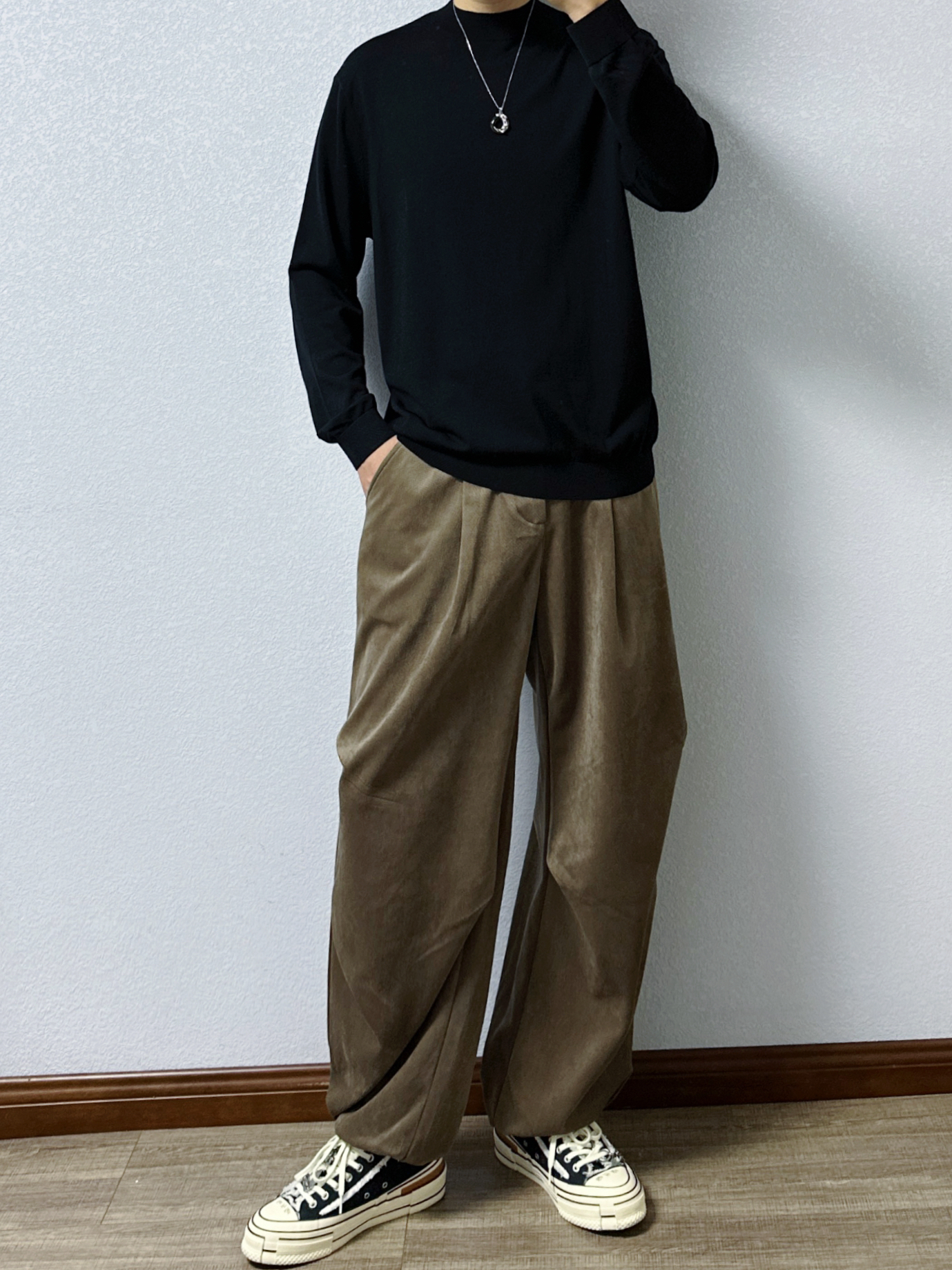 🐳:185 65 宝子们好呀, 秋天这个沉闷的季节, 通勤就chill一下, 今天是秋季休闲风穿搭, 衣服是布先生的黑色羊毛衫, 简约设计百搭又高级, 面料柔软舒适不扎人, 可以机洗也蛮方便, 搭配棕色褶皱伞兵裤, 白色运动长袜搭配黑色帆布鞋, 对简单干净的穿搭没有抵抗力~