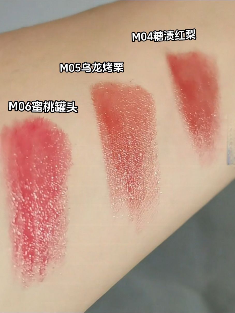 04号糖渍红梨是高级的冰透玫瑰红茶色,黄皮也能轻松驾驭,涂上可使肤色提亮一个度~ 05号乌龙烤栗是不挑皮的百搭色,显气色,深唇、浅唇的姐妹都适用,适合早八伪素颜妆感~ 06号蜜桃罐头是带一点玫调的女团色,很嫩、很显白,是橄榄皮的优选色,也可用作腮红,营造氛围感~. 该系列口红为水光镜面质地,上嘴后镜面感强,成膜较快,成膜后只掉油膜不掉色,不易沾杯、掉色,能保持较长时间的持妆效果,并且滋润度高,添加...