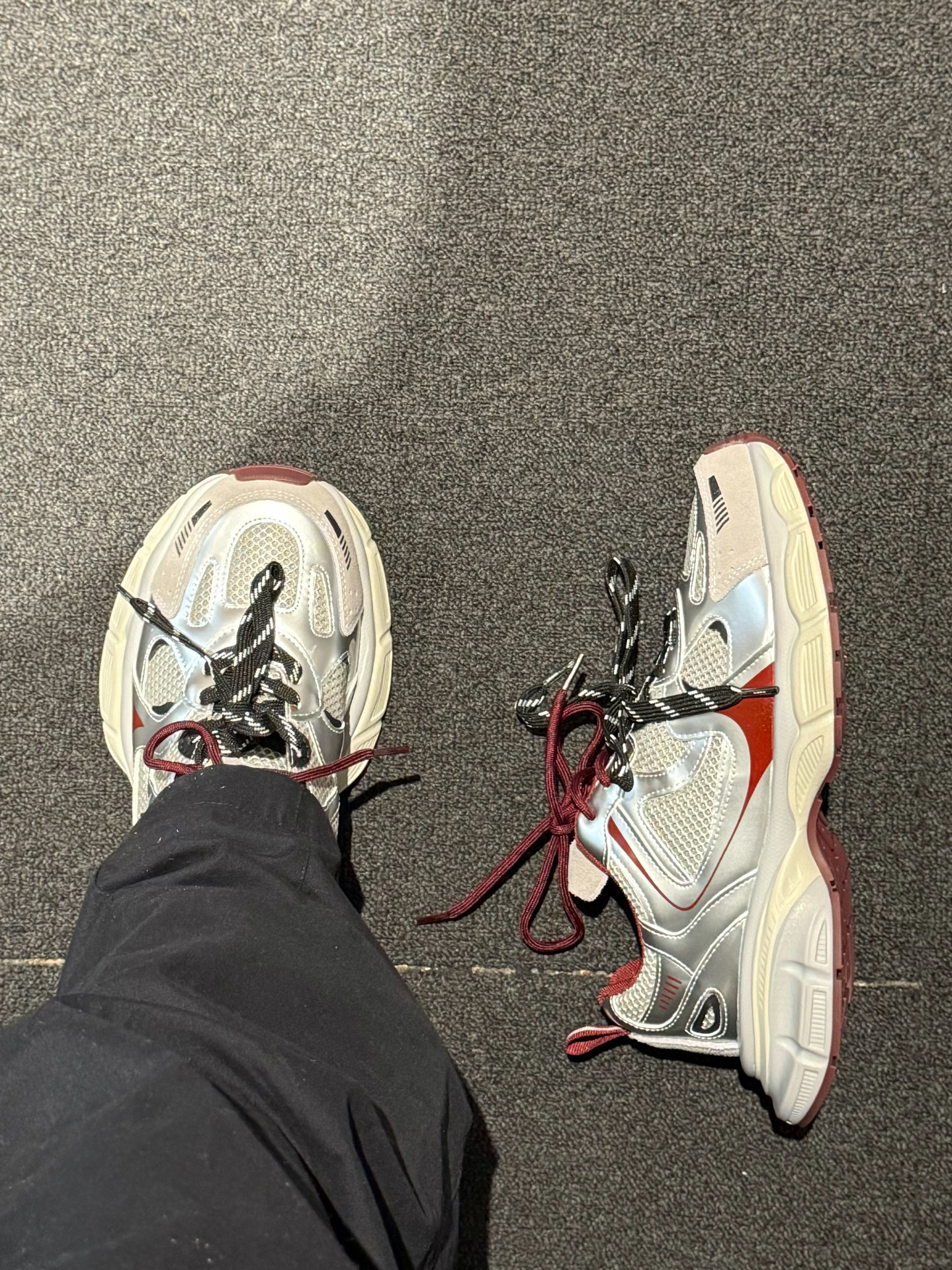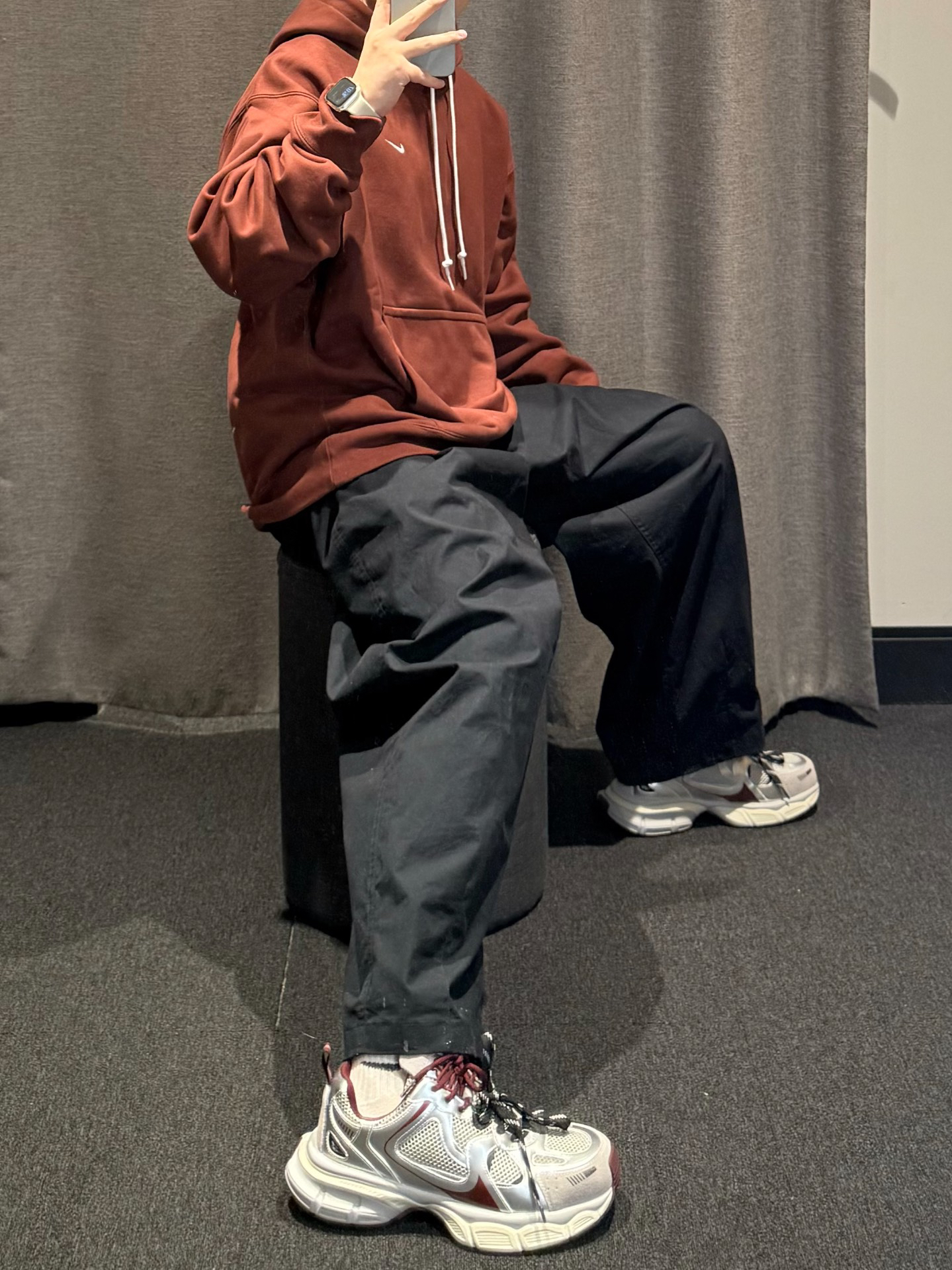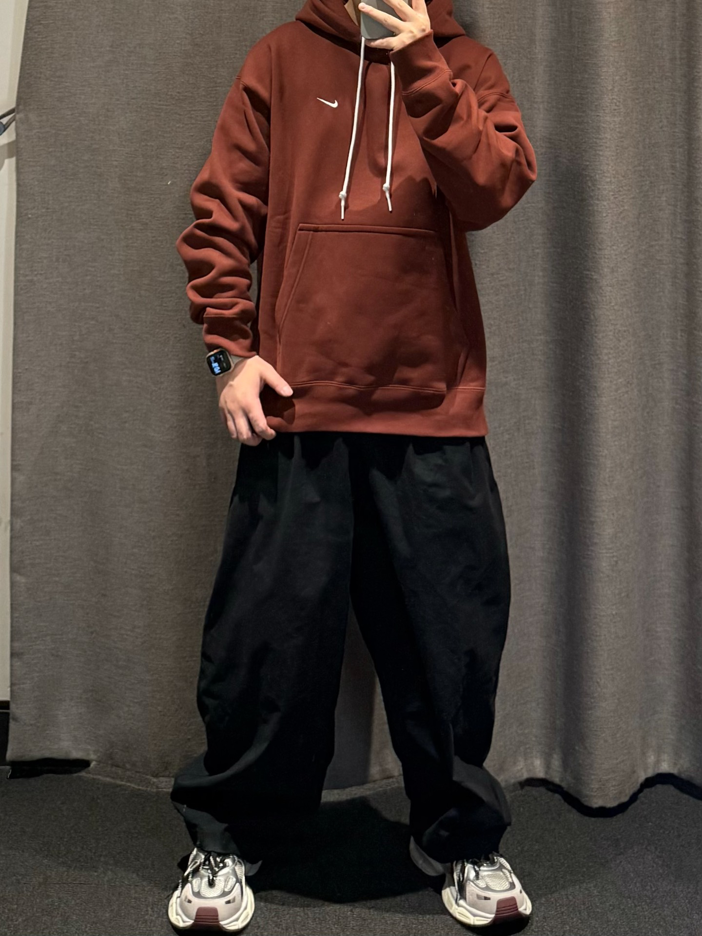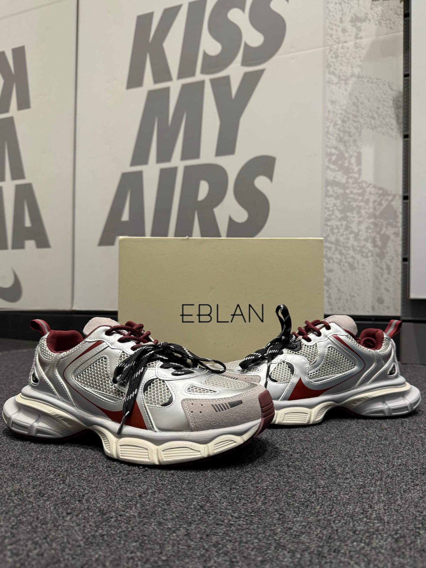 Nike 连帽卫衣➕Nike 阔腿裤➕ #EBLAN 老爹鞋,银➕红的调配让这双鞋子很适合秋日的搭配,而且鞋面整体大面积的网状鞋面,可以说是透气又柔软,中底的增高效果在日常穿着过程中也是轻松秒变大长腿,既有颜值又舒适的鞋款真的爱惨了,不论是日常通勤还是运动、上班都是一个不错的选择。