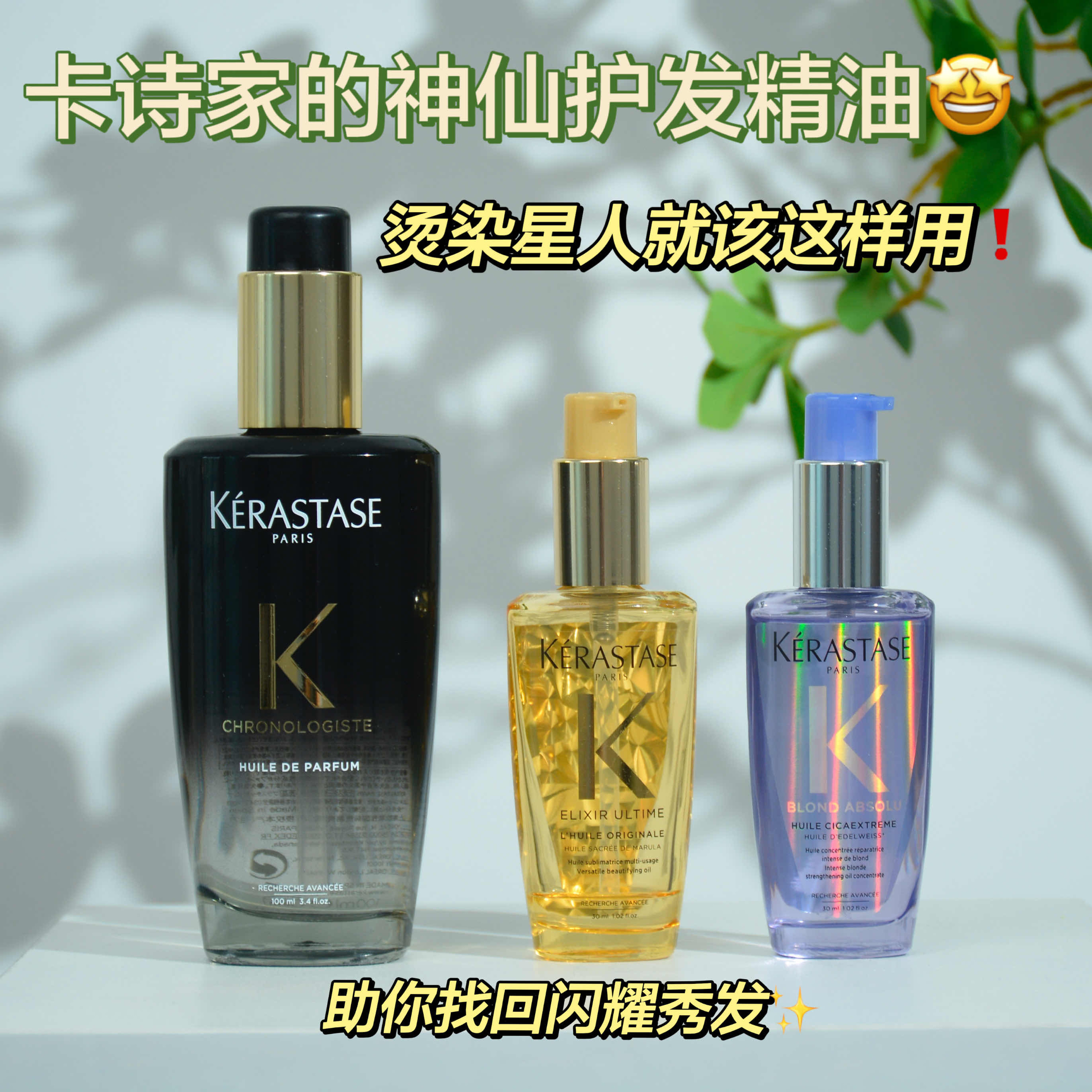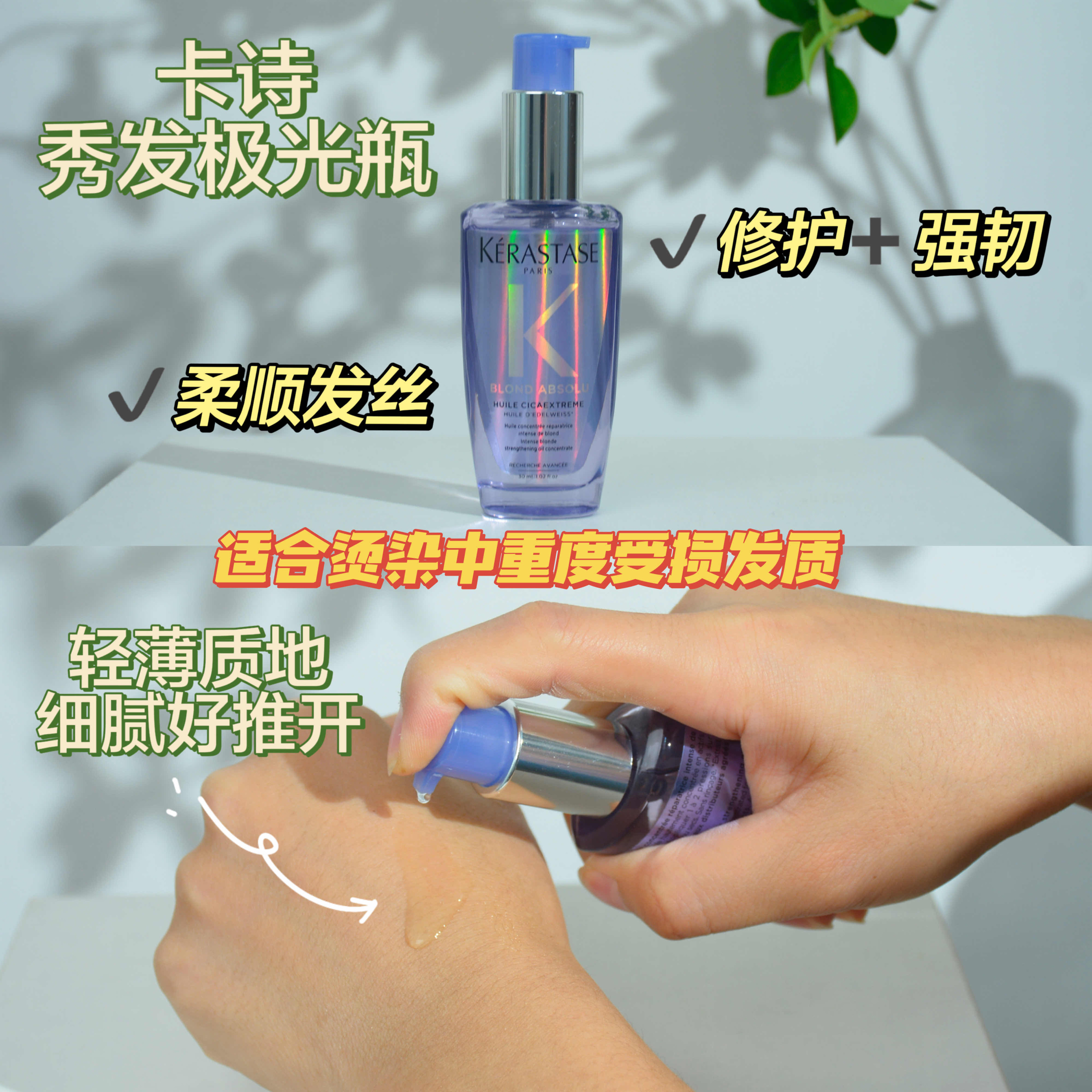 精致潮流的烫染星人们都“善变”,发型要变,发色也要变~ 一通折腾后头发毛躁、黯淡无光等问题接踵而至 频繁烫染后秀发应该如何护理呢? 分享三款超好用的护发精油给大家~ 卡诗秀发高光瓶 适合干枯稻草头 含珍贵山茶花至臻精粹+珍稀马鲁拉焕活精粹 能抚平干枯毛躁,增添头发亮泽度 让秀发恢复亮泽闪耀! 卡诗秀发极光瓶 烫染重度爱好者的受损发丝有它就不怕! 能快速紧急修护受损发丝 添加...