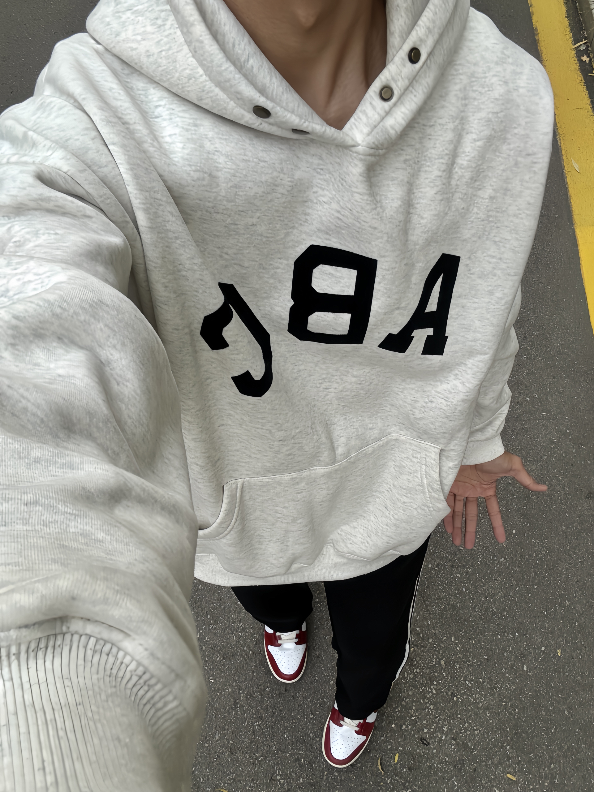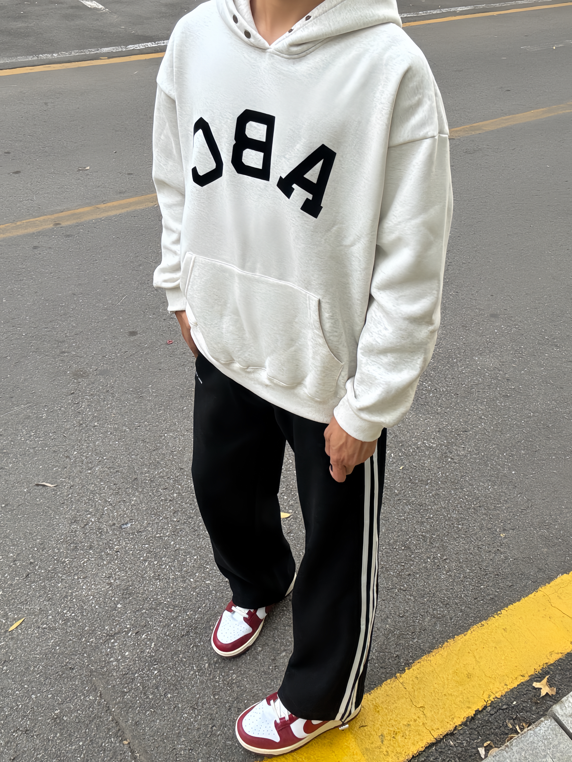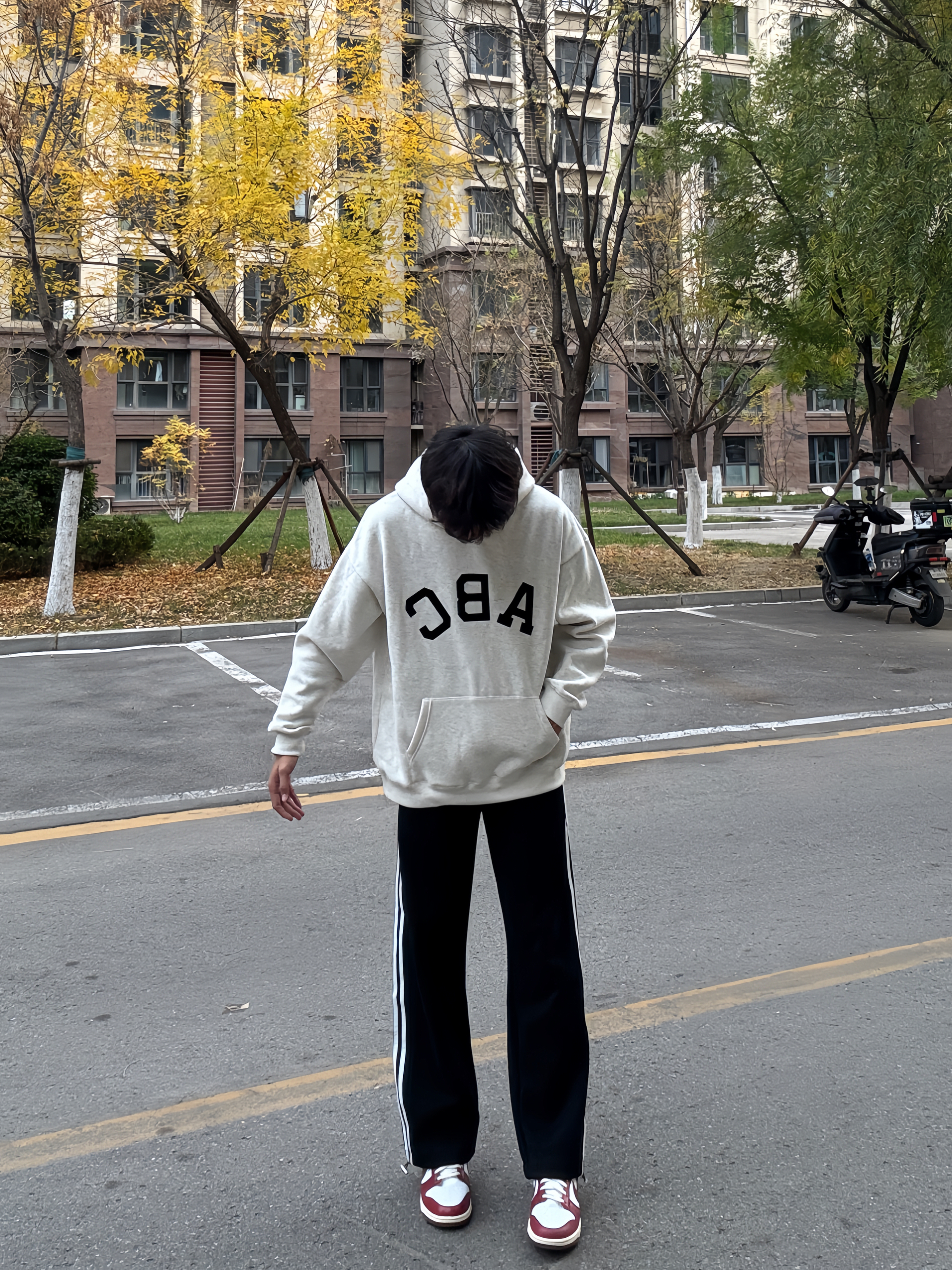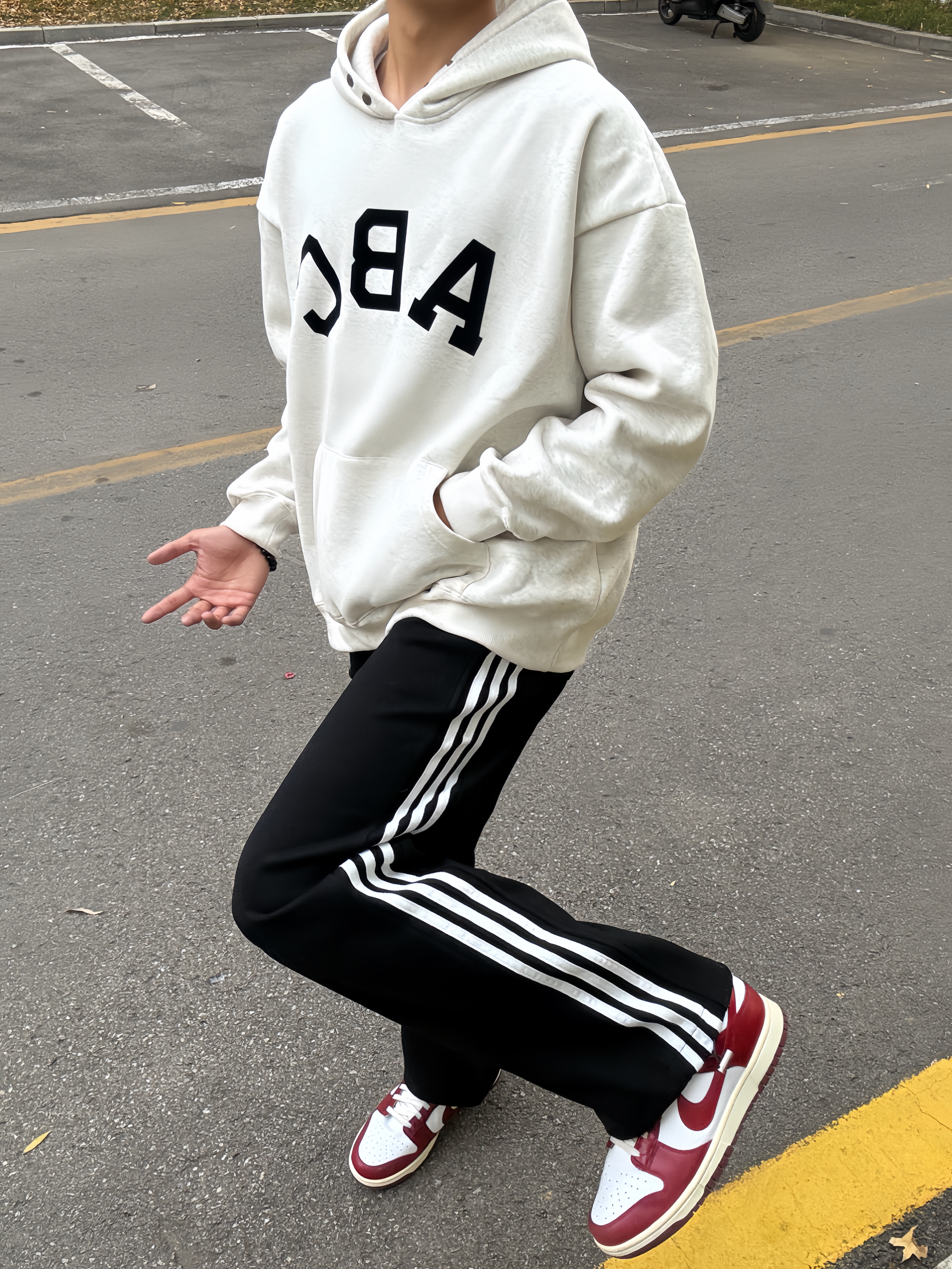 180 130|OOTD穿搭分享 👔|巨帅的字母印花卫衣呀,正面ABClogo设计还是很简约的款式啦,好喜欢领口的纽扣设计,好适合秋冬叠穿,漏出来超好看,还是重磅加棉的款式,穿起来软乎乎的好舒服~ 👖|好喜欢三条杠条纹休闲裤,美式的感觉又带点休闲运动风,比较厚实的面料,一年四季都能穿,直筒版型不挑身材,裤脚还有抽绳设计,爱啦~