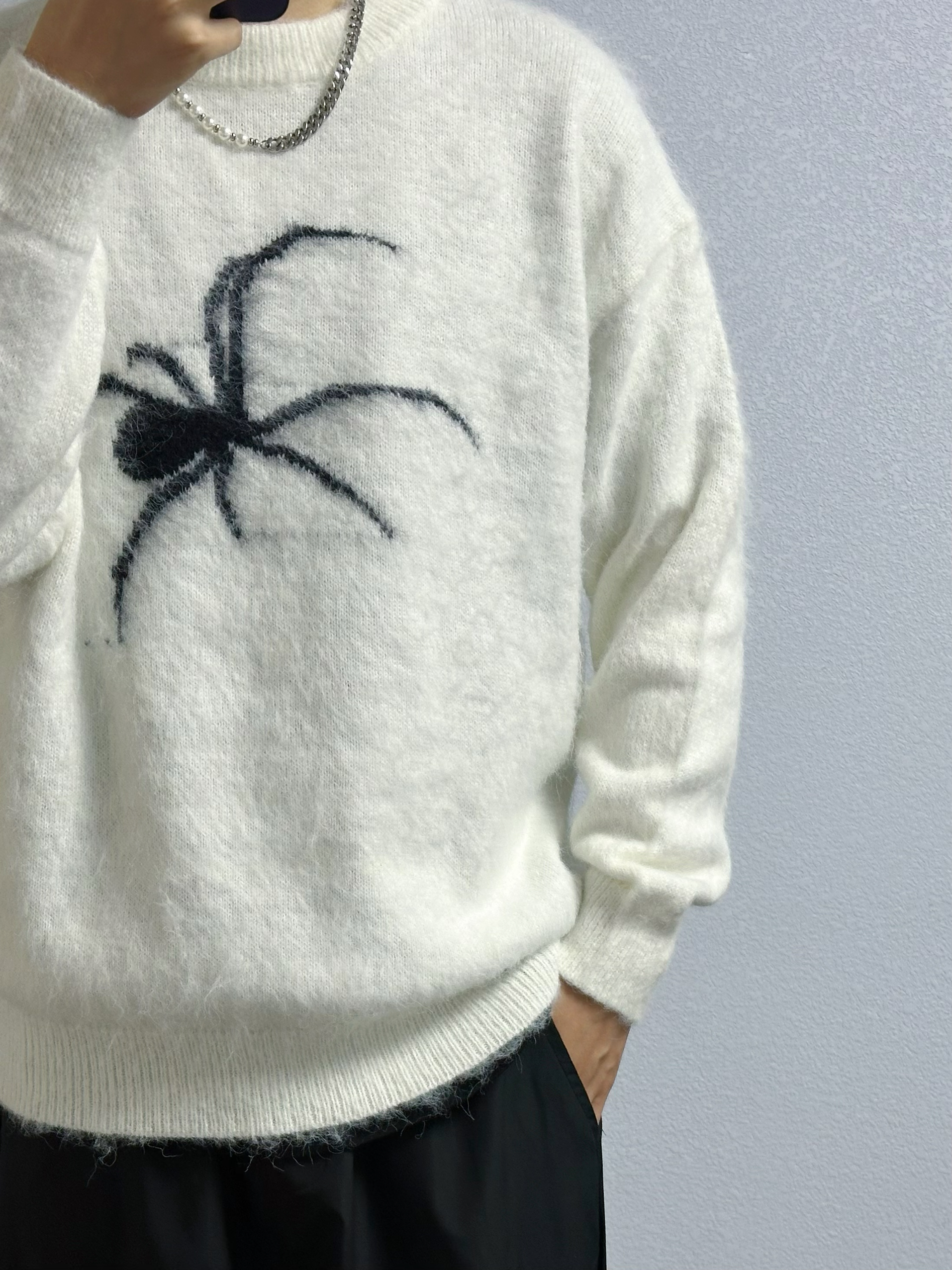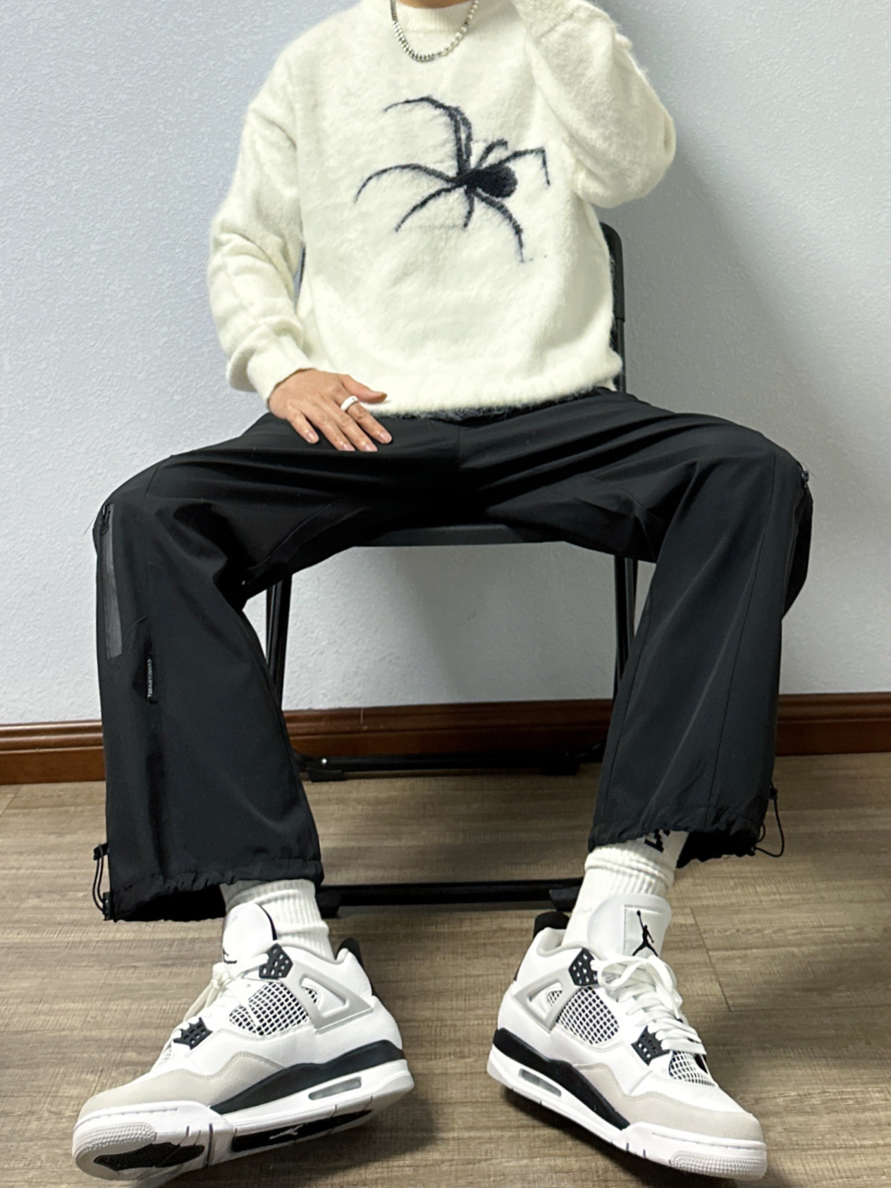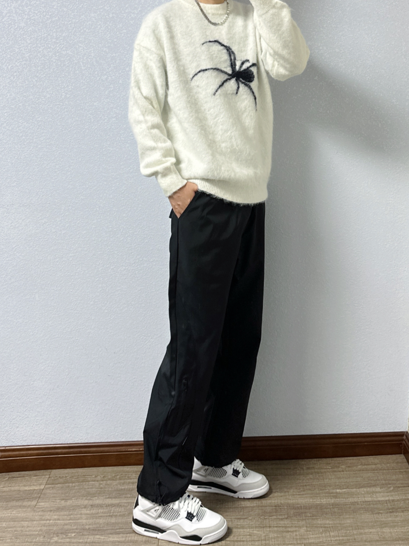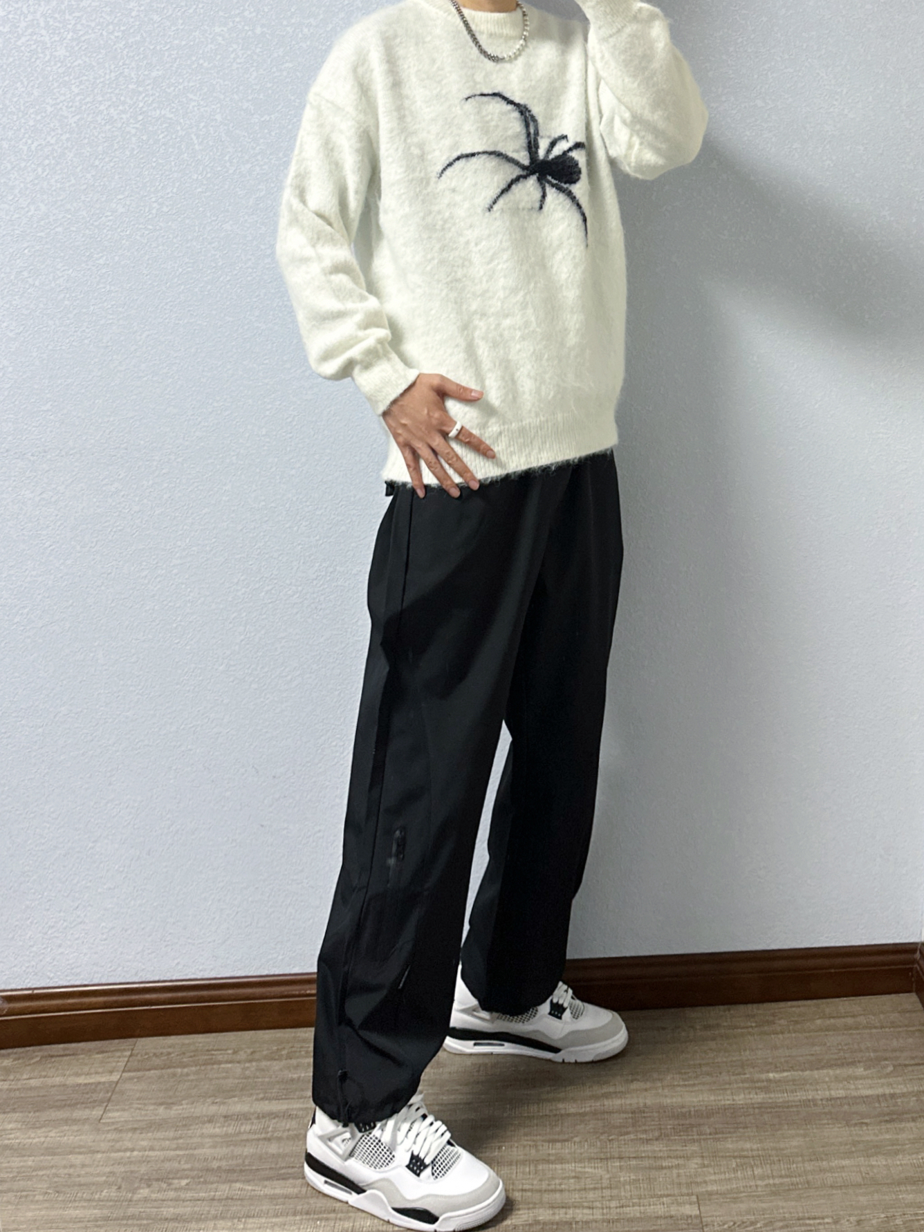 🐳:185 65 宝子们好呀, 秋天就是毛衣的季节, 今天是秋季街头风穿搭, 衣服是白色蜘蛛印花毛衣, 搭配黑色机能风休闲裤, 白色运动长袜搭配黑白配色球鞋, 街头氛围感up~