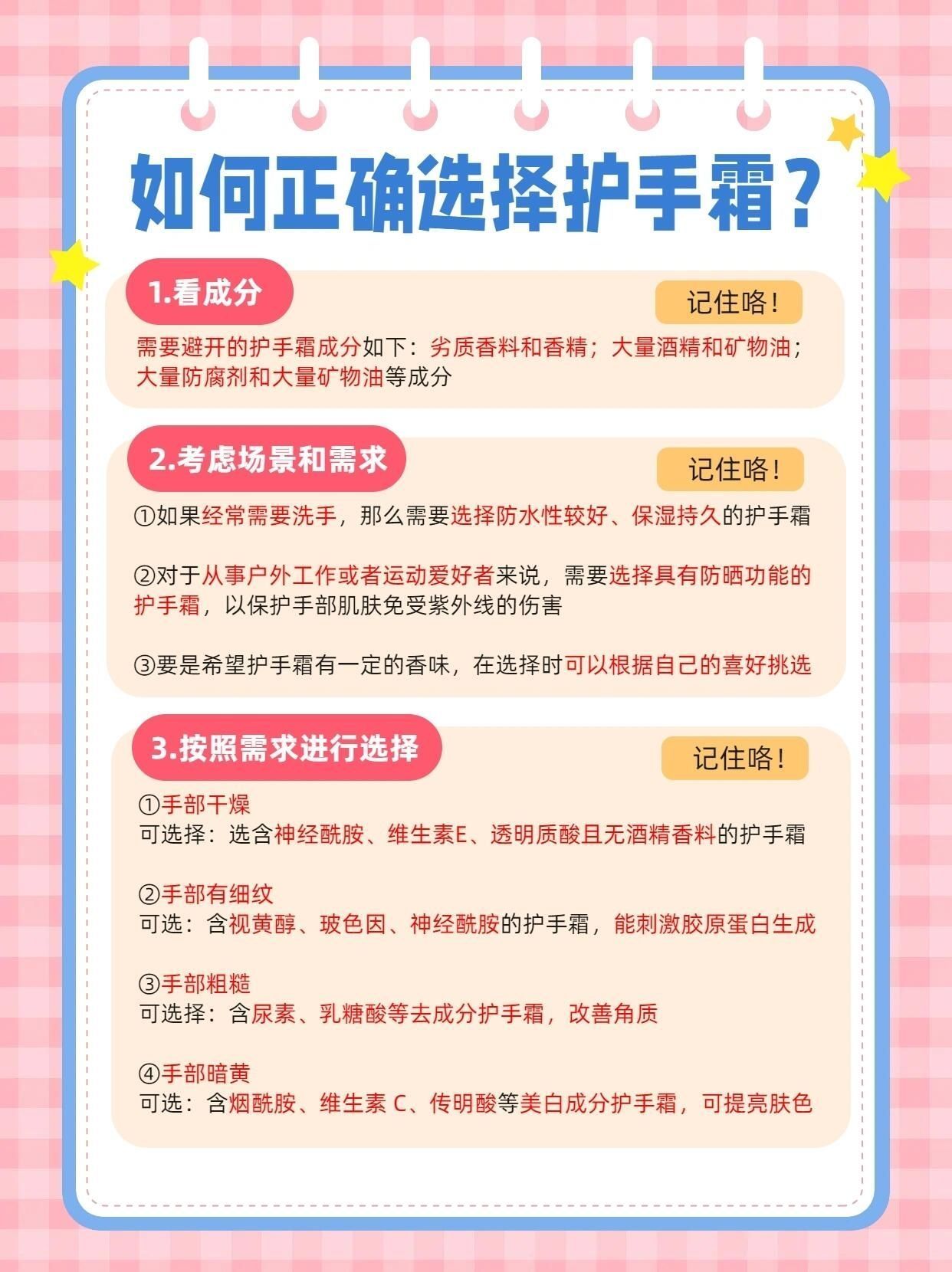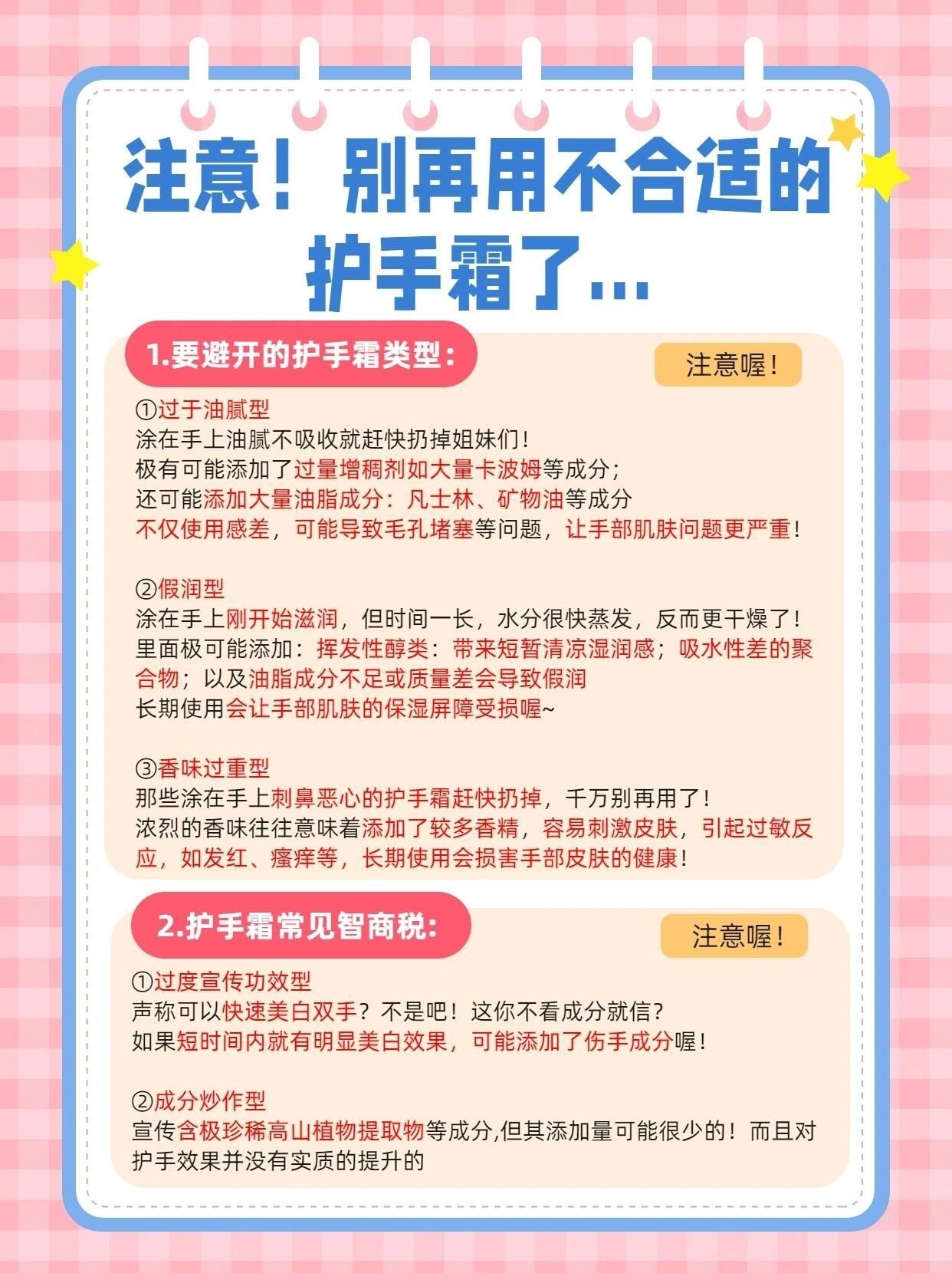 💥注意了姐妹们!别再用不合适的护手霜了! 那种涂了像糊猪油,油腻腻还不吸收的护手霜,和号称滋润却让双手越用越干的,赶快扔掉吧!😱 想要选对真正的宝藏好物护手霜的姐妹赶紧码住!不吃亏!💕 - ⭐要避开的护手霜类型: ①过于油腻型 💥涂在手上油腻不吸收就赶快扔掉姐妹们! 极有可能添加了过量增稠剂如大量卡波姆等成分; 还可能添加大量油脂成分:凡士林、矿物油等成分 不仅使用感差,可能导致毛孔堵塞等问题,让...