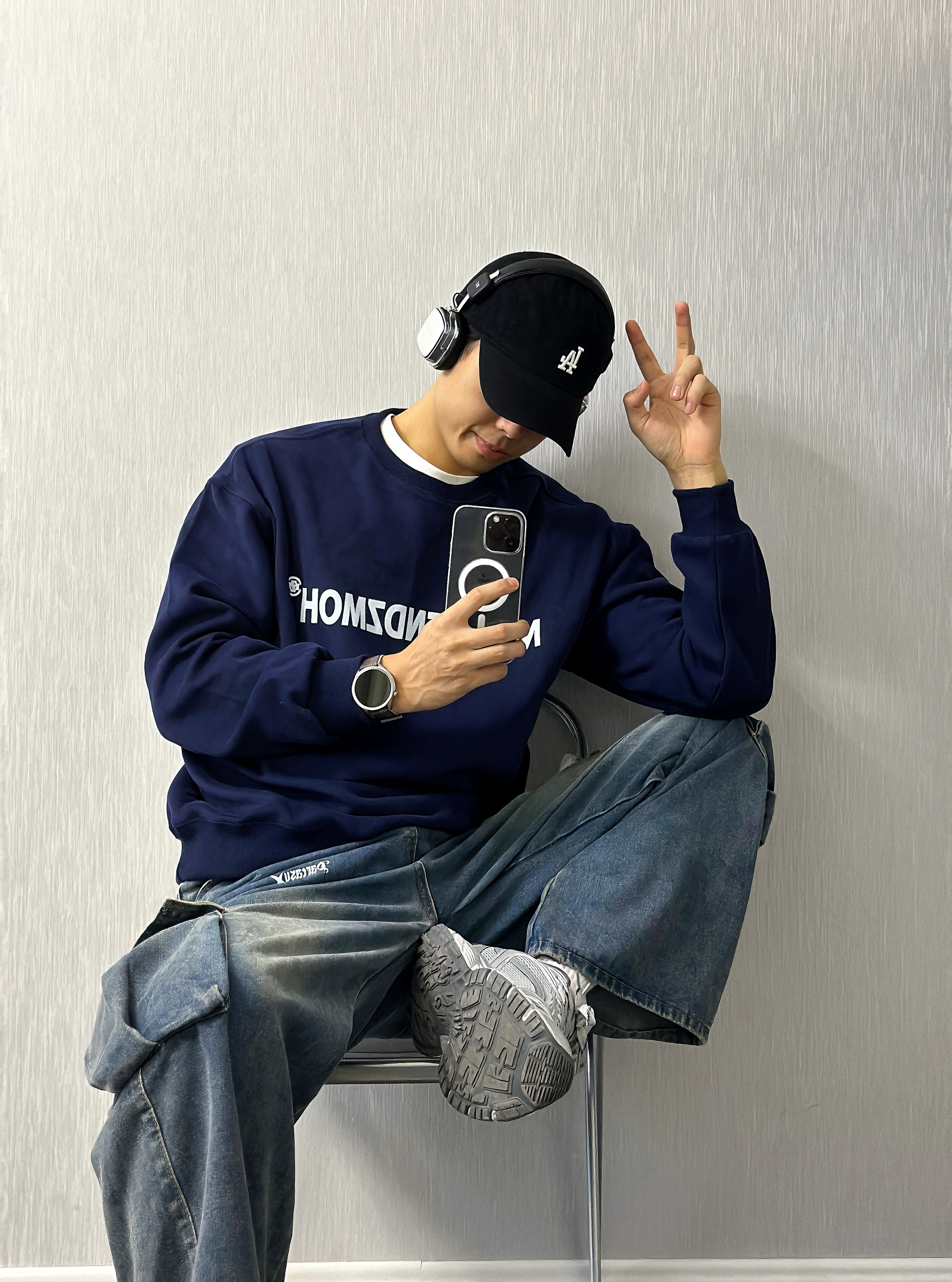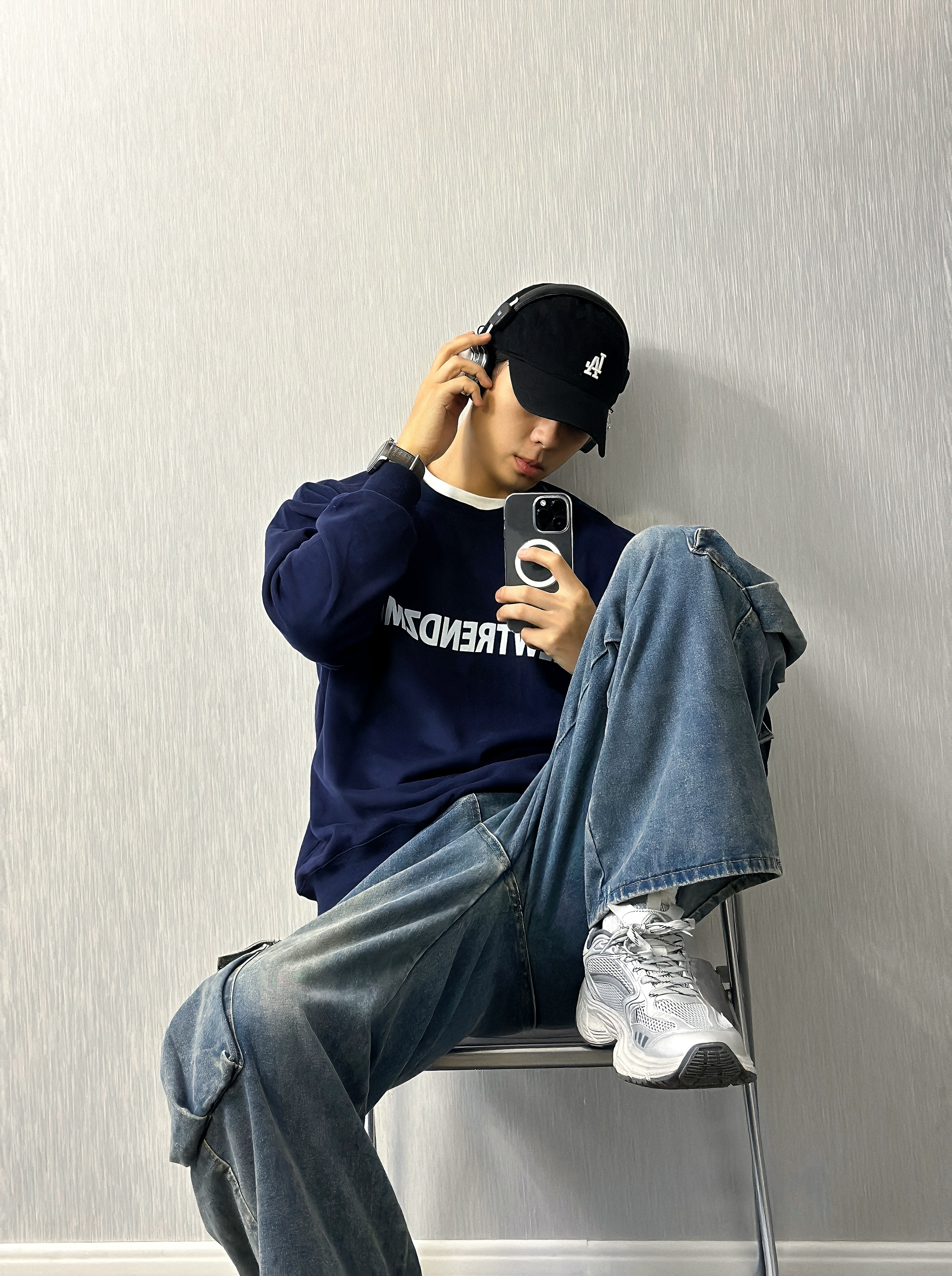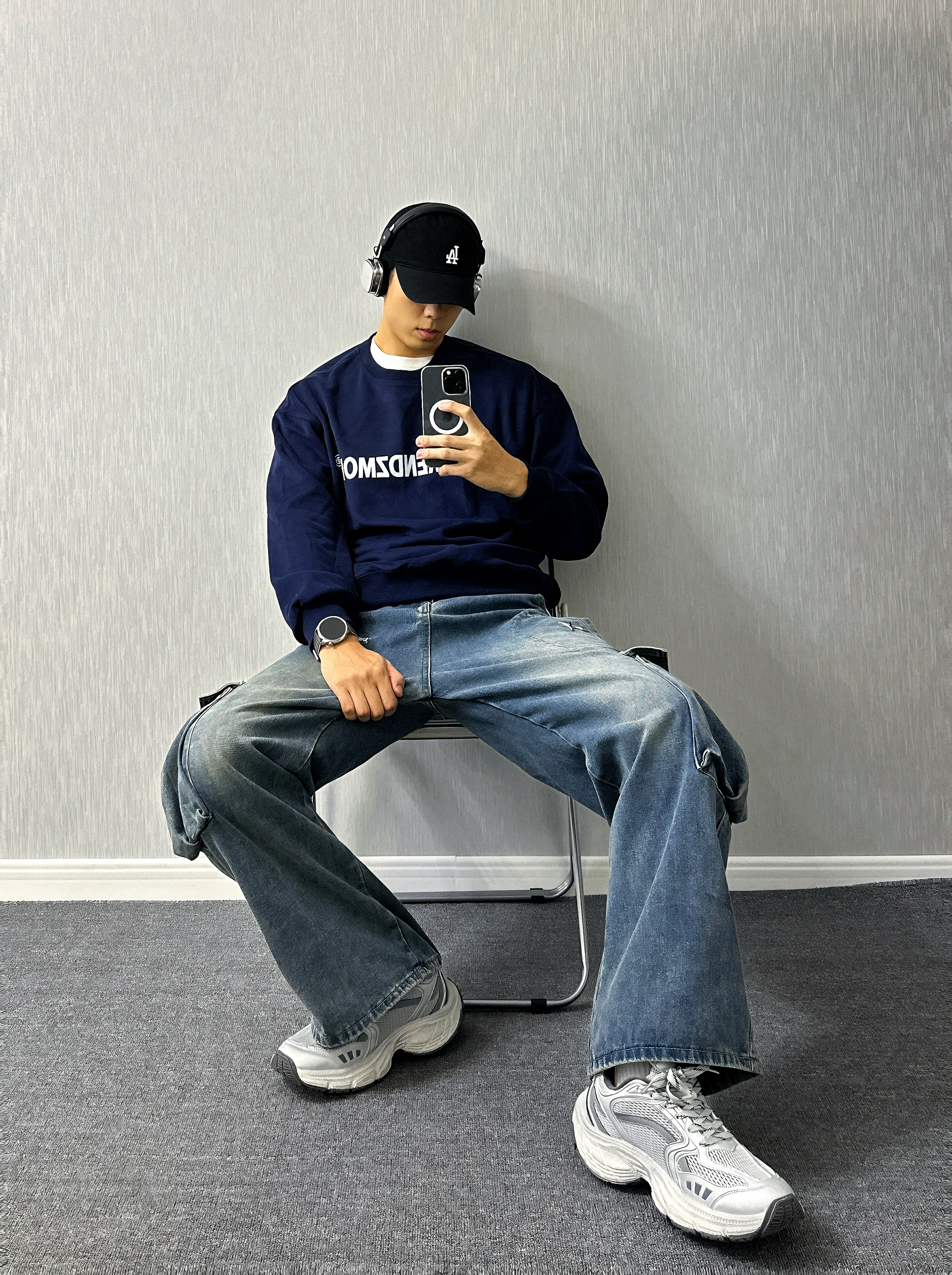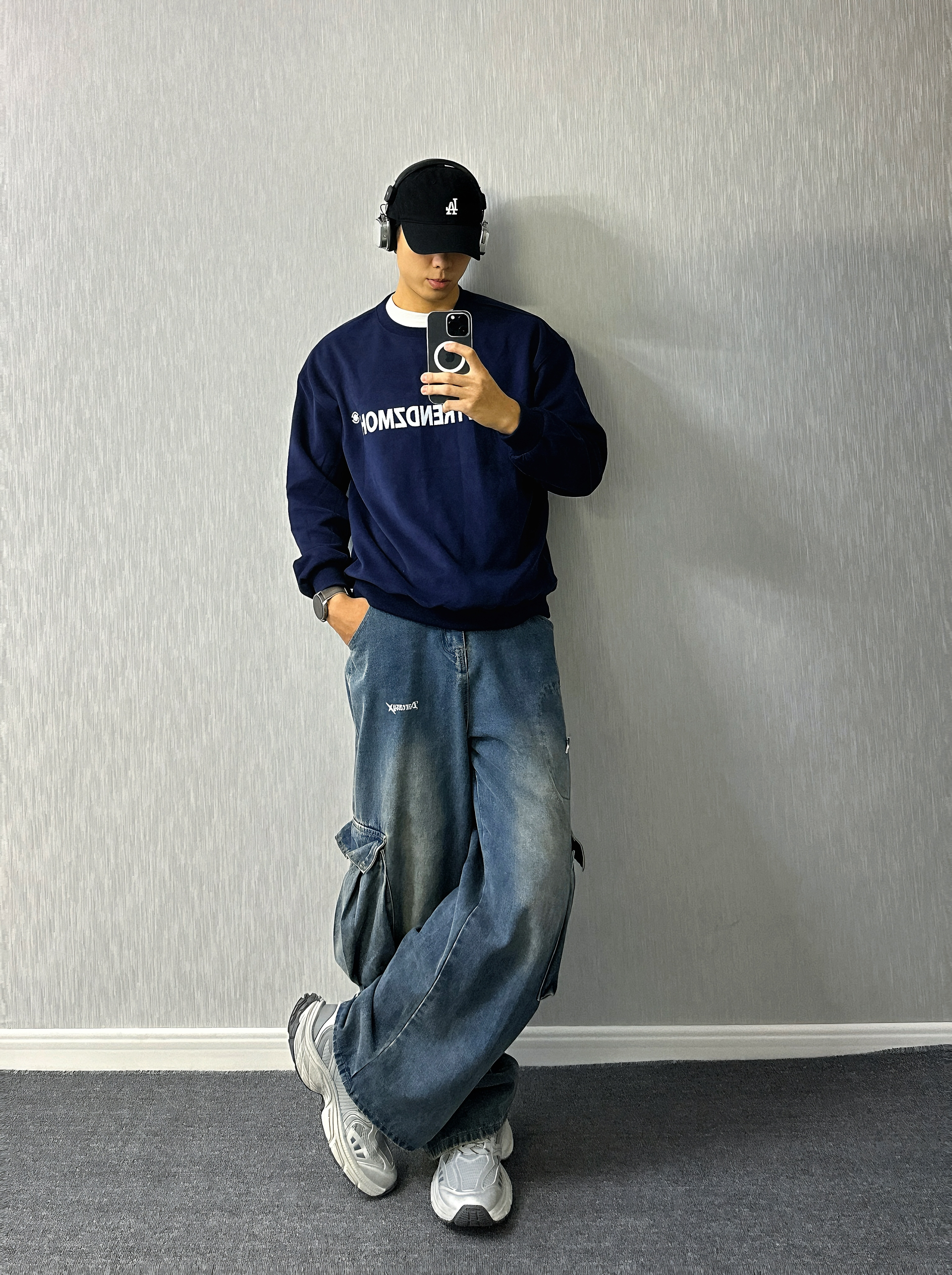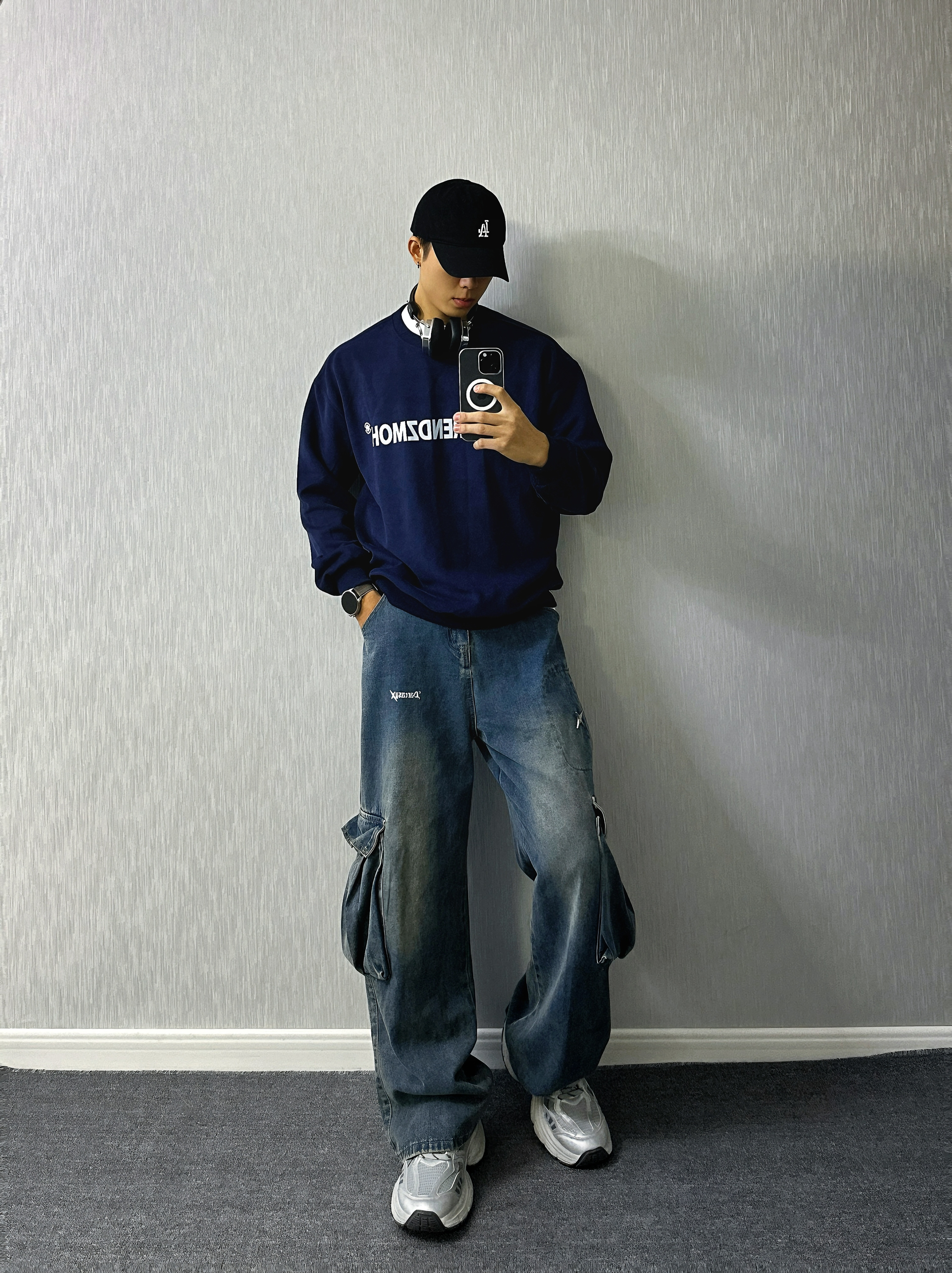 🧍♂️ :嗨喽∽ 小羊的秋冬穿搭分享来咯⬇️ 🧢:logo印花黑色鸭舌帽✅ 👔:字母logo印花 藏青色卫衣✅ 👖:蓝色直筒阔腿牛仔裤✅ 👟:银色老爹鞋✅