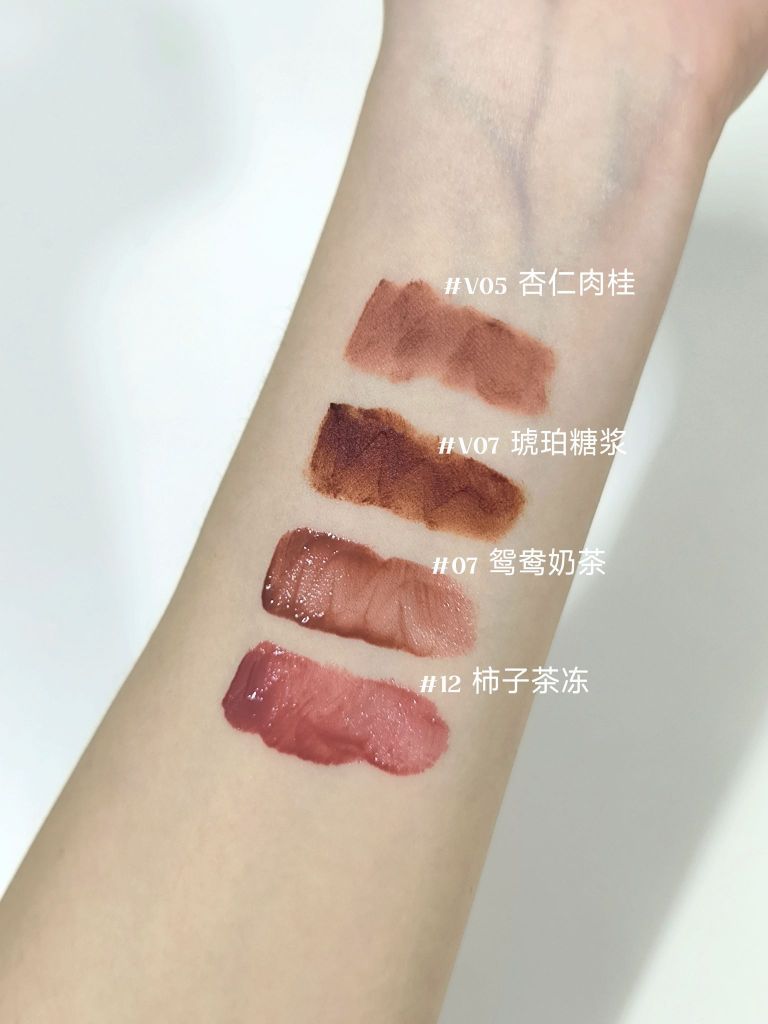 两种不同质地,哑光丝绒和镜面 四种颜色,不同的质地,日常妆容都能满足 质地轻薄,显色度不错,也不卡唇纹 #V05杏仁奶桂:偏棕调的肉桂杏色,提气色又很独特#V07琥珀糖浆:黄皮也hold住的焦糖拿铁色 #07鸳鸯奶茶:百搭不挑皮,怎么涂都好看 #12世子茶冻:温柔又纯欲,很适合约会或甜妹