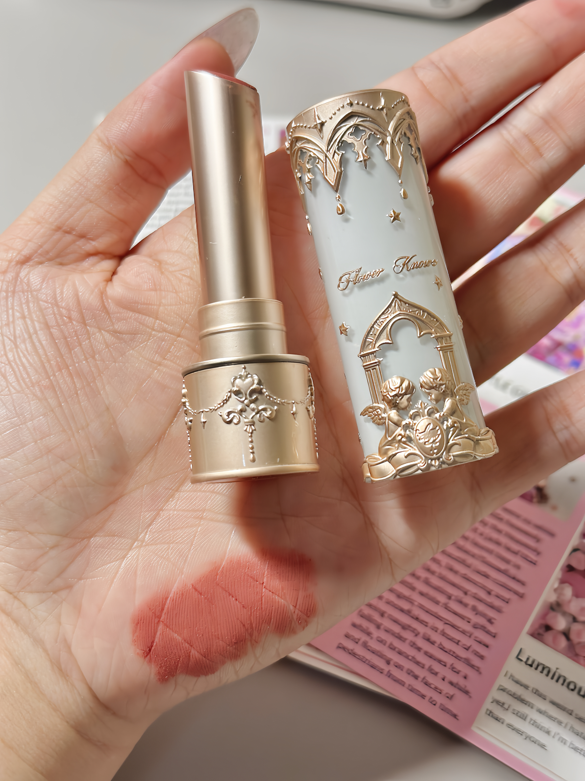 花知晓的包装太懂女生心思啦! 奢华中带着少女的青涩与美好 今上嘴唇泥质地超级棒,奶茶色很好推开不挑人也不挑妆,简直是伪素颜的通勤早八福音!上嘴后是哑雾质地 涂完之后感觉嘴唇丝滑又显嫩显白真的巨喜欢! 9C03炽天使这款,奶咖色带一点红豆的感觉, 黄皮早八通勤选它绝对没错! 气质显白一绝,简直美到爆炸!