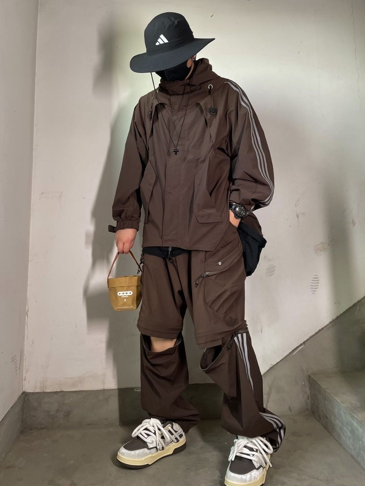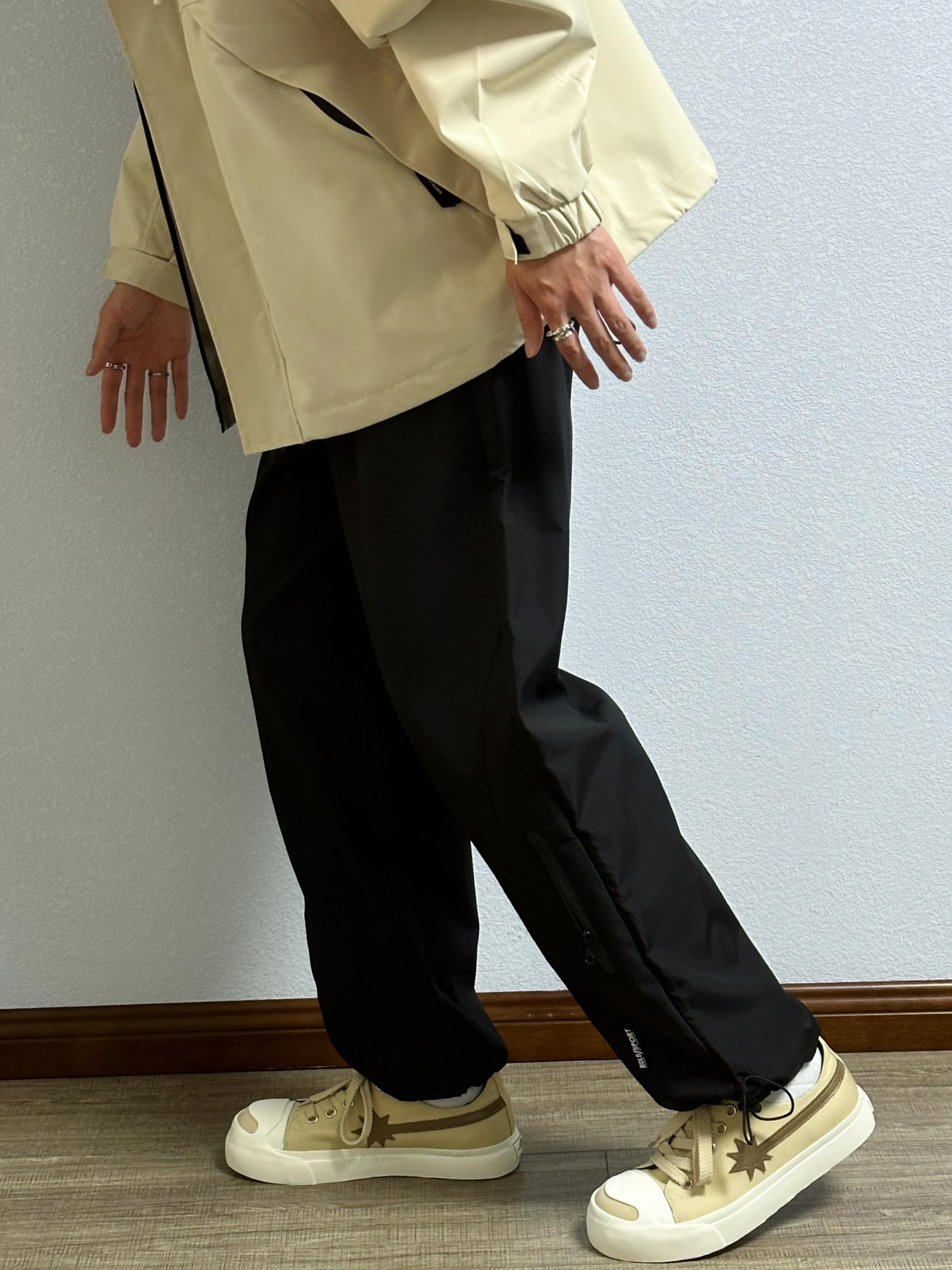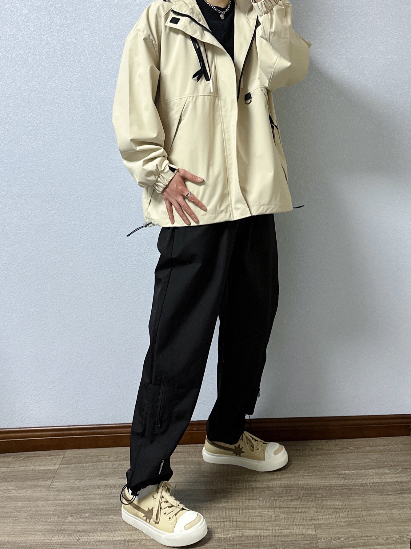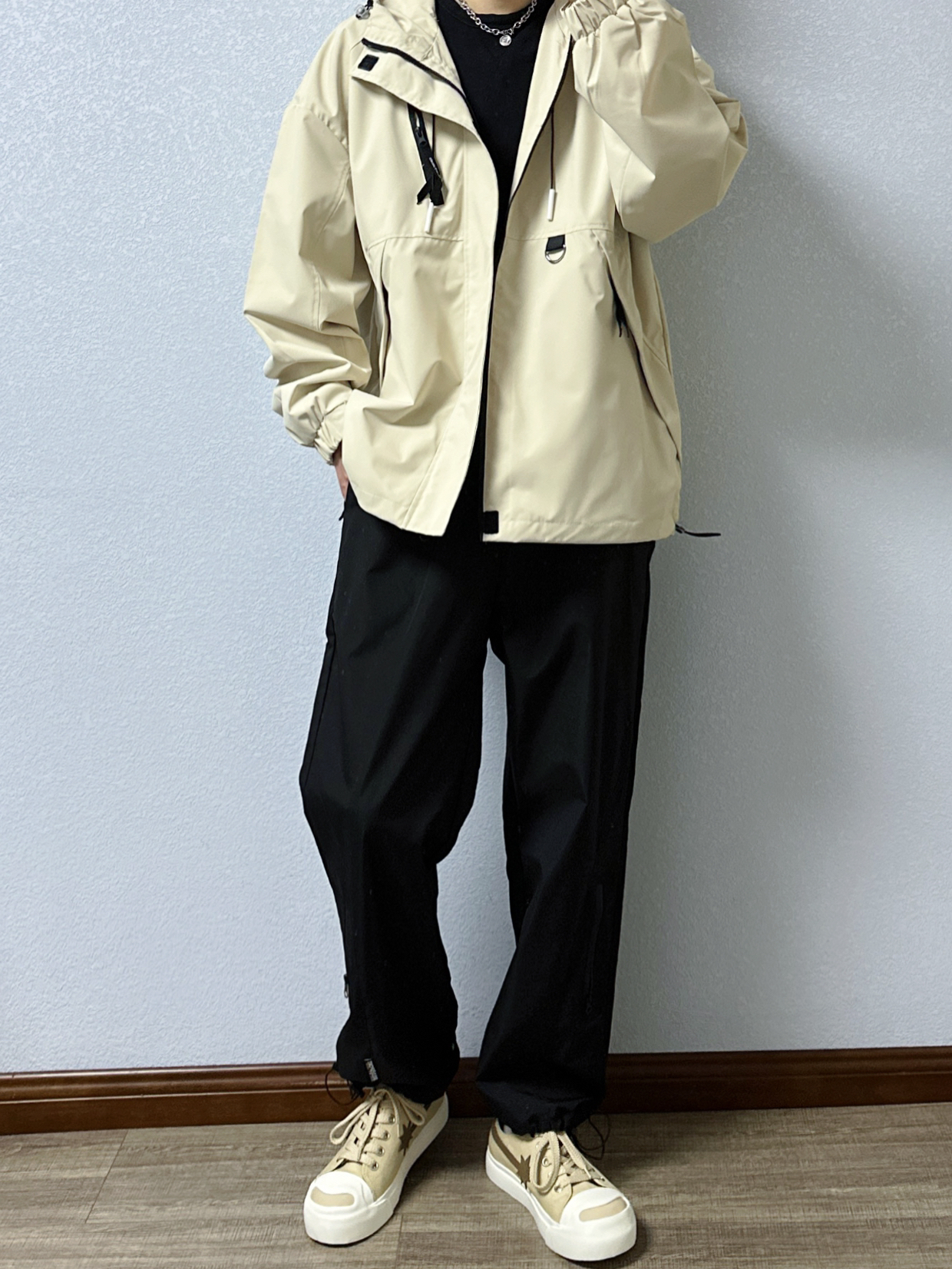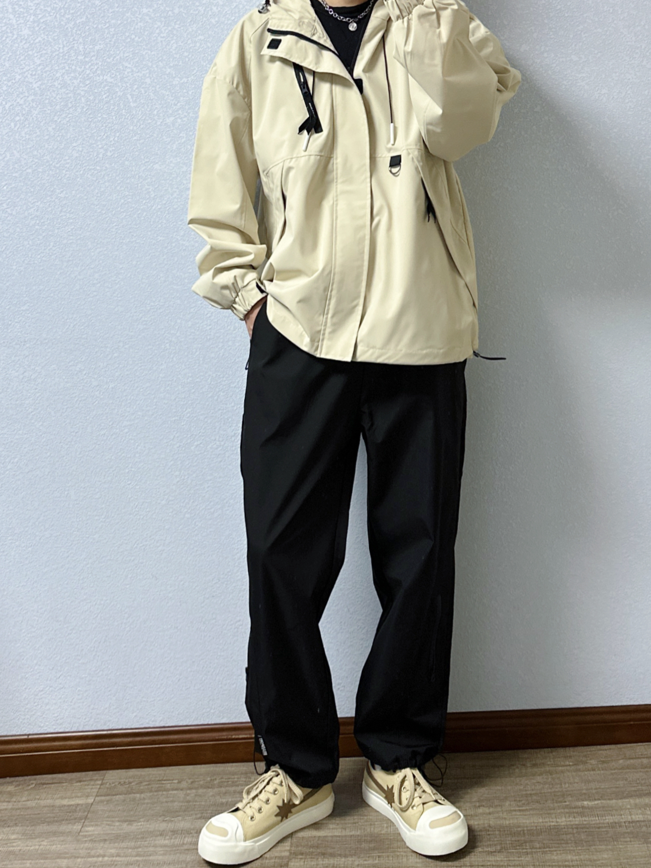 🐳:185 65 宝子们好呀, 今天是秋冬户外风穿搭, 衣服是迈特优的卡其色冲锋衣外套搭黑色T恤, 搭配黑色直筒休闲裤, 鞋子是starwalk的浅棕色开口笑帆布鞋, 户外氛围感拿捏啦~