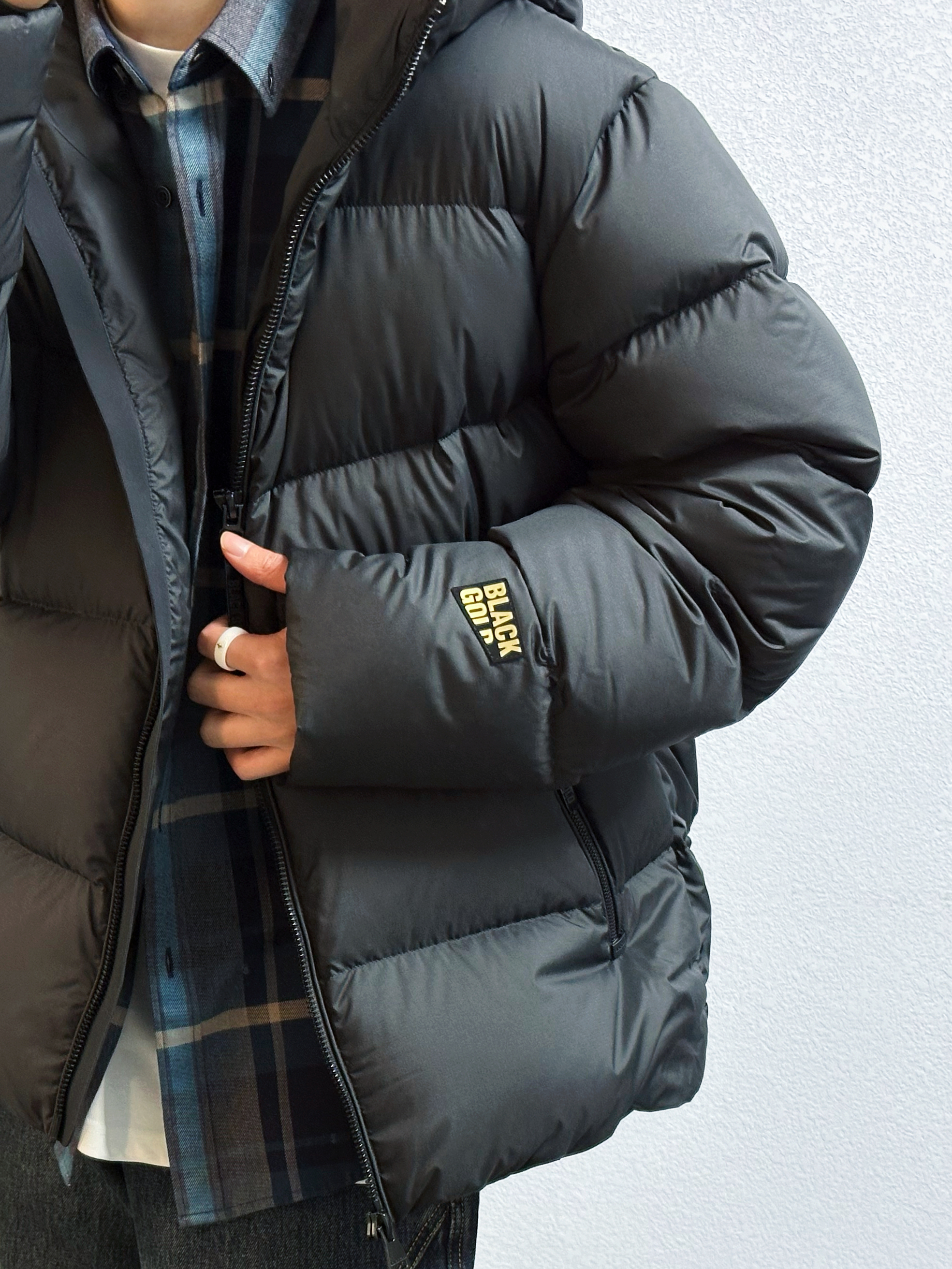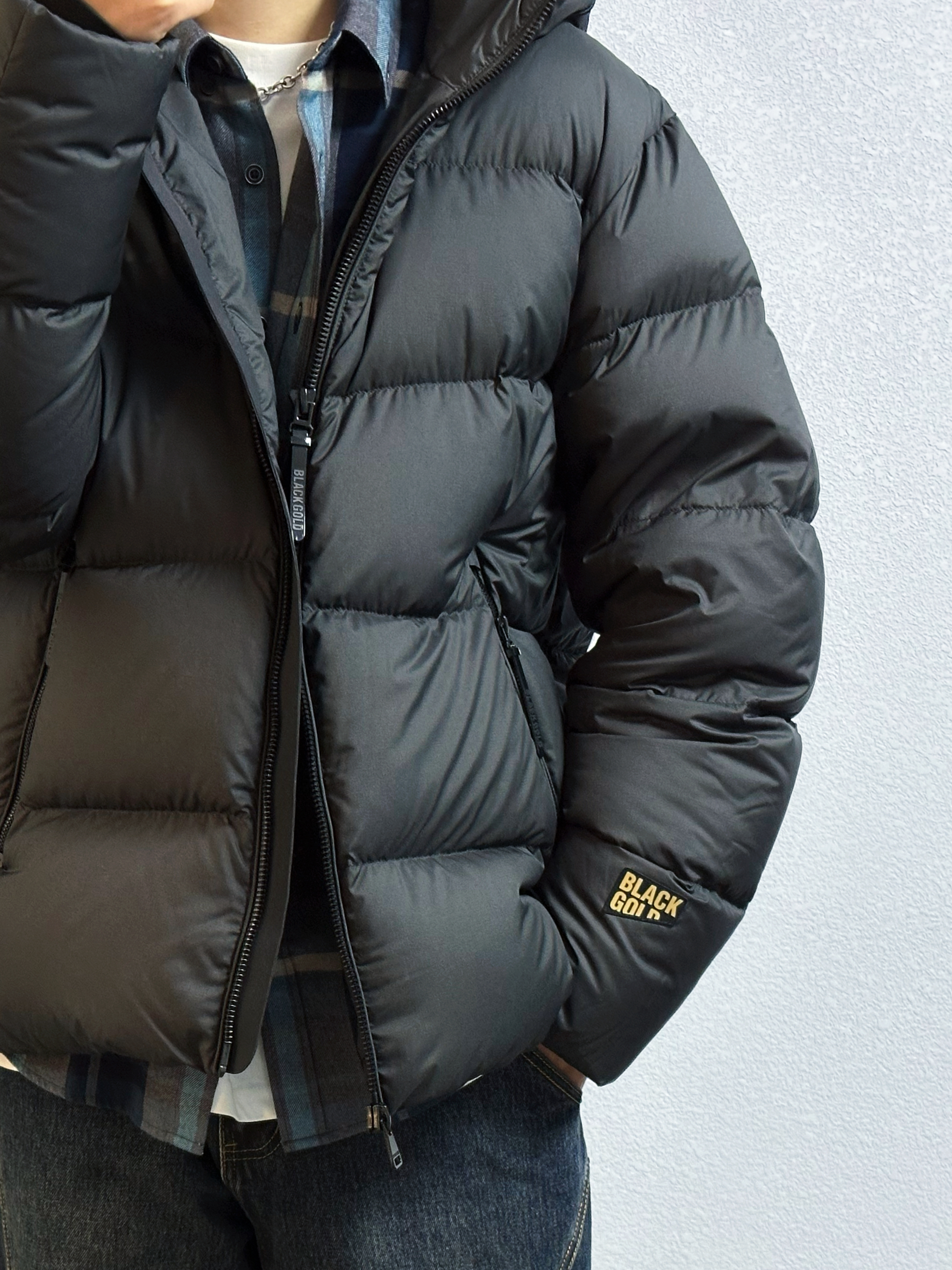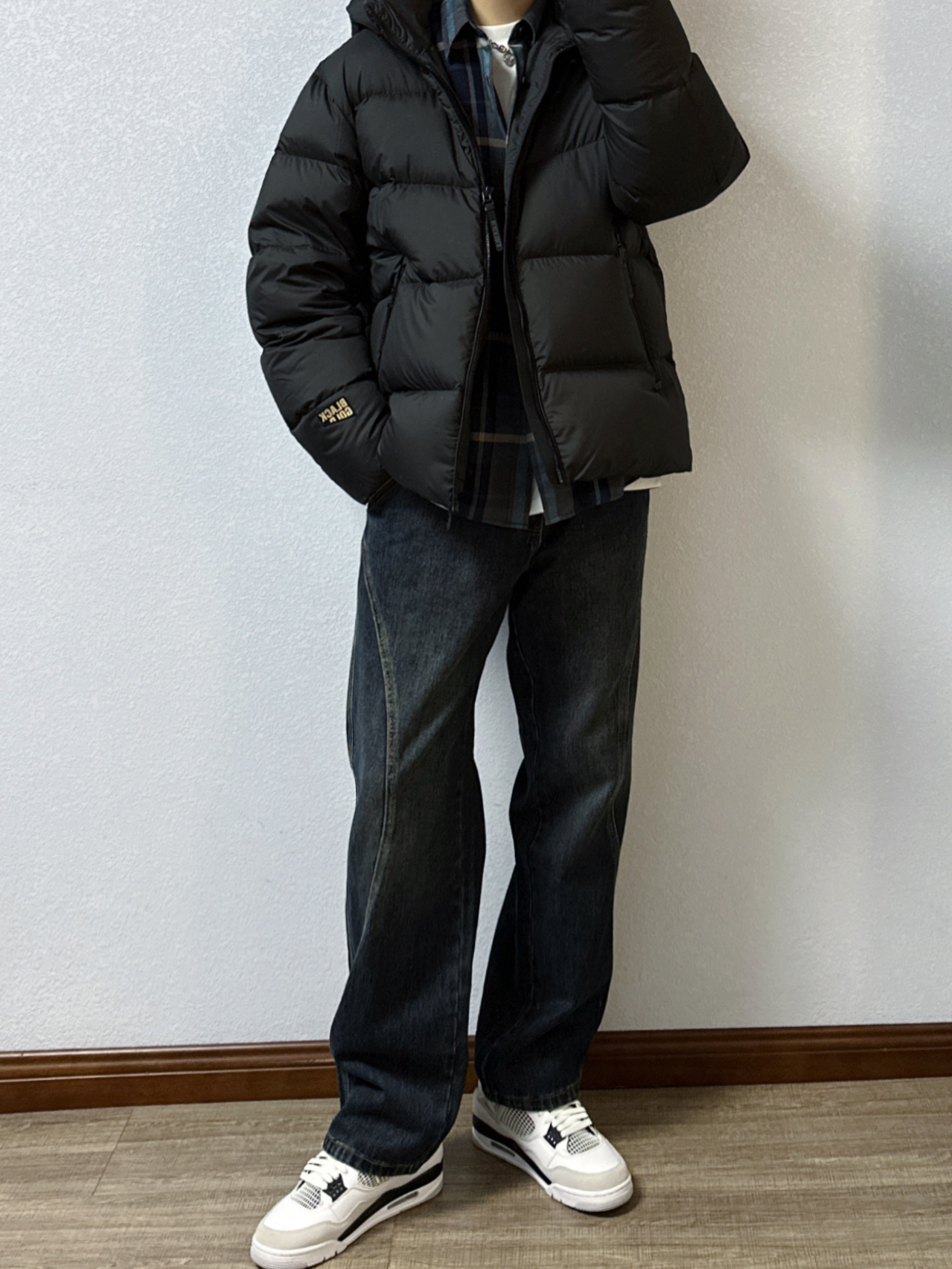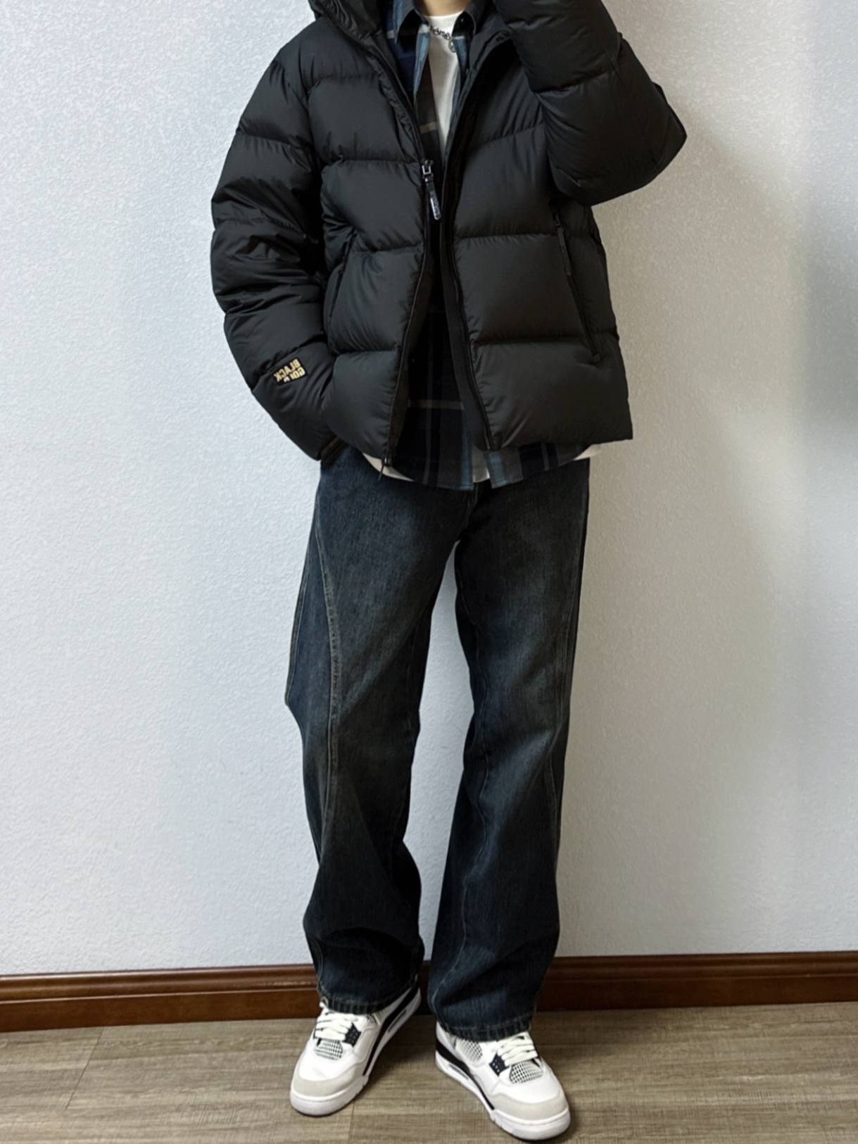 🐳:185 65 宝子们好呀, 冬天出门当然少不了羽绒服啦, 今天是入冬街头风穿搭, 衣服是高梵的黑金鹅绒羽绒服, 版型宽松百搭,上身不显臃肿, 简约黑色搭配金色点缀高级感满满, 不管是颜值还是保暖一起拿捏, 搭配蓝色格子衬衫和蓝色做旧牛仔裤, 白色运动长袜搭配黑白配色球鞋, 冬日氛围感get~