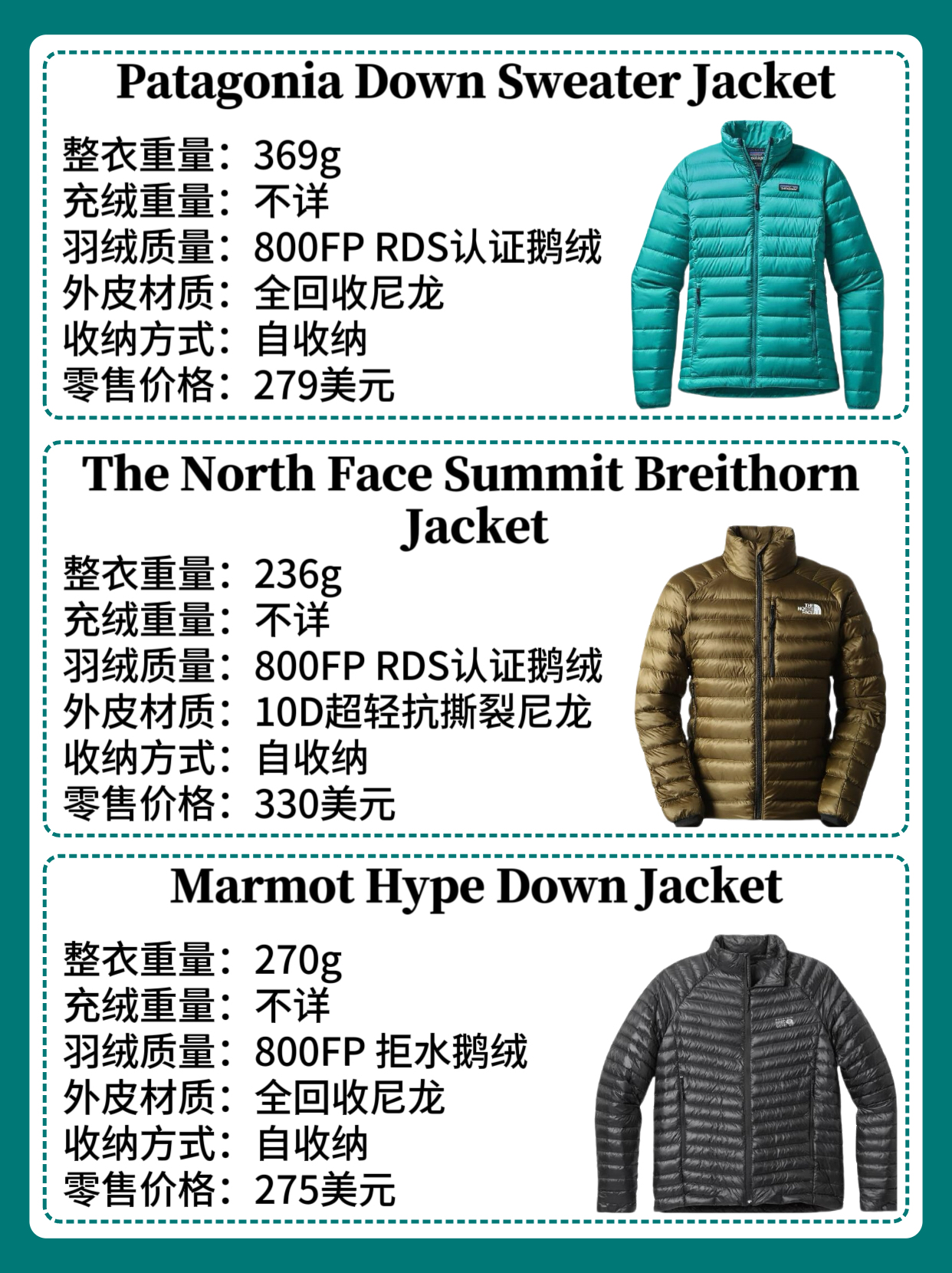 |🙌 之前做了一次超轻连帽羽绒服的汇总推荐,有粉丝说希望来一期无帽轻量羽绒夹克的汇总推荐。于是这就来了。 本期基本是以无帽轻量排骨羽绒夹克为主,并未在重量、售价、蓬松度上做过多的筛选,呈现了比较多样的冬季户外羽绒夹克产品集合(选择范围以官网在售款为准)。 □ Patagonia Down Sweater Jacket □ The North Face Summit Breithorn Jac...