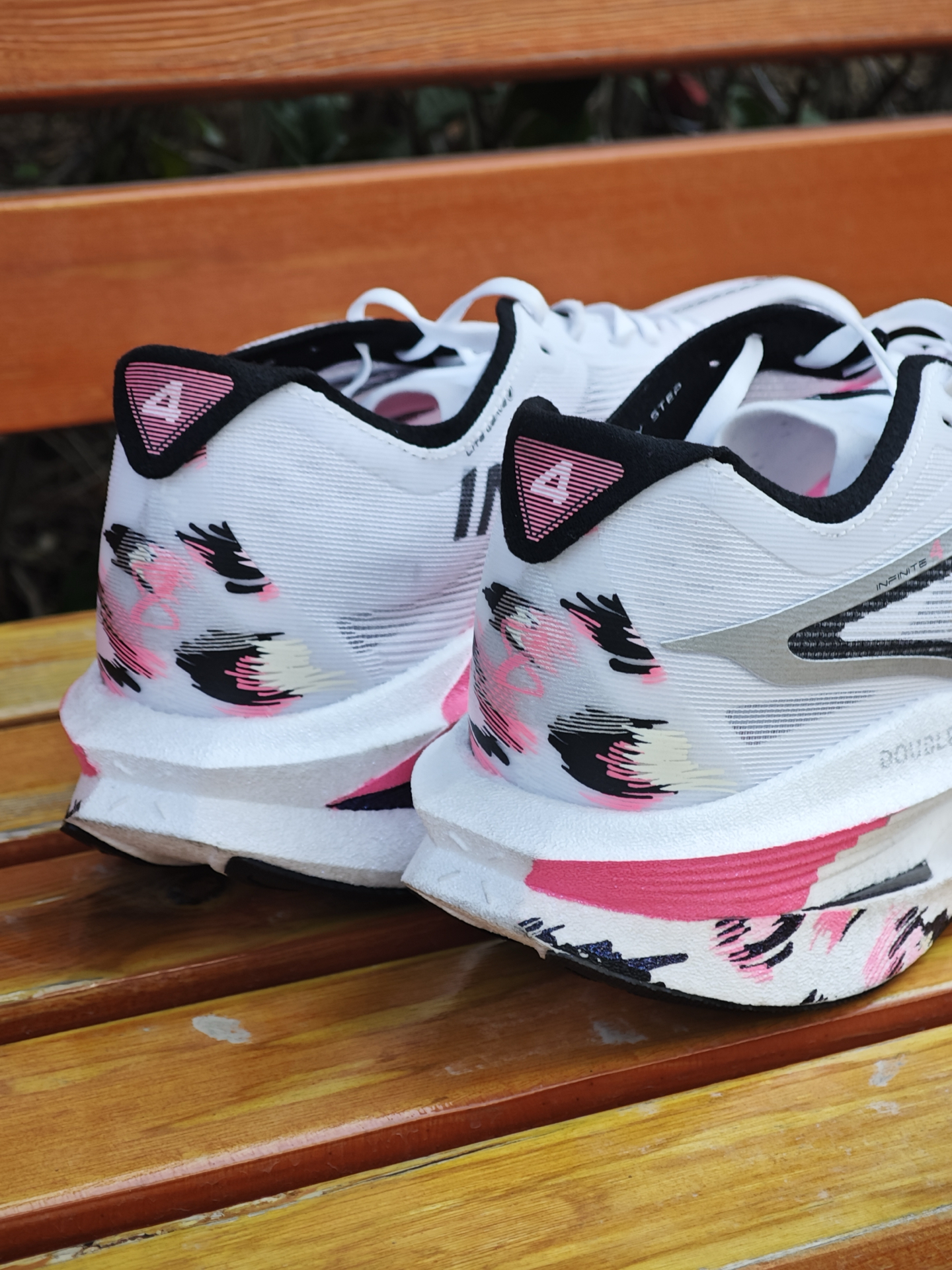 飞燃3也是我蛮喜欢穿的一双碳板跑鞋了 整体有一定驾驭门槛但不算很高 脚杆也是偏软弹的那种 外观颜值也是超多配色可以选 这双和腿哥合作的鸳鸯配色就很不错 整体还是比较简洁的 只在大3LOGO的地方做了鸳鸯处理 黑金色的豹纹图案还蛮帅的 而PB和跑崩的融合字样就很有趣了~