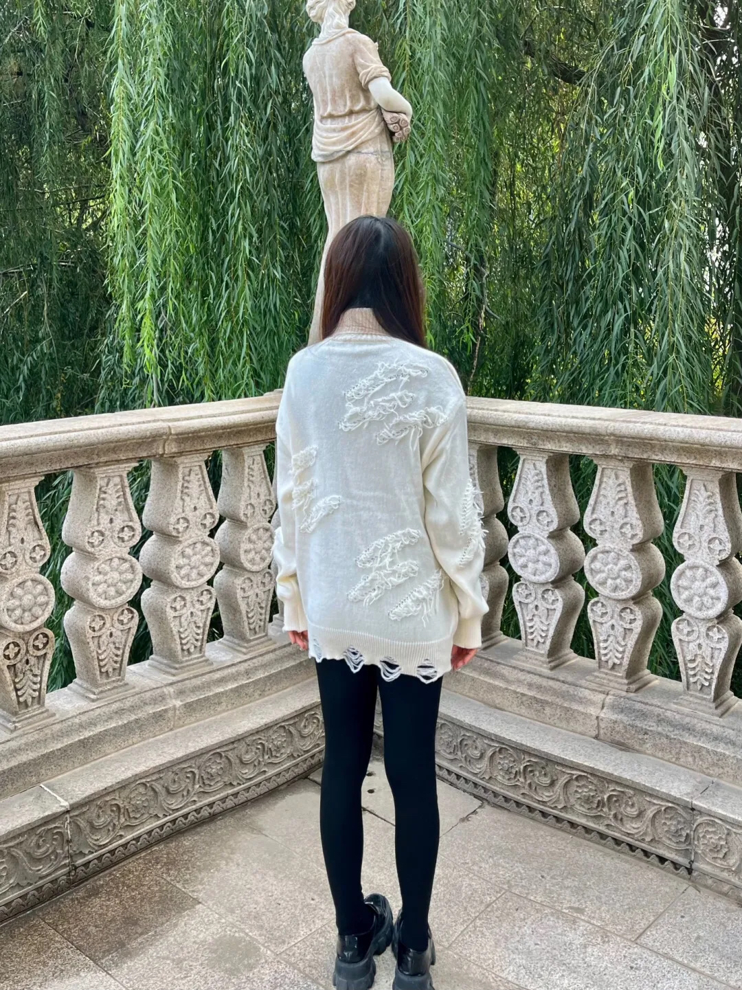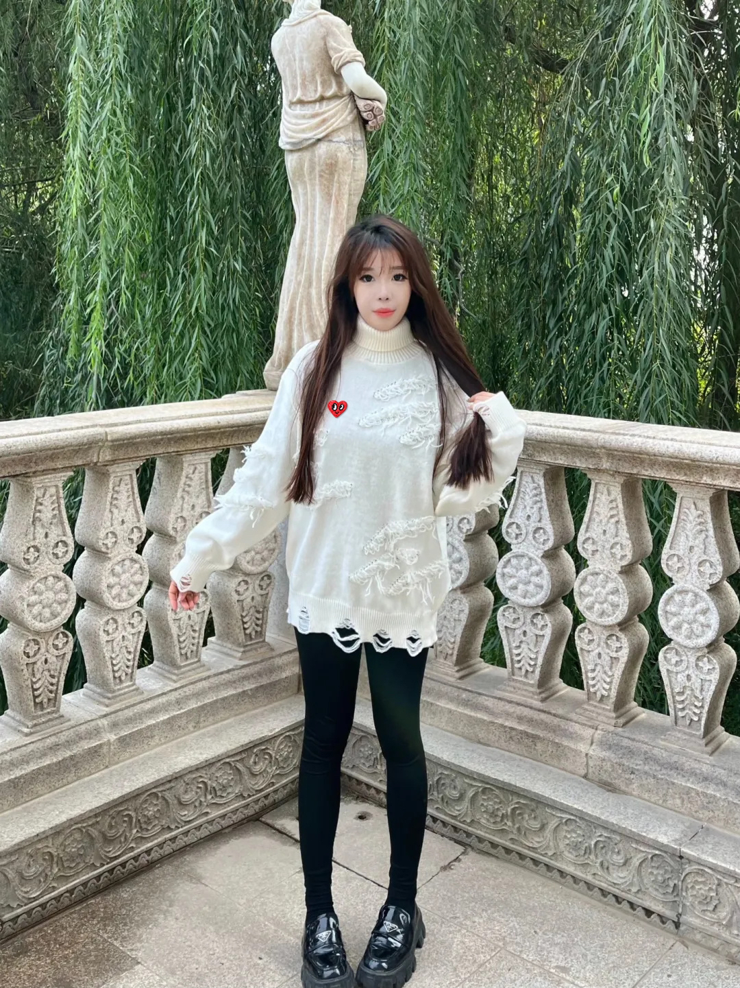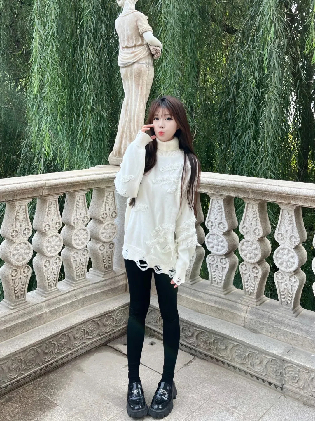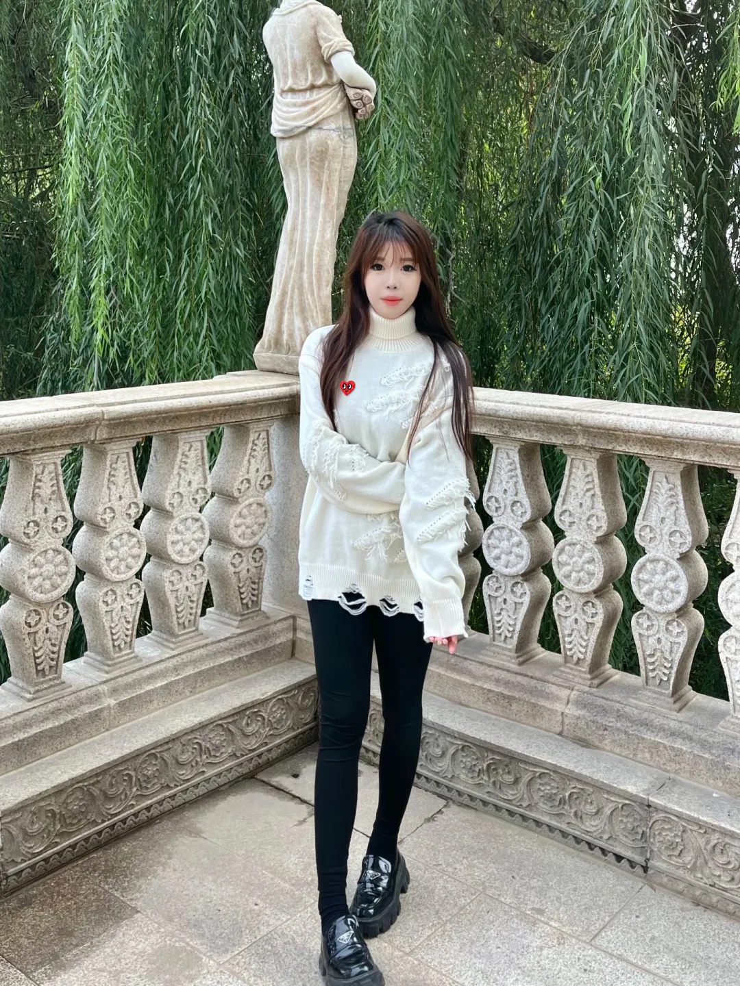 高领的设计是一点都不钻风啊,可以单穿也可以叠穿的一款单品了,白色上身很温柔,怎么搭配都不会出错,破洞设计真的很不错~