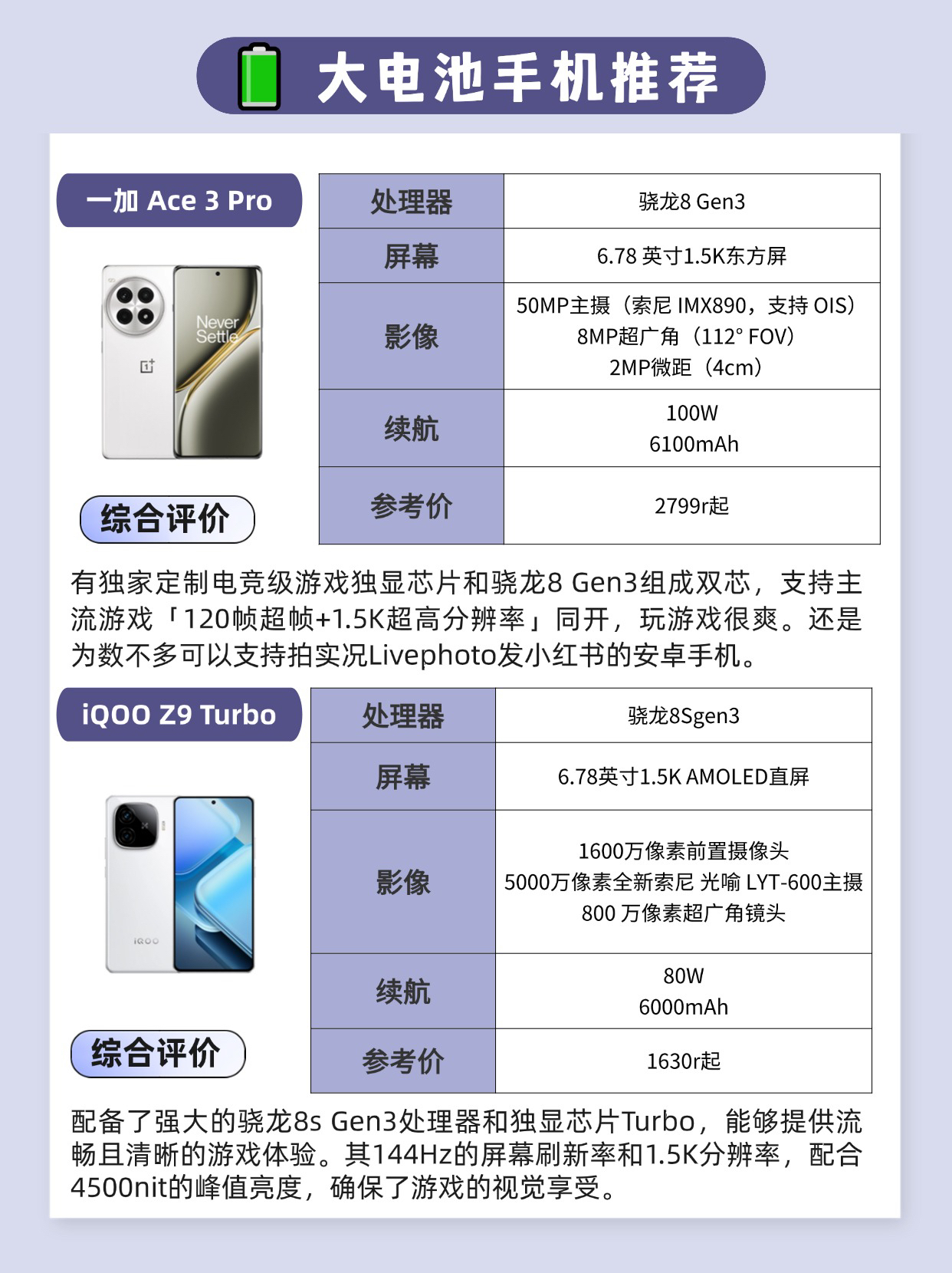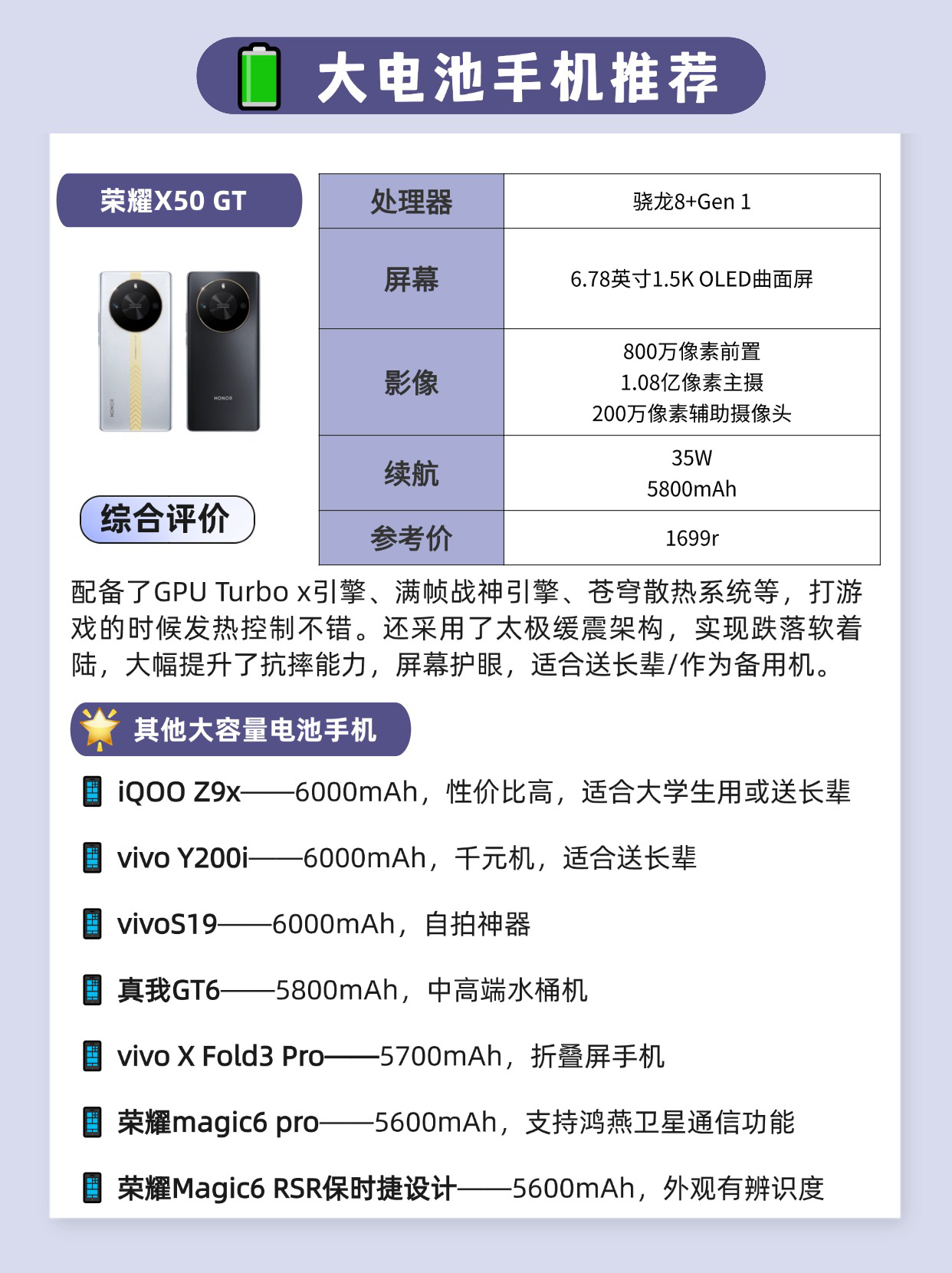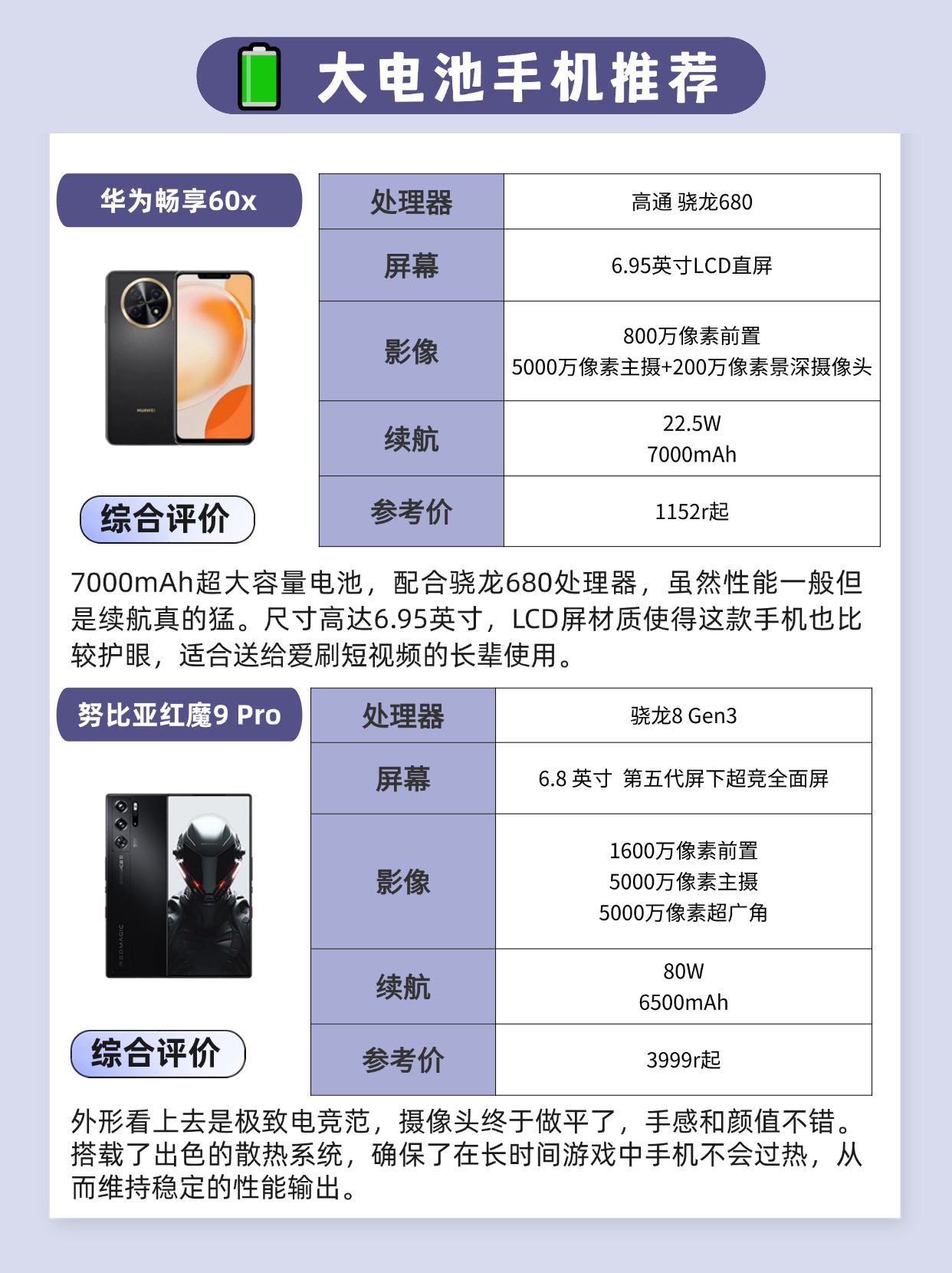 你的旧手机是不是电池🔋不行了,出门完全离不开充电宝? 给大家挑出了几款有电池容量大、续航超久的手机,重度使用一天无压力,真的能治好你的电量焦虑!📱 不管是拿来打游戏、作为主力机用,还是送父母长辈都很合适! 华为畅享60x——7000mAh,屏幕大且续航久,适合送父母 红魔9 Pro——6500mAh,外观电竞风👀 一加Ace3 Pro——6100mAh,支持拍实况Livephoto iQOO Z...