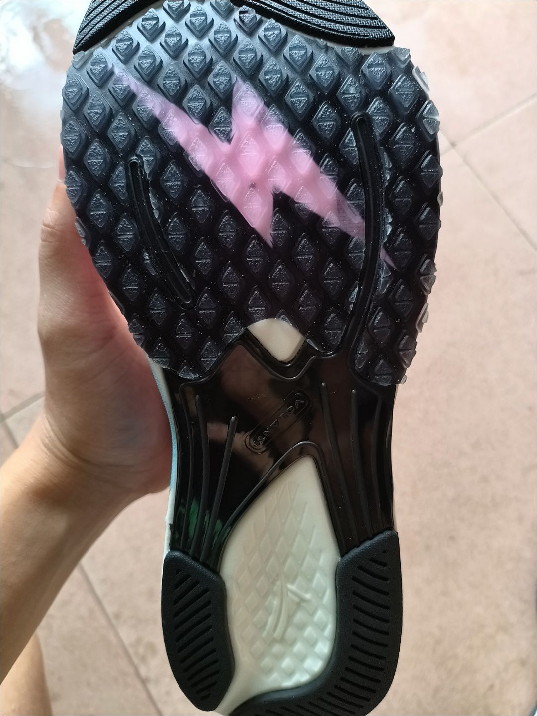 颜值: 蓝粉配色颜值没话说,联名设计高级感满满 脚感: 双层贾卡鞋面,透气性和包裹感都很不错;中底内置全掌碳板,推进感十足;中底韧弹,跑跳不泄力;鞋底 CPU + GPU 大底,防滑效果好。