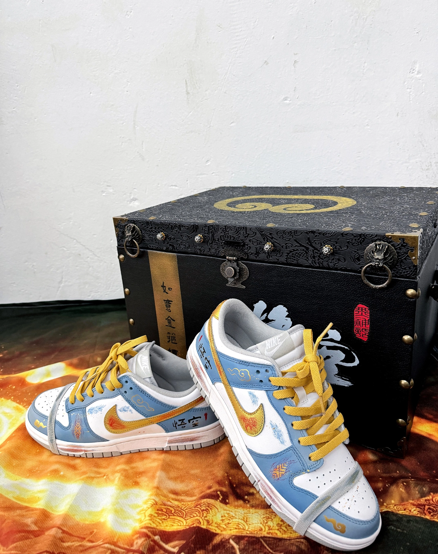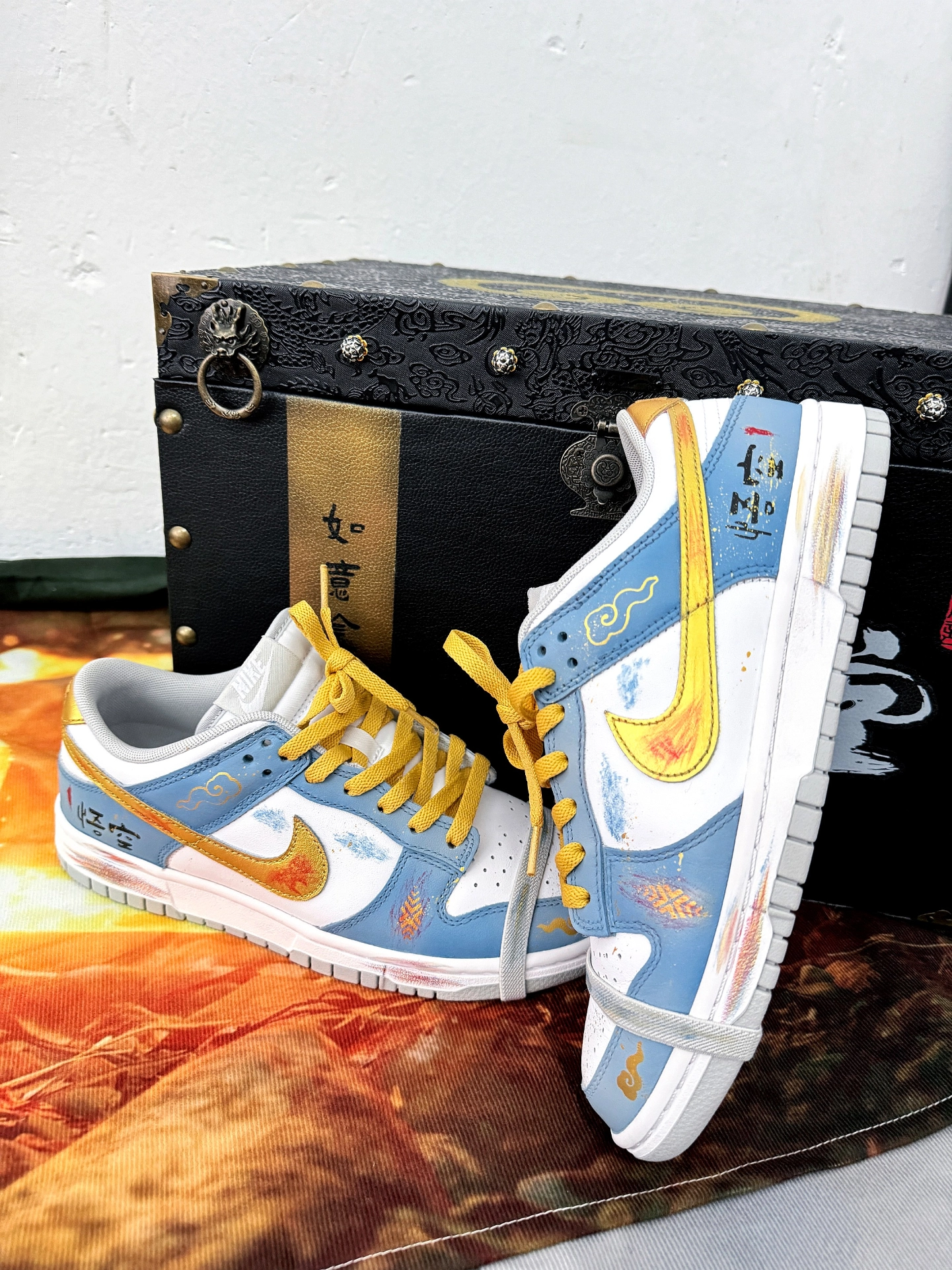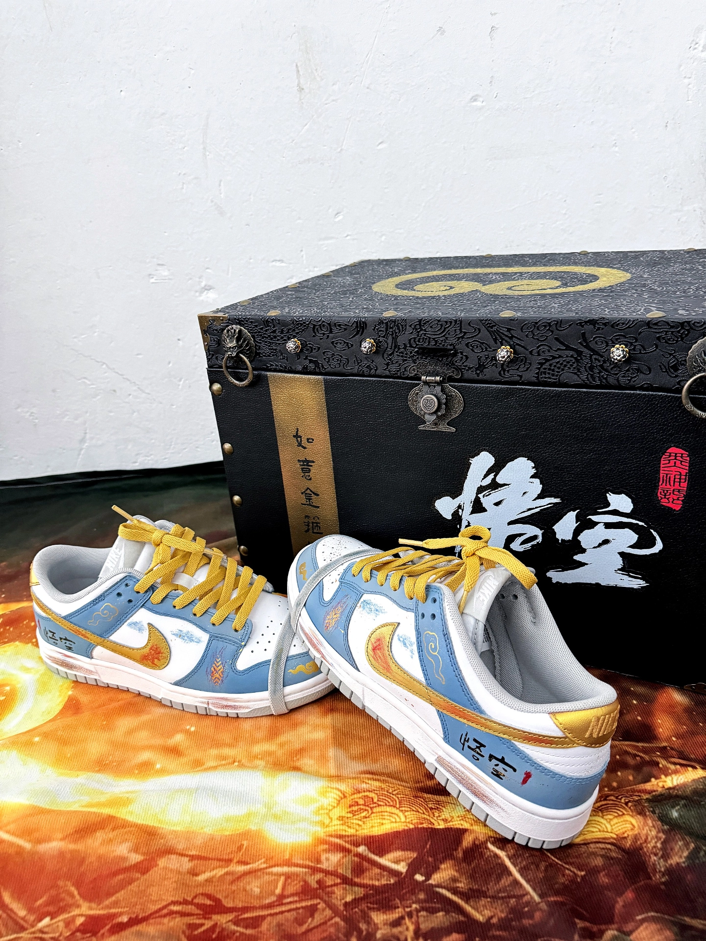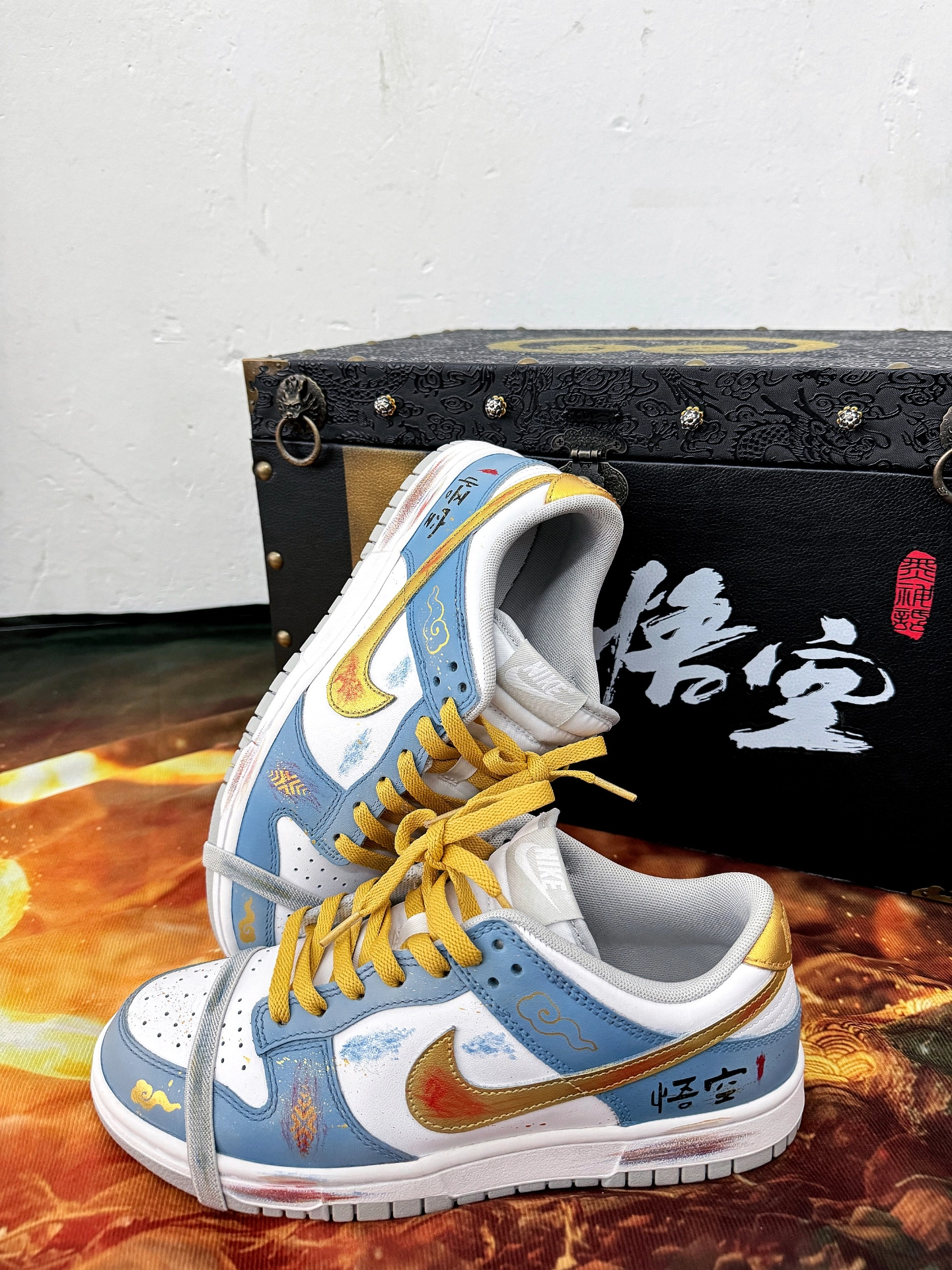 前段时间《黑神话:悟空》不是挺🔥的吗,奈何自己一直没有时间去玩,只好搞一双悟空的定制鞋穿穿了,给大家分享一下⬇️ 鞋子是在dunk的基础上做了一些定制,logo、鞋尾和鞋带是金黄色,寓意大圣的黄金甲,主色是蓝白配色,全鞋身不同位置用了做旧工艺,看起来更有质感,外侧后跟处是“悟空”二字,鞋面还有筋斗云的图案,总体还是比较有设计感的,值得一提的是他的鞋盒,有点古代藏宝箱的感觉,还是不错的. #黑神话...