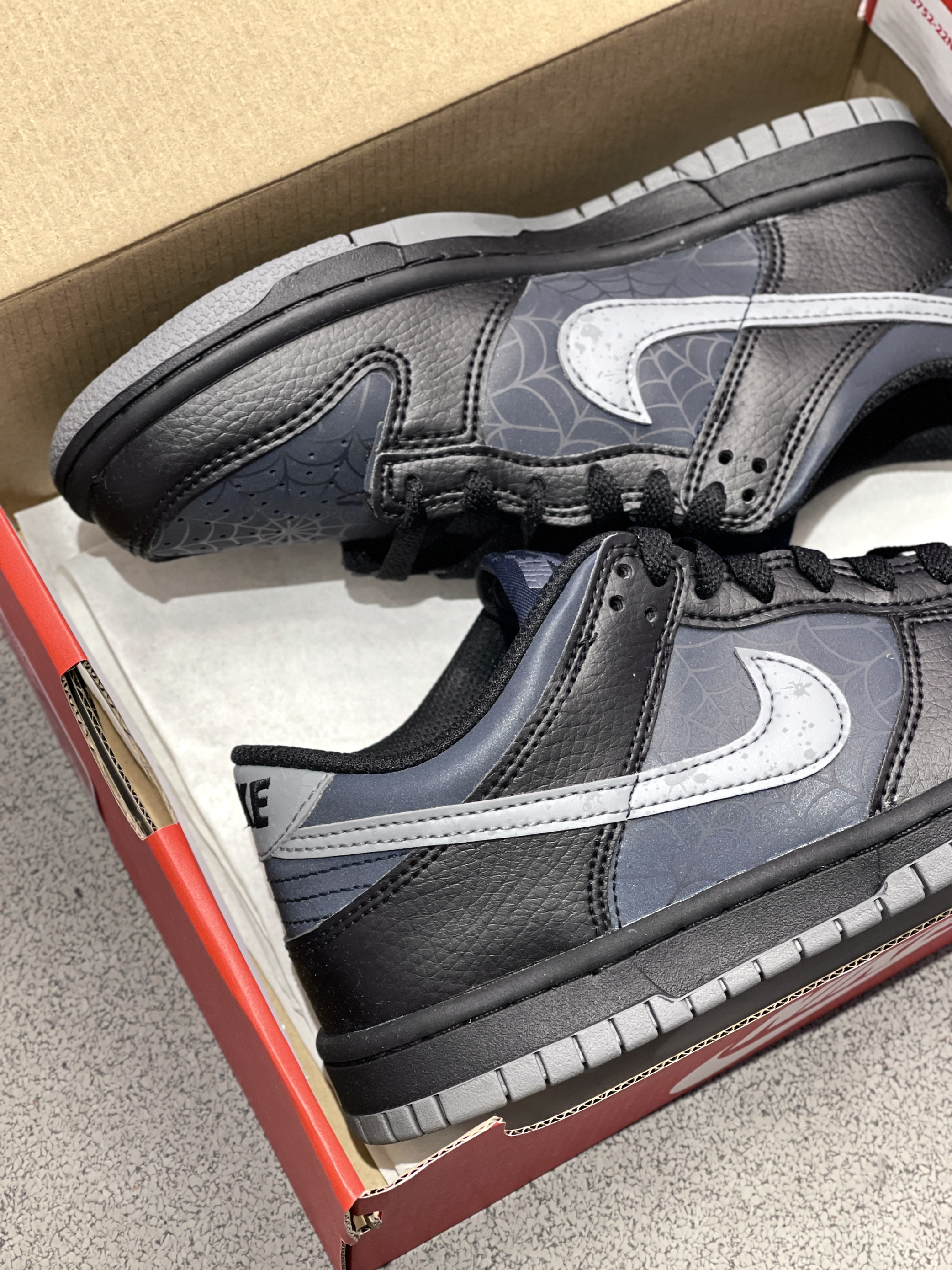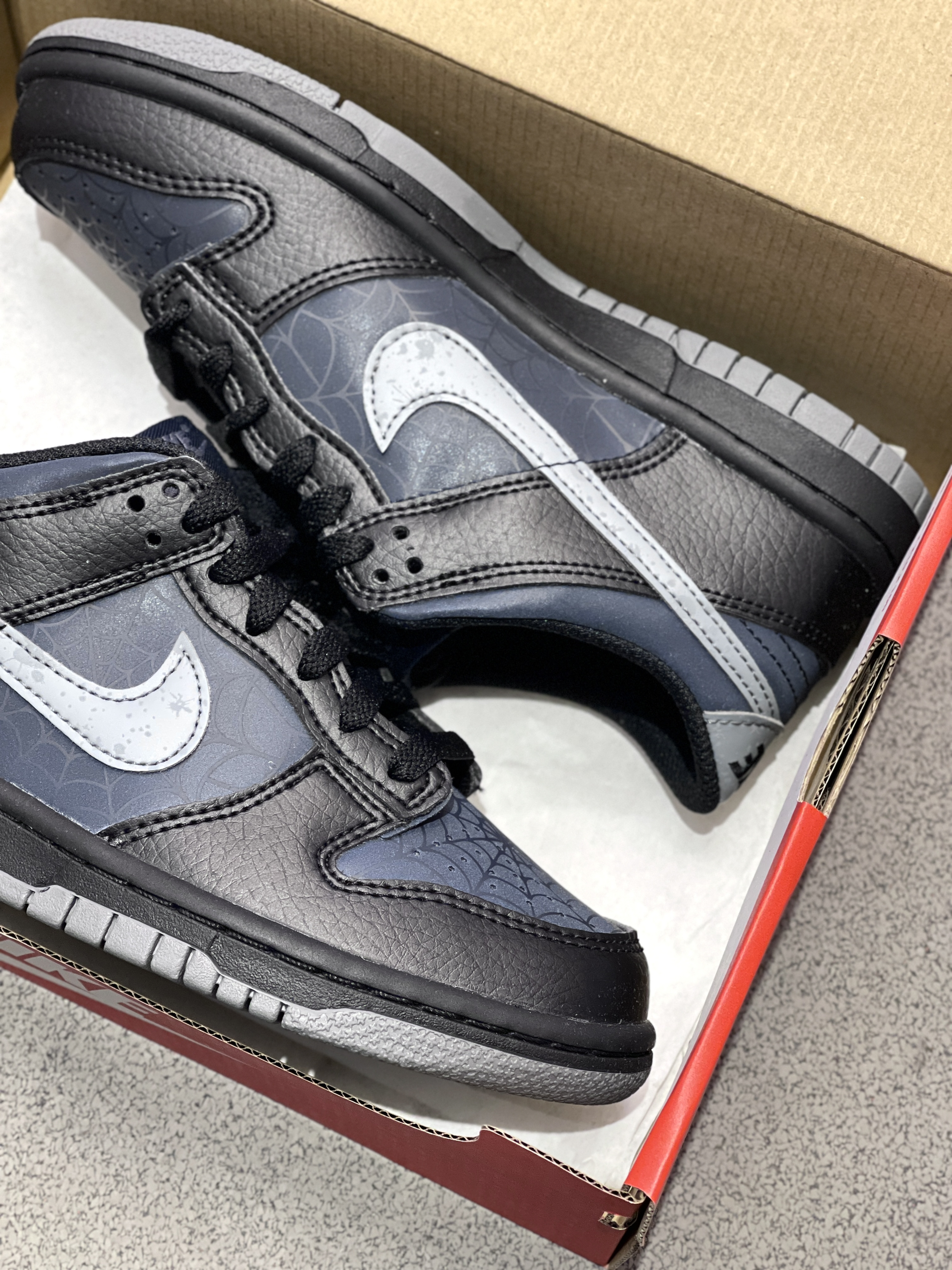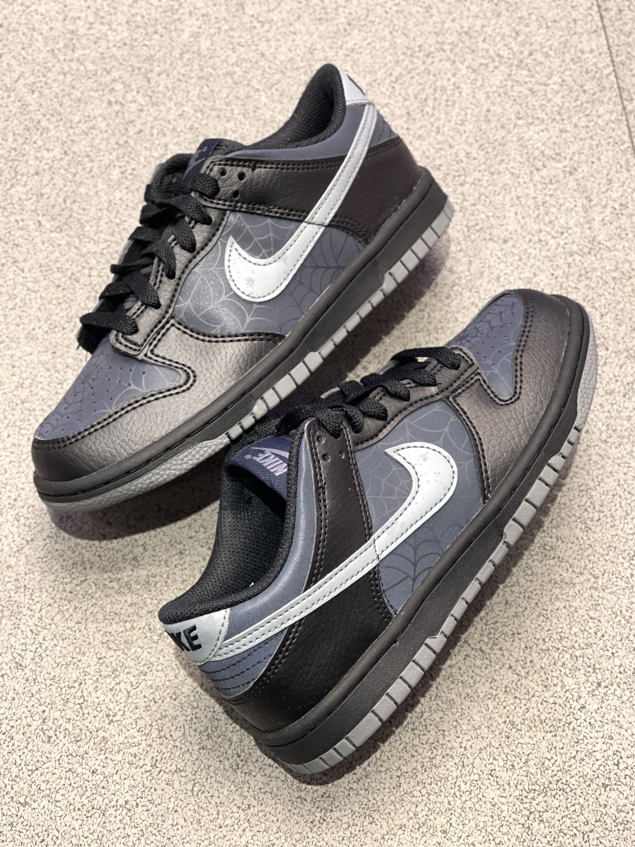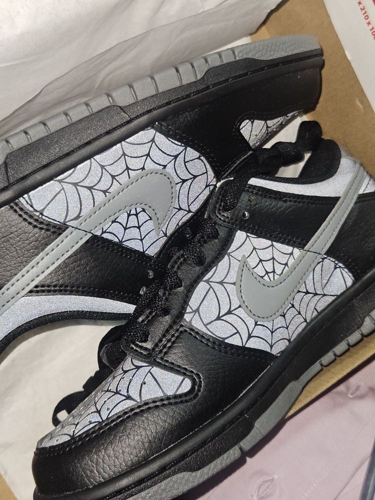 虽然是普款Dunk,但一点也不输联名款的细节! Nike|Dunk 低帮板鞋🕷️,实物开箱是经典百搭的低帮Dunk鞋型,黑灰配色鞋面➕蛛网、夜光设计,整体酷炫细节丰富!400+的价位,可惜没有男码!🥲
