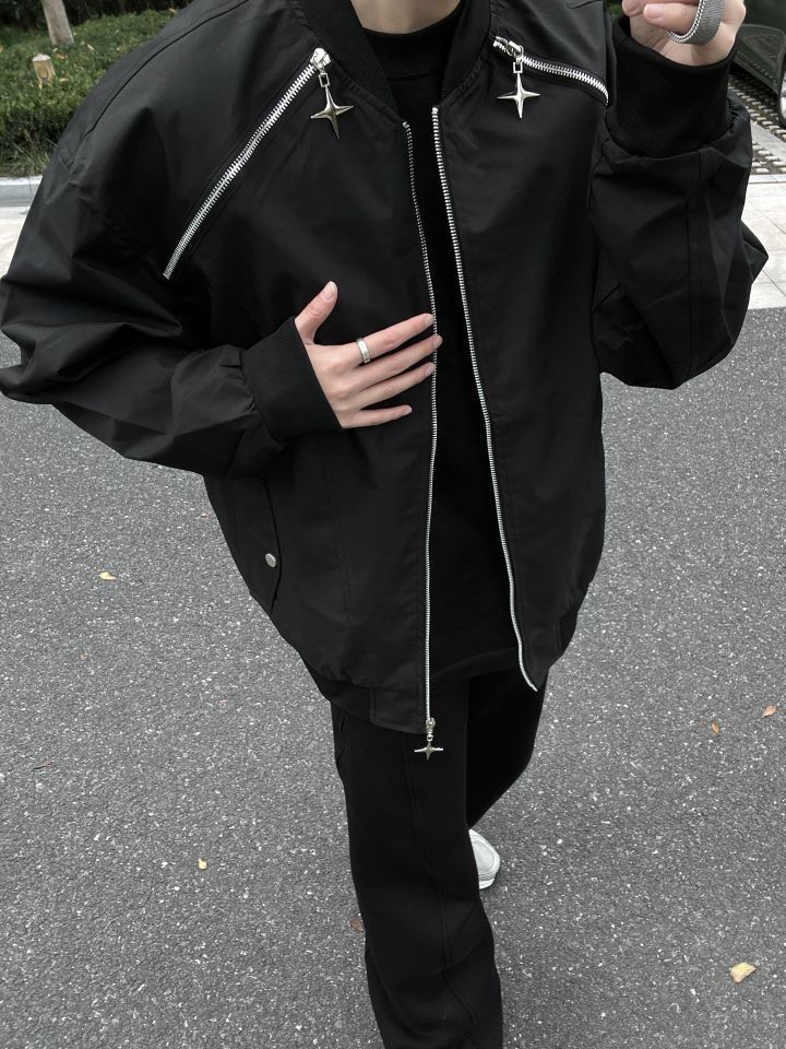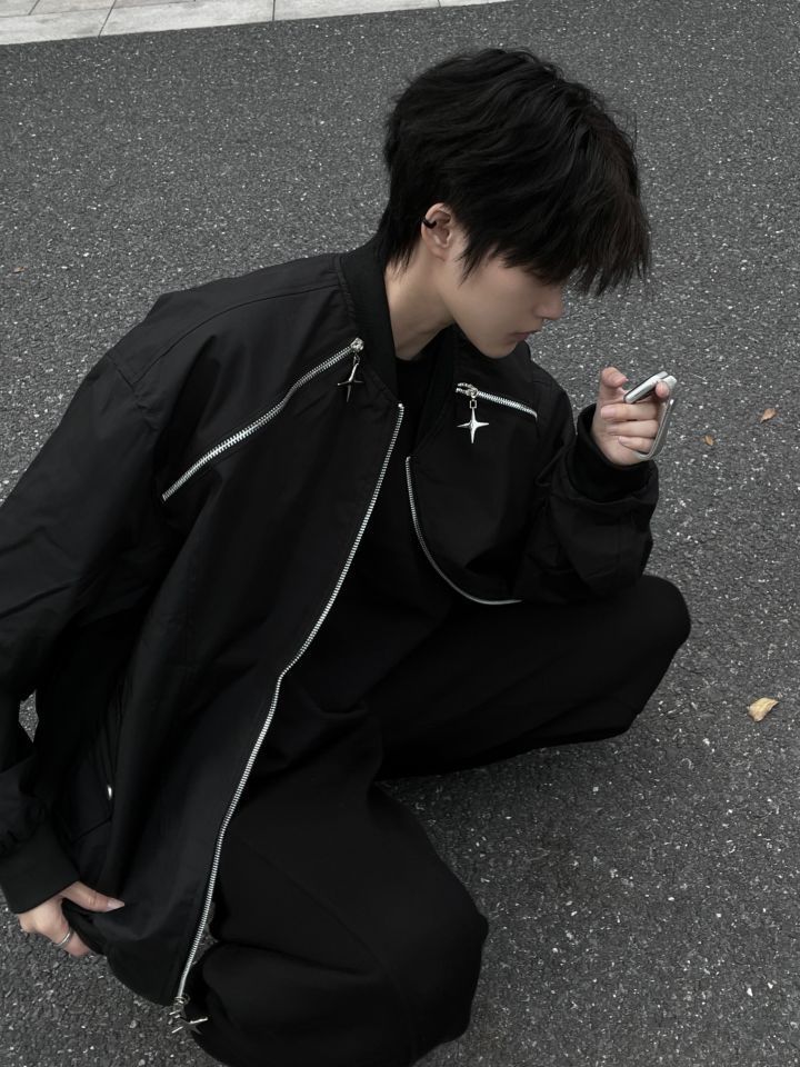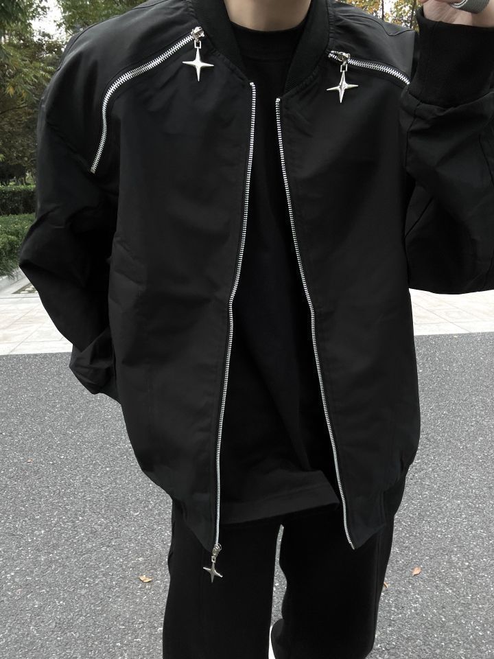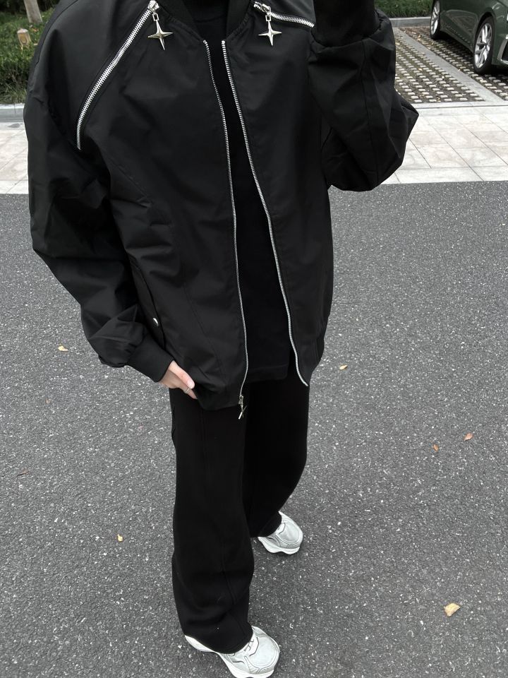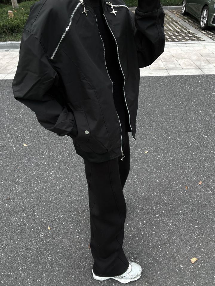 👔HIKZ 👖WHOCARESLQ 今天穿的是HIKZ的机能风夹克 整体的黑色搭配银色的拉链线条机能感拉满! 拉链的十字星造型也是超级帅! 我172/100 穿XL码微宽松