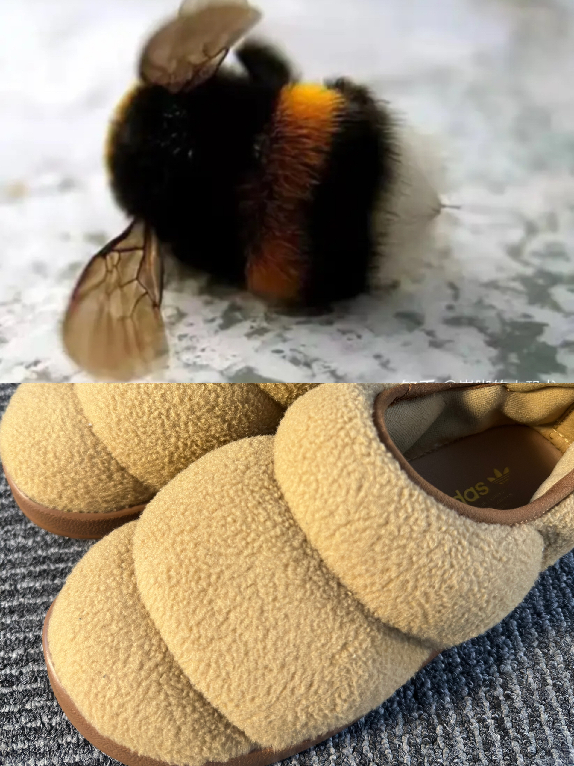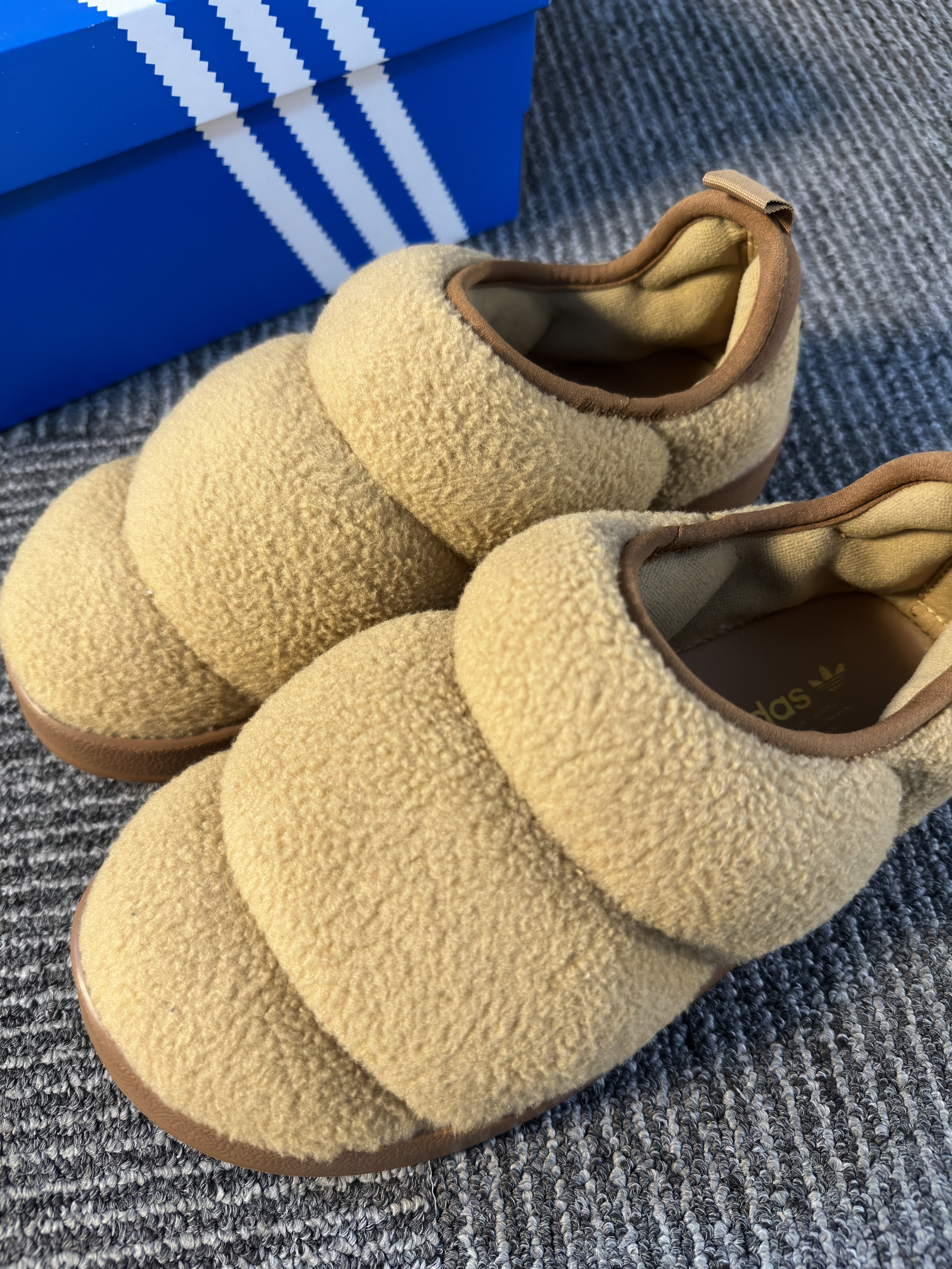 阿迪还有这种面包鞋真没想到 整体造型有种蓬松感,像个胖蜜蜂🐝 鞋面是棕色的绒毛织物,也能比较耐脏 鞋子很轻,就鞋底有些硬需要适应一下