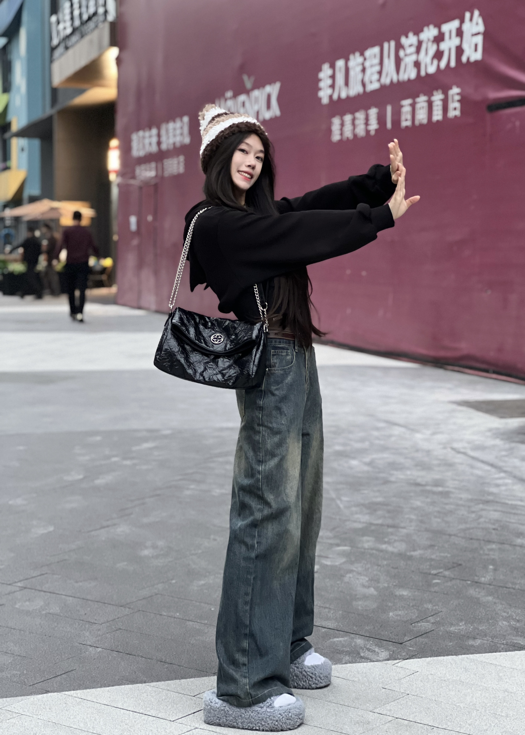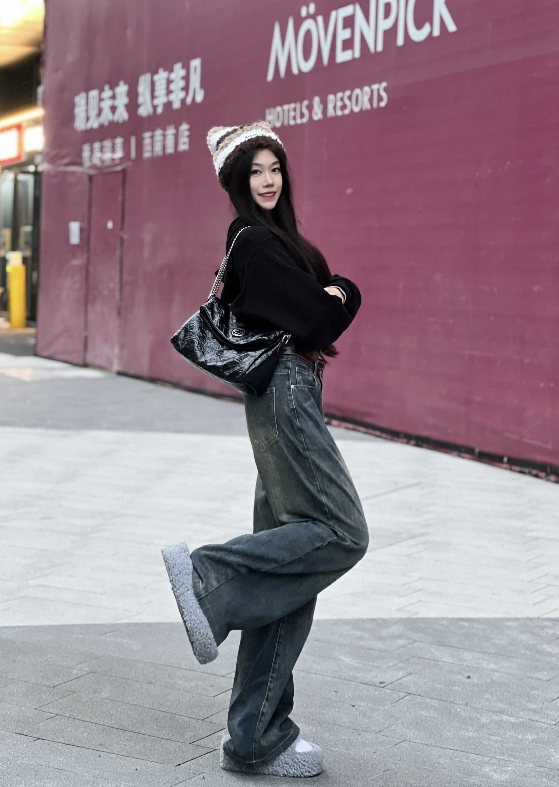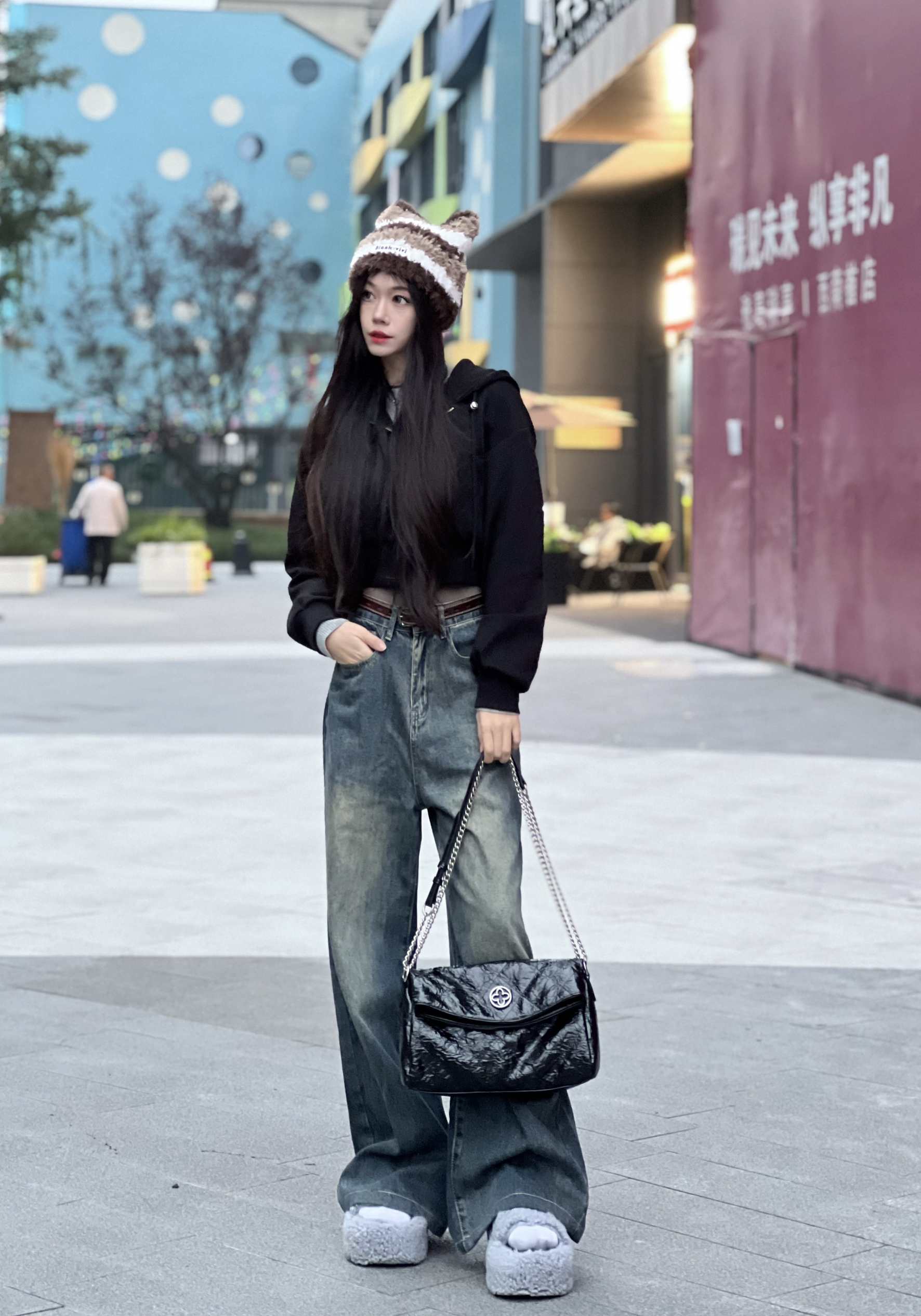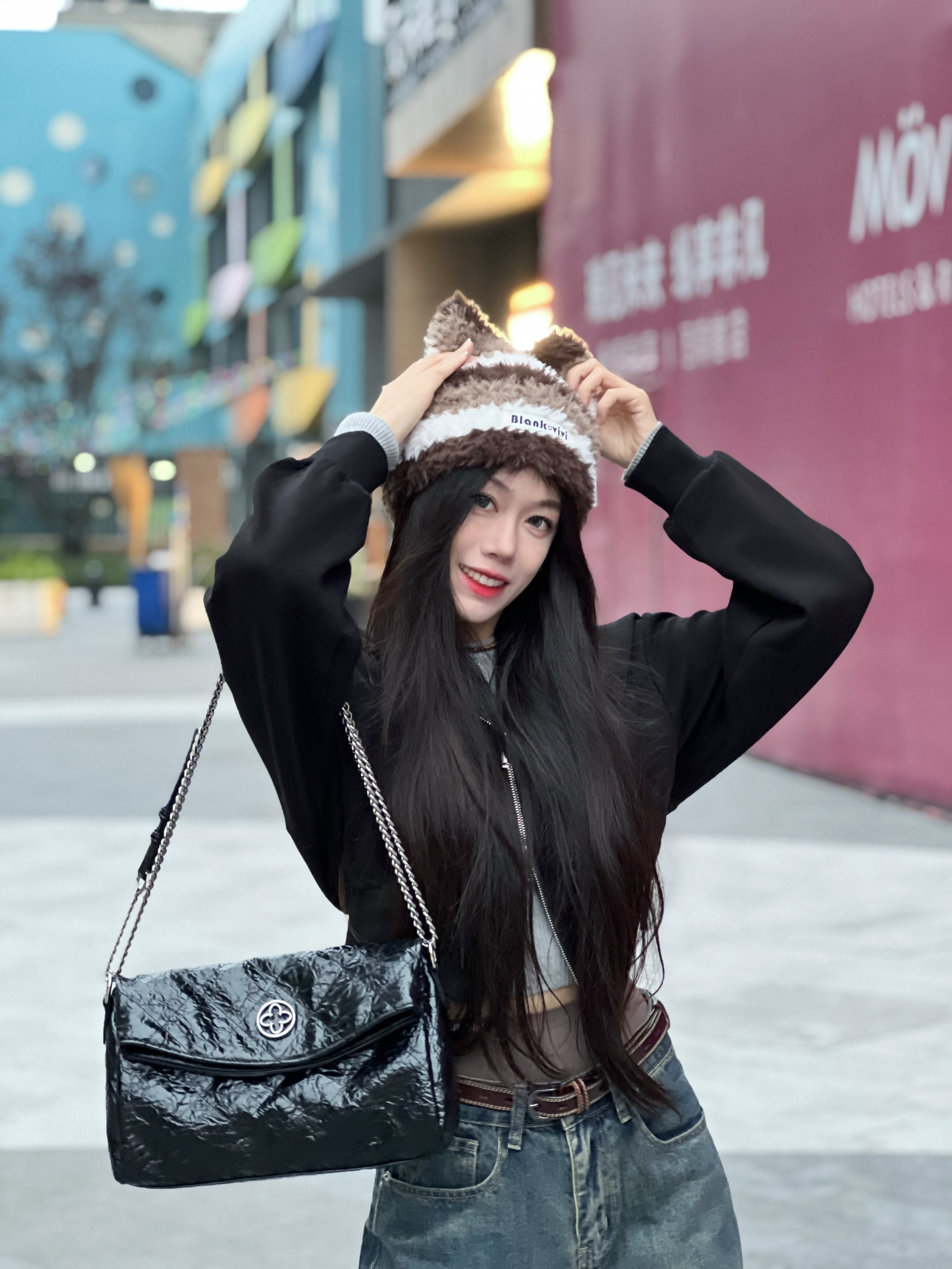 早八快速出门穿搭🏃 一件高腰的黑色连帽卫衣搭配牛仔裤 为了对抗早上的冷空气🥶 本怕冷星人特意带了一顶毛茸茸的帽子 还有两个耳朵好可爱😍 包包也选择了一个大容量的⛓️链条包 黑色油蜡皮的面料百搭又时尚 今天穿这套 不迟到😏