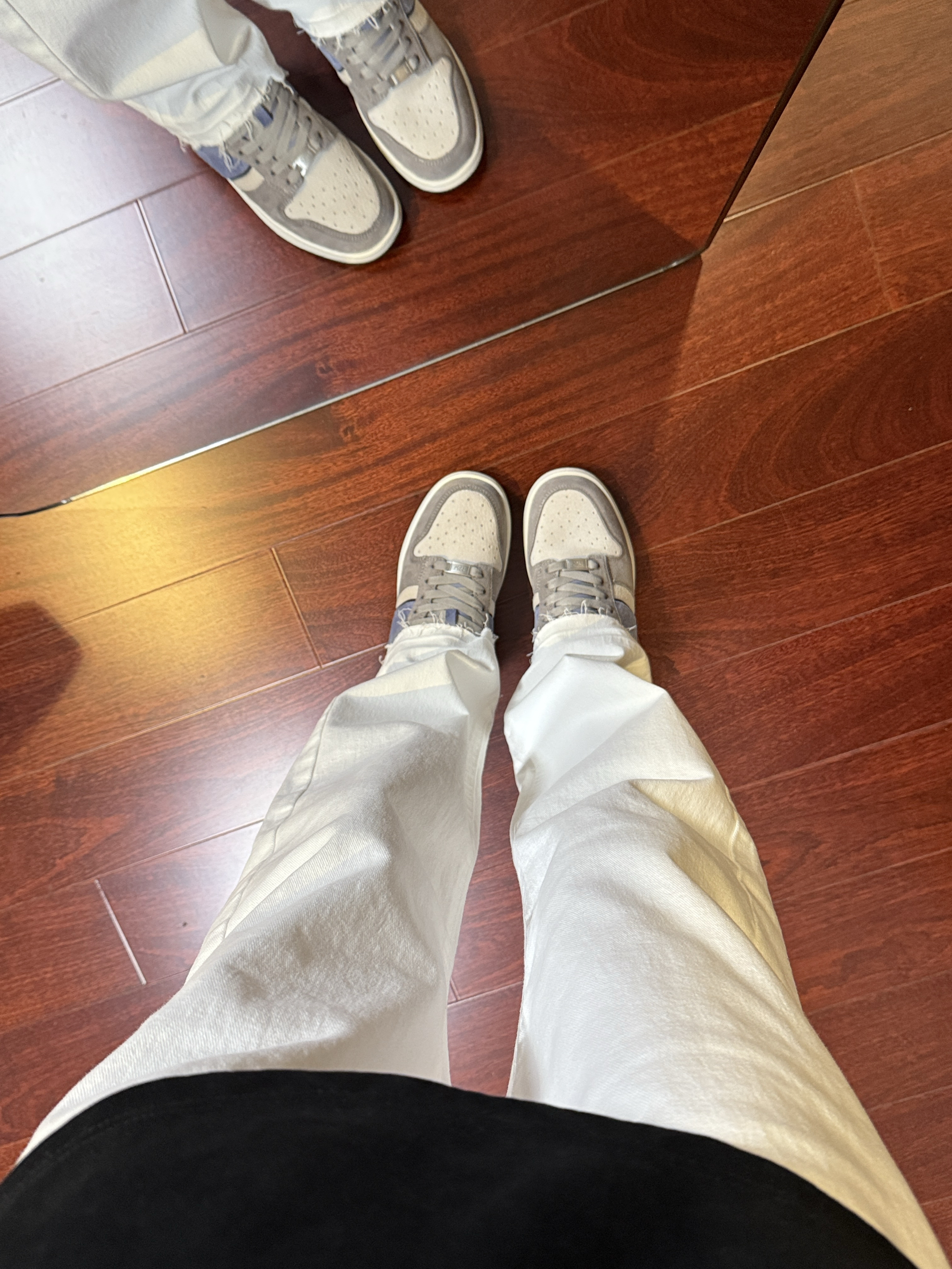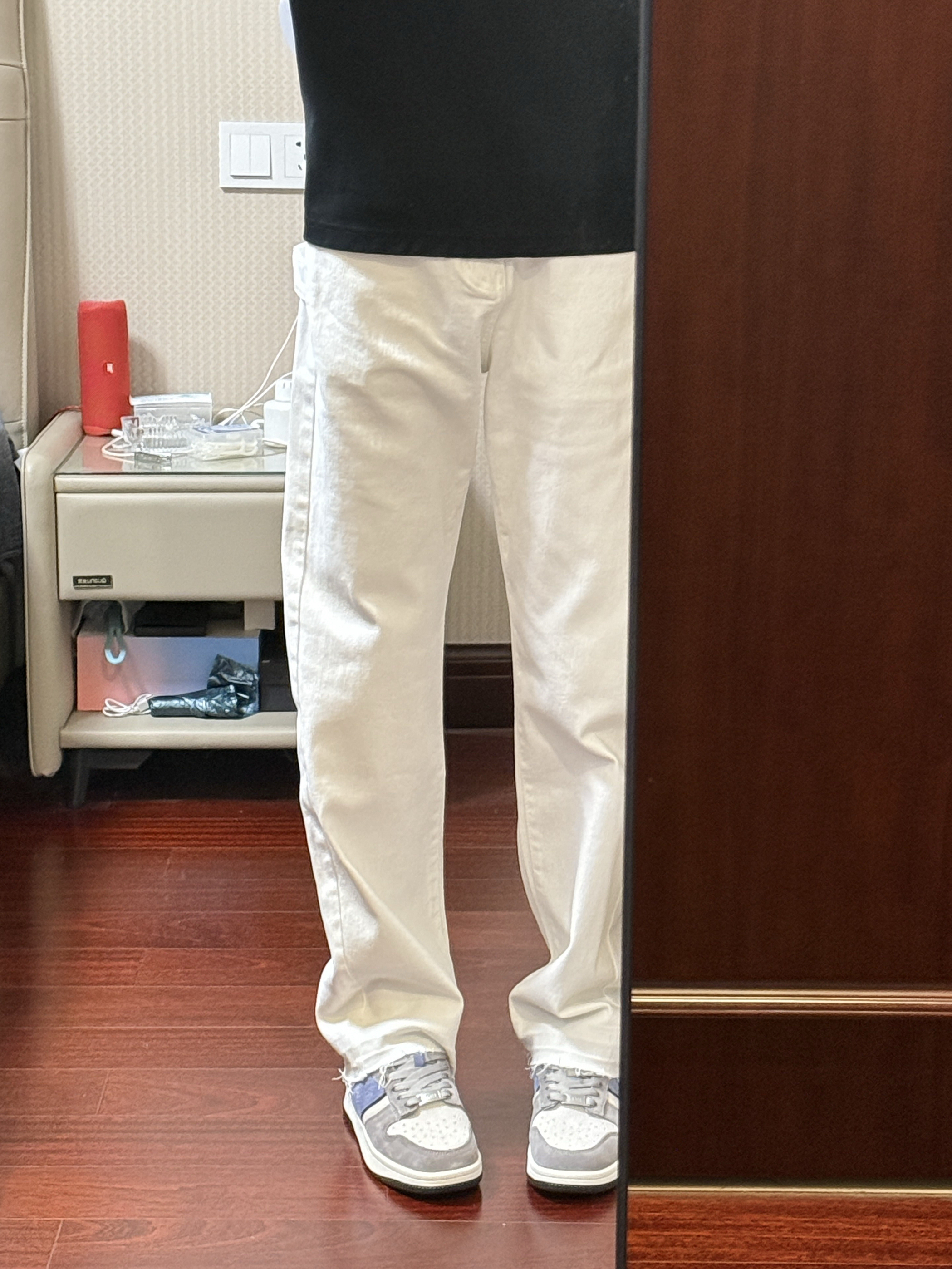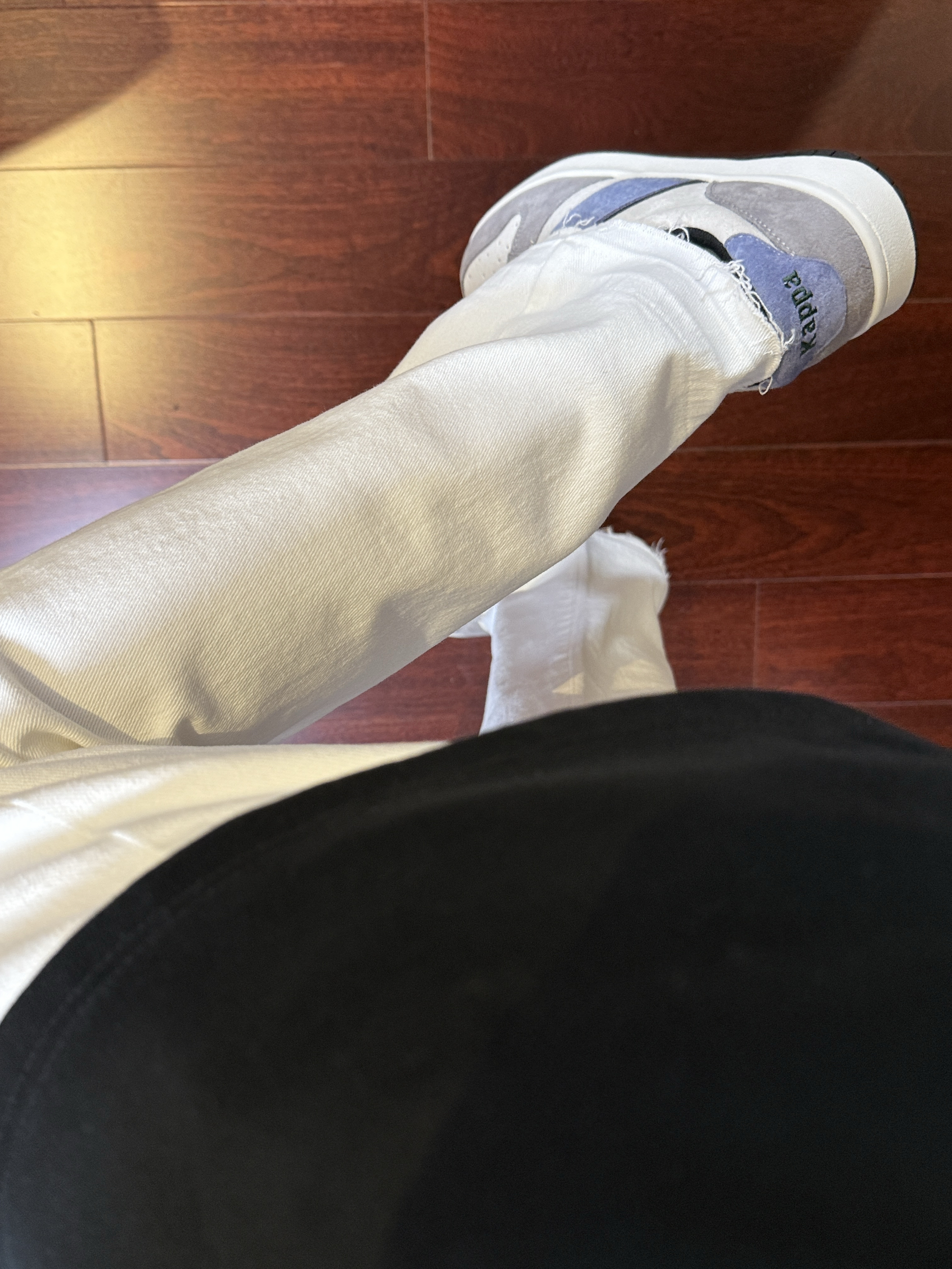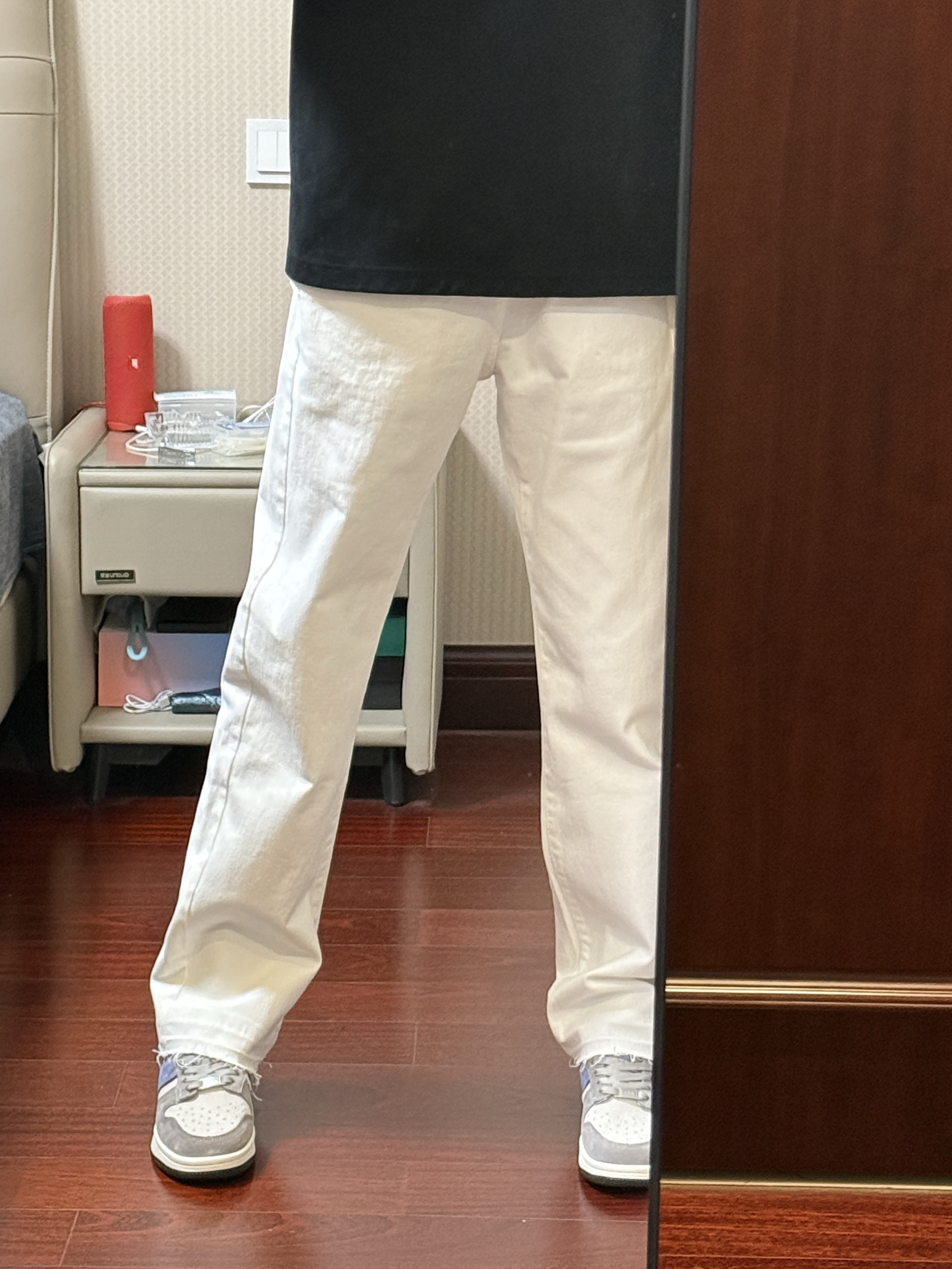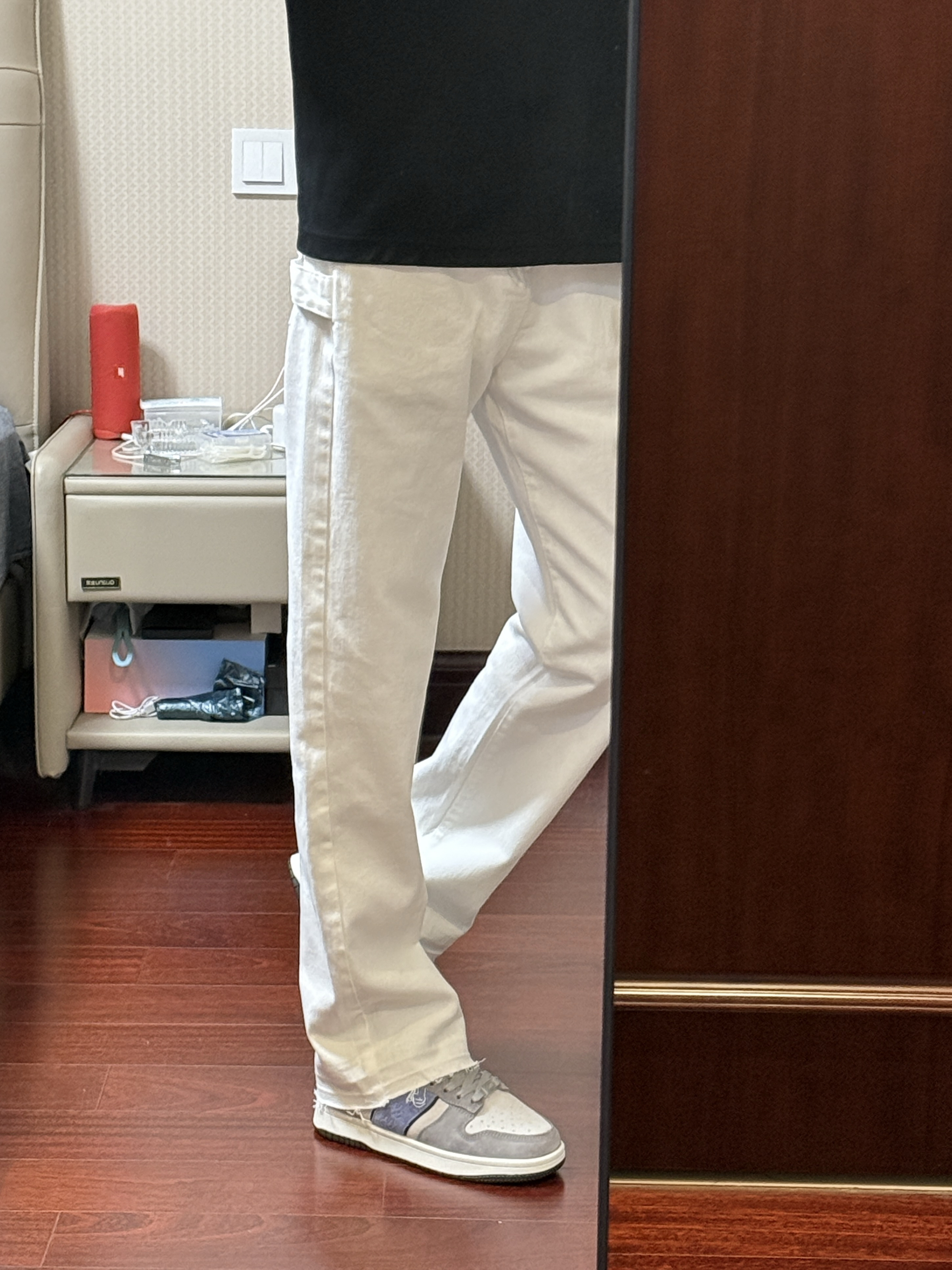 啊啊啊今天这条白色伐木牛仔裤真的太帅了,裤脚毛边很有设计感,修身直筒版型上身显高显瘦显腿长,白色的真的非常百搭,随便搭配下鞋子就很好看,男女同款,谁穿谁酷,我真的太喜欢这条白色牛仔裤了!搭配的kappa这款板鞋也真的很好看,鞋子的颜值非常高,很好搭配衣服,日常穿真的很出街,我真的太爱这双鞋子了!